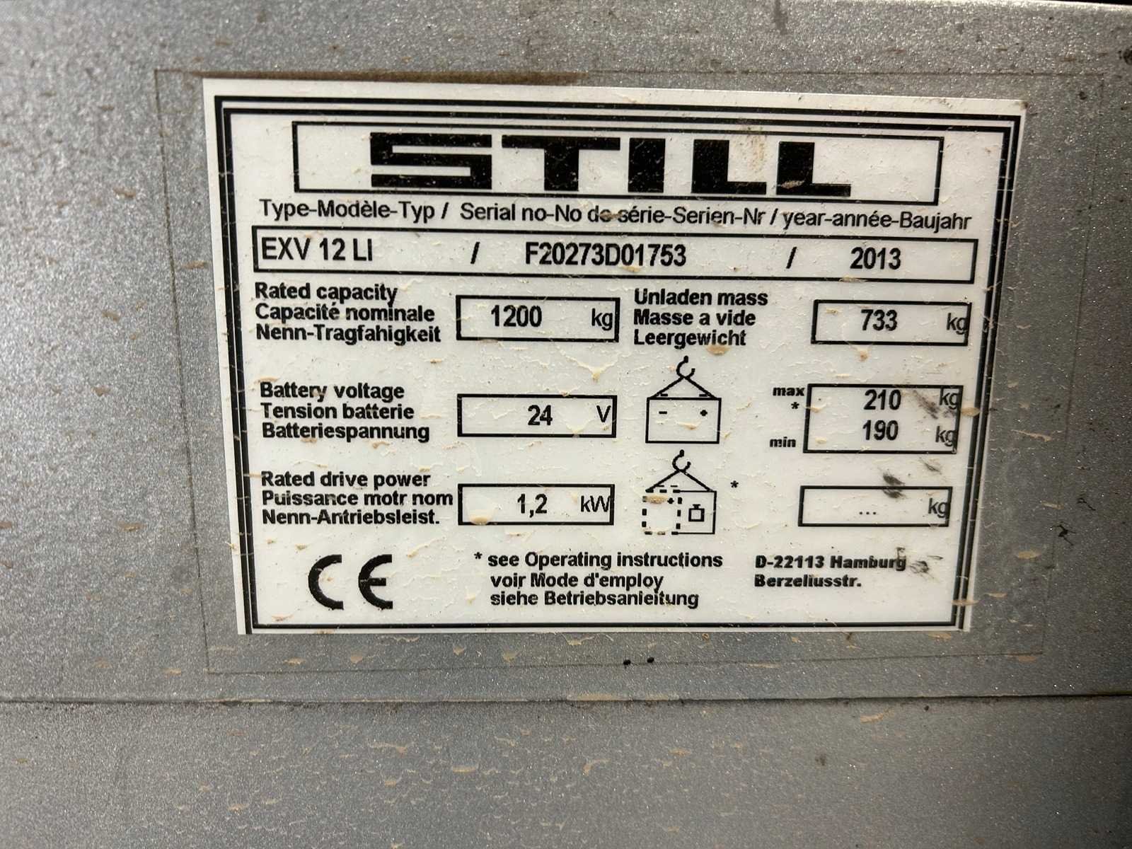 Met basisheffing Nee Merk: Still Type: EXV12LI Bouwjaar: 2013 Serienummer: F20273D01753 Hefvermogen: 1200kg Hefhoogte: 3450mm Lepellengte: 1150mm Afgelezen urenstand: 208