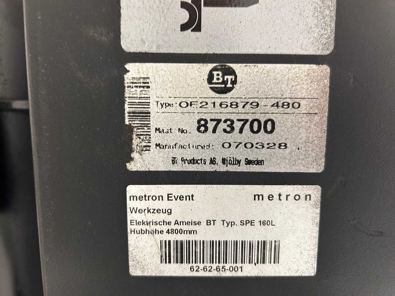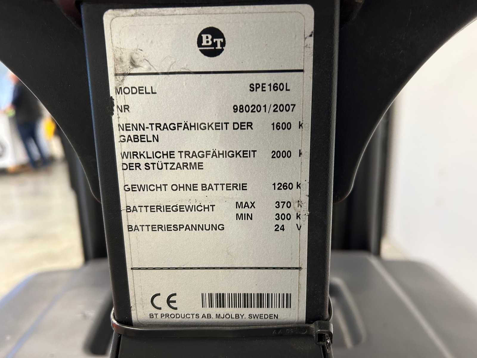 Basisheffing Geen batterij Nee Merk: BT Type: SPE 160 L Bouwjaar: 2007 Serienummer: 980201 Hefvermogen: 1600kg Hefhoogte: 4800mm Lepellengte: 1150mm Afgelezen urenstand: 1605
