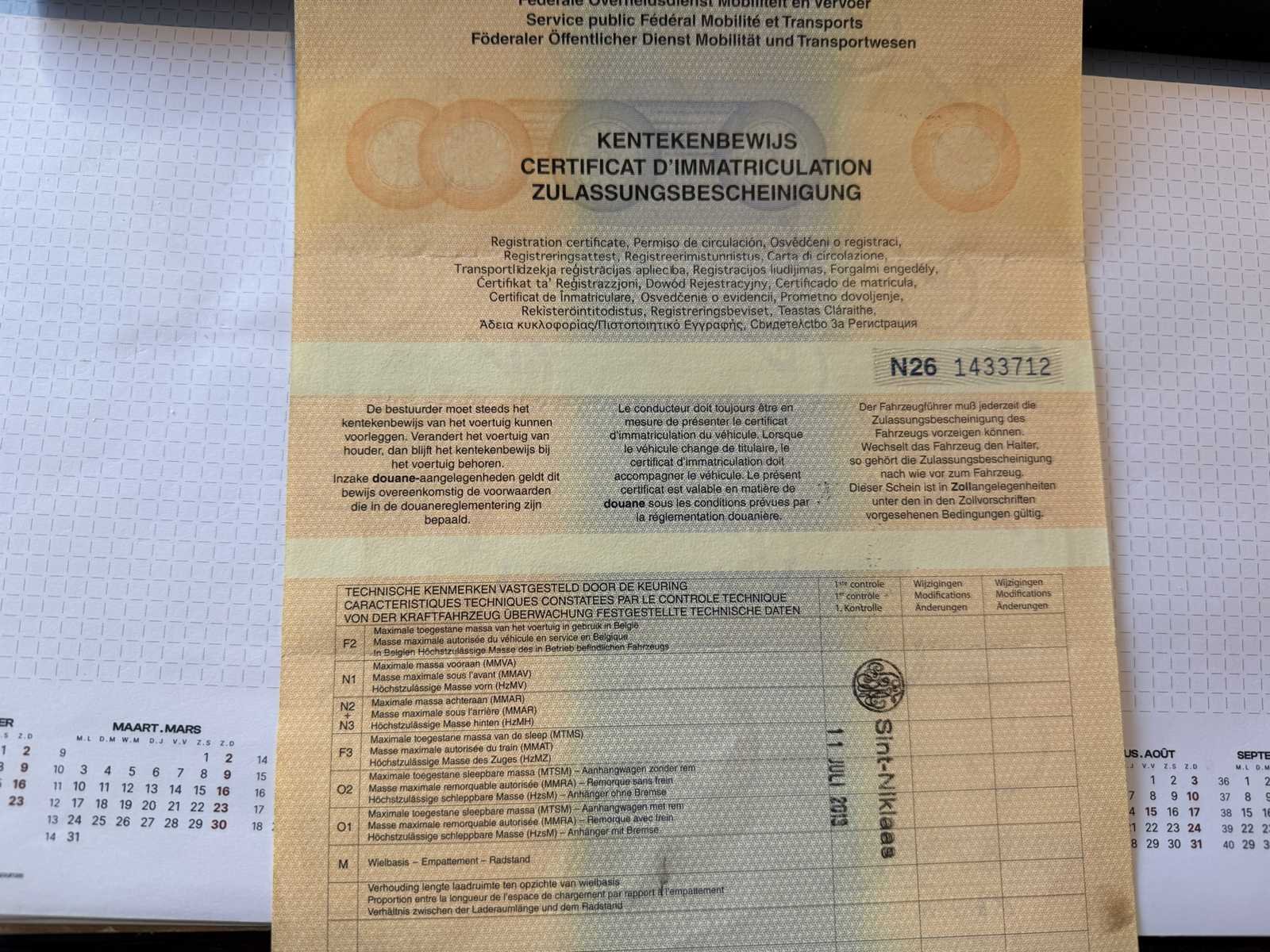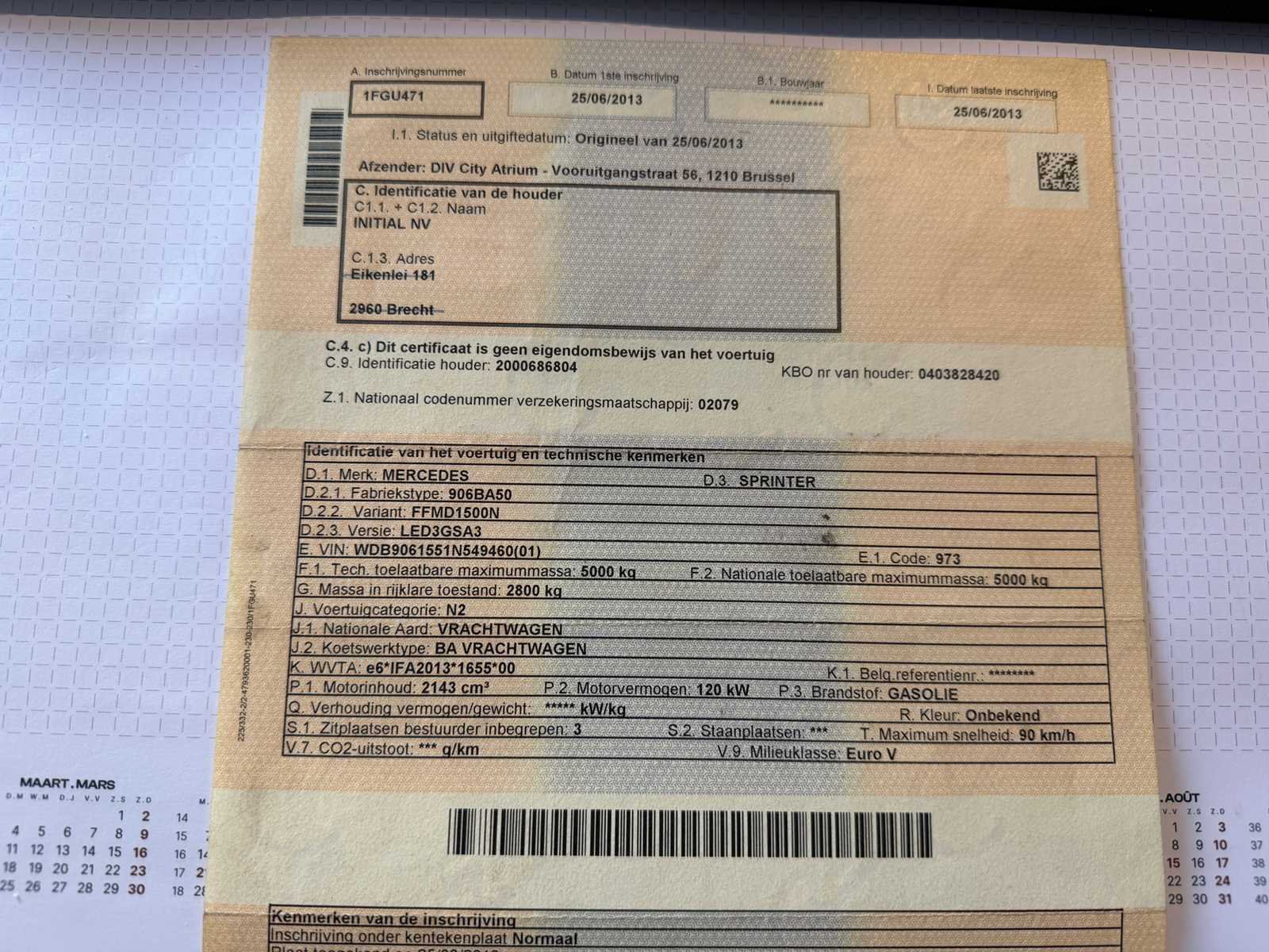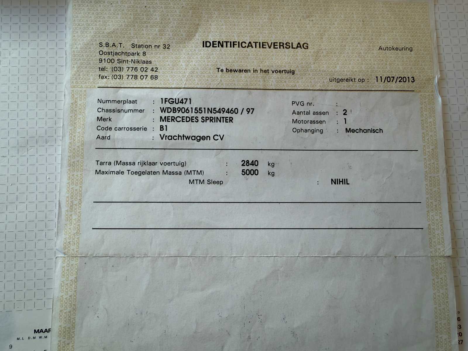 No Merk: Mercedes Type: Sprinter Bouwjaar: 2013 Chassisnummer VIN: WDB9061551N549460/97 Cilinderinhoud: 2143cc Datum eerste toelating: 25/06/2013 Fuel Type: Diesel Emissieklasse: Euro V Eigen gewicht: 2800kg Afgelezen kilometerstand: 364893km Nationaliteit documenten: Belgisch Kentekenpapieren compleet?: true Aantal zitplaatsen: 3 Diesel: true