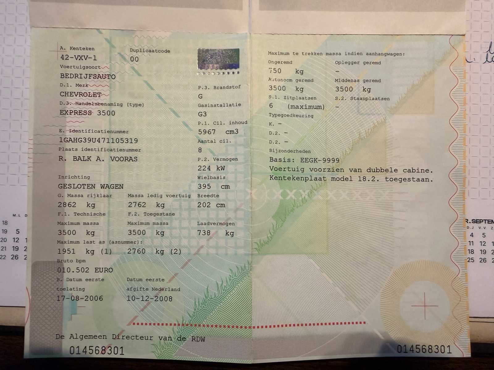 Hier en daar wat carosserieschade, zie foto's Nee Merk: Chevrolet Type: Express 3500 Bouwjaar: 2006 Chassisnummer: 1GAHG39U471105319 Afgelezen kilometerstand: 168671km Cilinderinhoud: 5967cc Vermogen (kW): 224kW Brandstof: LPG Datum eerste toelating: 17/08/2006 Datum eerste toelating (NL): 10/12/2008 Transmissie: automaat Nationaliteit documenten: Nederlands Gasinstallatie: true