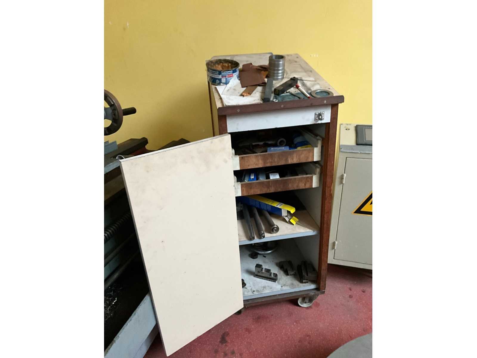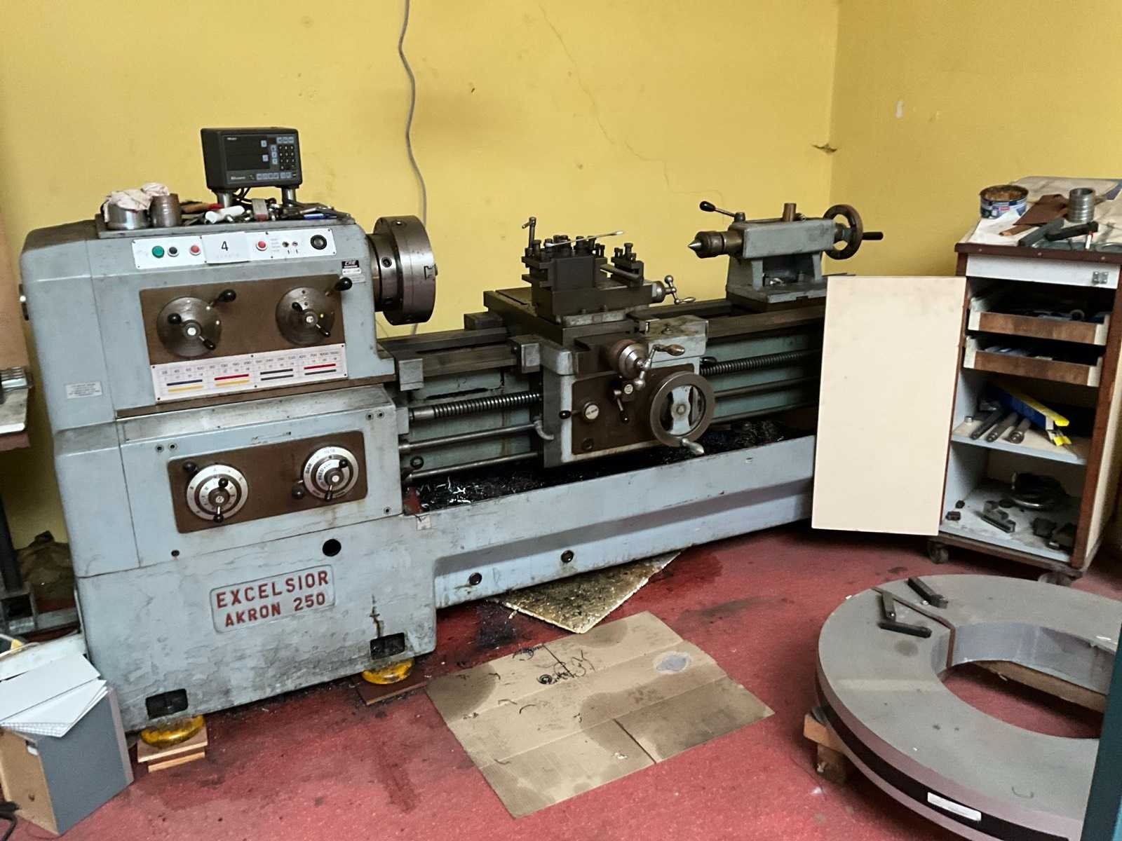 Compleet met enige toebehoren liggende in kast en naast draaibank Non Merk: Excelsior Type: Akron 250 Afmeting l: 1200mm Afmeting b: 3100mm Afmeting h: 1600mm