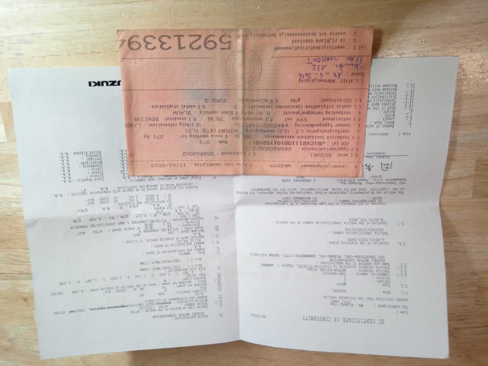 Inschrijvingsbewijs aanwezig, gelijkvormigheidsattest aanwezig Opmerking: Moto heeft probleem met koeling + kuipschade voor aan rechts restauratieproject . Nee Merk: suzuki Model: gsx r 600 Chassisnummer: JS1CV211100101152 Cilinderinhoud: 600cc Datum eerste toelating: 11/01/2010 Vermogen (kW): 78kW Aantal sleutels: 2 Boorddocumenten aanwezig?: true Startinformatie: JA Bouwjaar: 2010