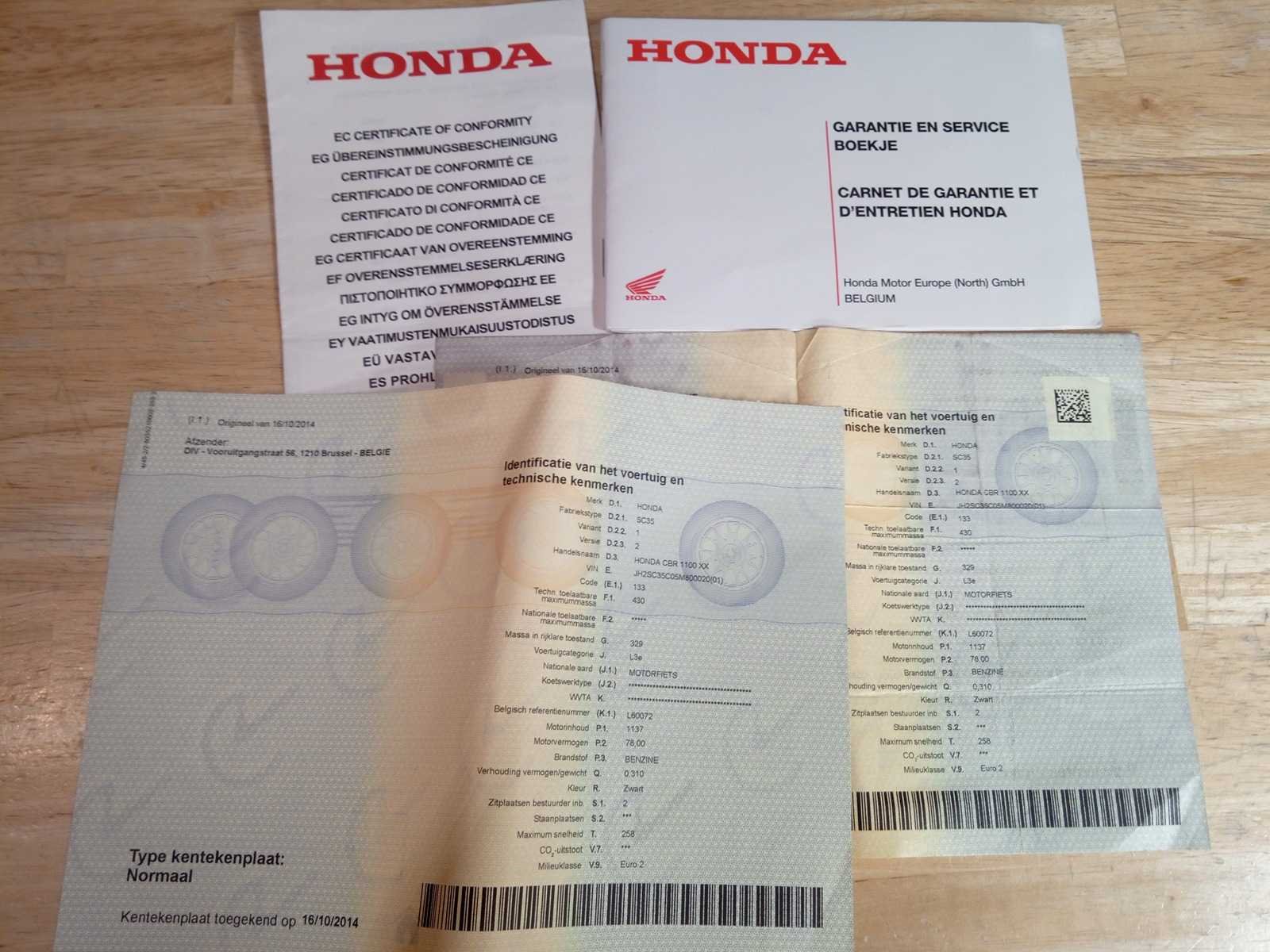 Inschrijvingsbewijs deel 1&2 aanwezig, gelijkvormigheidsattest aanwezig . Nee Merk: honda Model: cbr 1000 xx Chassisnummer: JH2SC35C05M800020 Cilinderinhoud: 1100cc Datum eerste toelating: 20/04/2005 Vermogen (kW): 78kW Afgelezen kilometerstand: 35600km Boorddocumenten aanwezig?: true Aantal sleutels: 1 Startinformatie: JA Bouwjaar: 2005