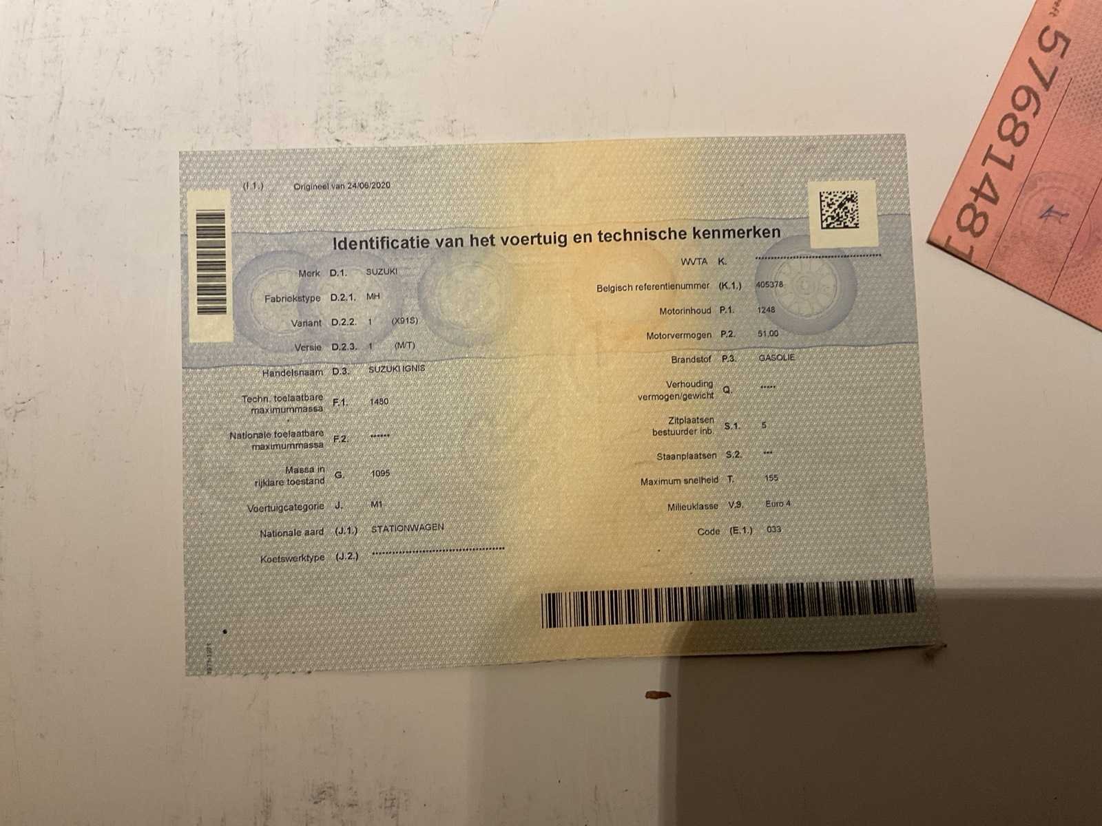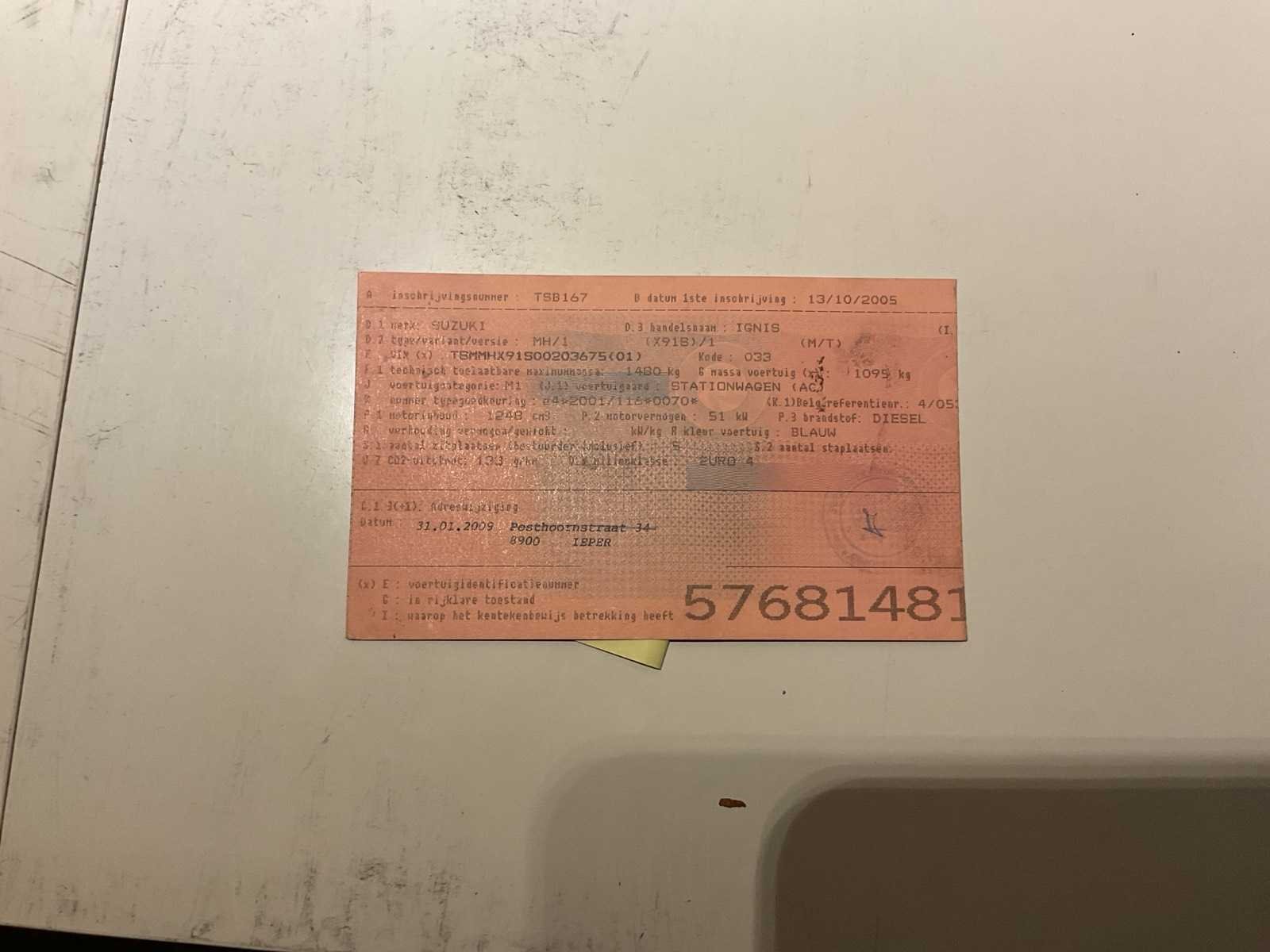 Voertuig wordt verkocht zoals gezien zonder enige vorm van garantie start maar rijdt niet koppeling kapot deel 2 ontbreekt van de inschrijving Nee Merk: Suzuki Model: Ignis Bouwjaar: 2005 Afgelezen kilometerstand: 189000km Cilinderinhoud: 1248cc Vermogen (kW): 51kW Brandstof: diesel Chassisnummer: tsmmhx91s00203675 Aantal zitplaatsen: 5 Transmissie: manual Emissieklasse: 4 Aantal deuren: 5 Aantal sleutels: 1 Nationaliteit documenten: belgie Gelijkvormigheidsattest aanwezig: true No self drive export!: true Inschrijvingsbewijs - deel 1 : ok Inschrijvingsbewijs - deel 2: no