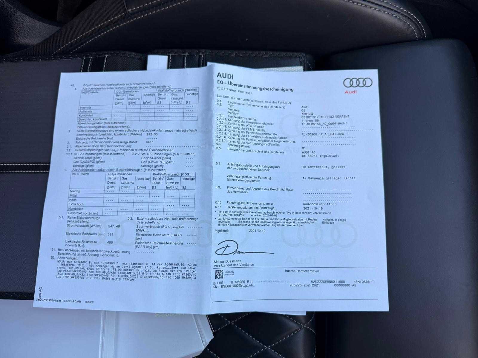 Nee Type: E-tron 55 GE Bouwjaar: 2021 Afgelezen kilometerstand: 48000km Vermogen (kW): 300kW Brandstof: elektrisch Chassisnummer: S284255658 Kleur: Zwart Aantal deuren: 5 Aantal sleutels: 2 Nationaliteit documenten: Belgisch Gelijkvormigheidsattest aanwezig: true Start en rijdt: Ja