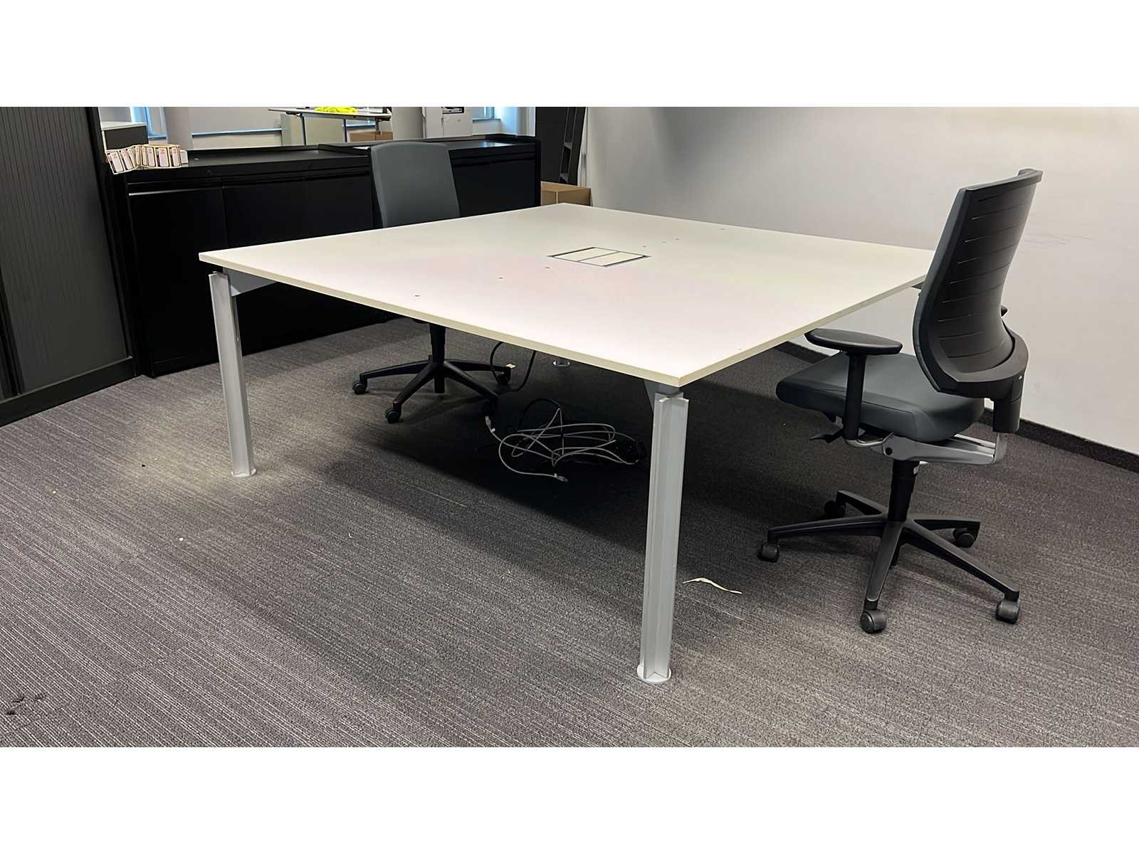 Bulo H20 2persoons wit melamine workbench met 2 kabeldoorvoeren inclusief 2 bureaustoelen Klöber Met gebruikssporen, staat kan variëren per item. Nee Merk: BULO Model: H2o Lengte: 180cm Breedte: 180cm