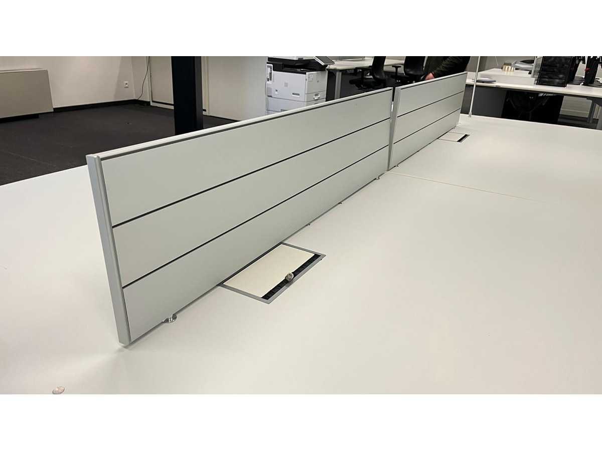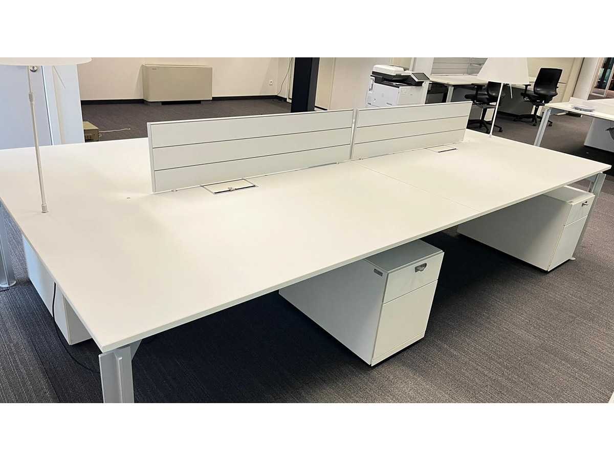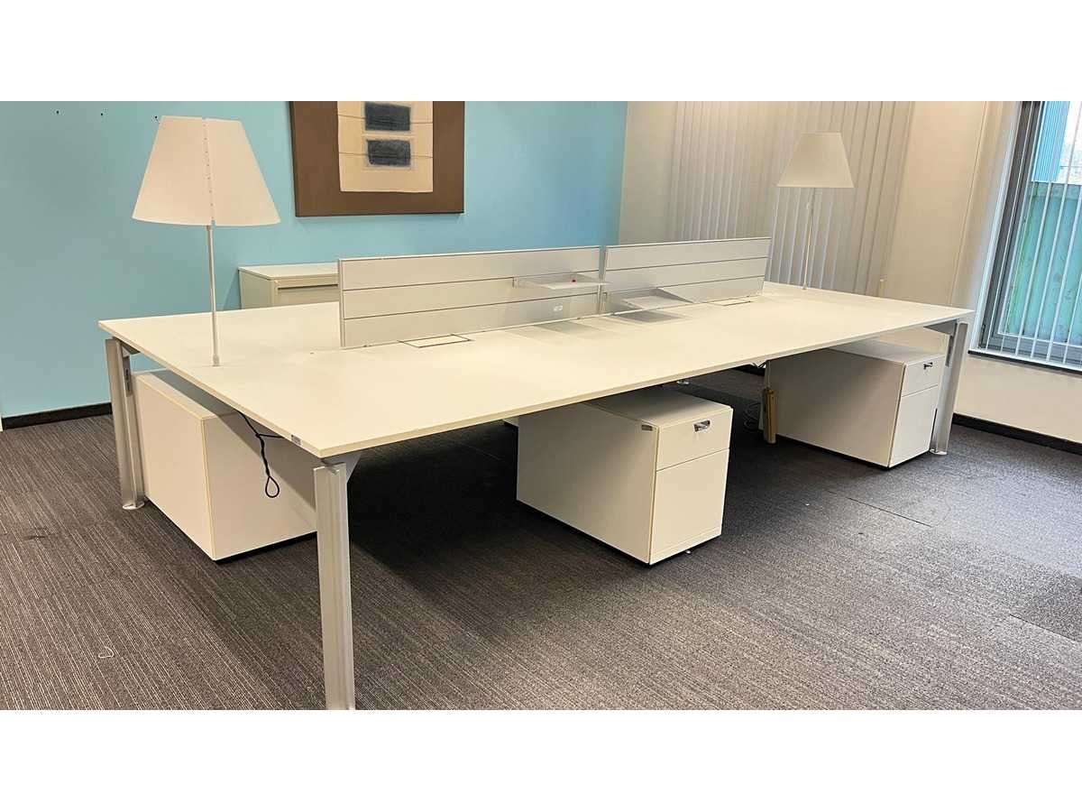 Complete set bestaande uit : 1 X Bulo H2o 4-persoons wit melamine workbench met 2 kabeldoorvoeren + 4x Bulo ladeblokken met hangmapsysteem en pennelades + 2x Luceplan Costanza lampen, 2x aluminium tussenpanelen Met gebruikssporen, staat kan variëren per item. Nee Merk: BULO Type: H20 -4 persoons Model: h2o Kleur: Wit Gewicht: 150kg Lengte: 360cm Breedte: 180cm