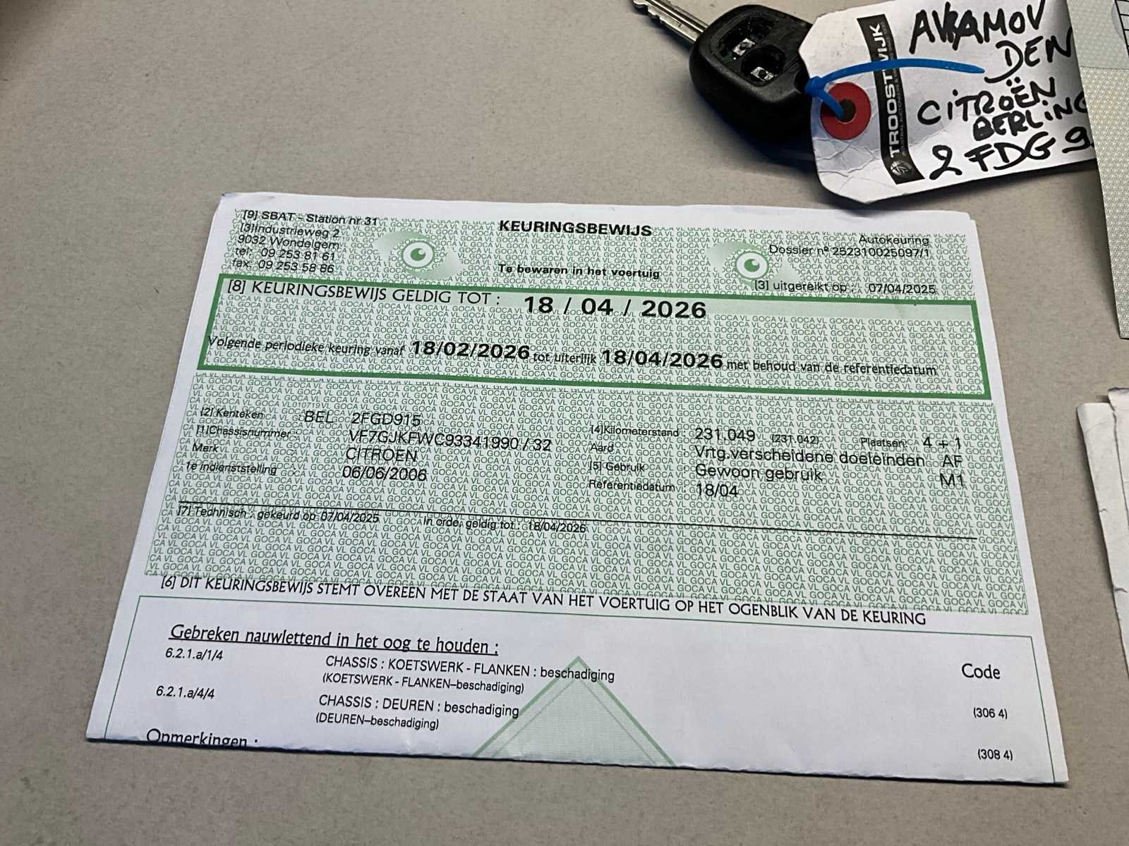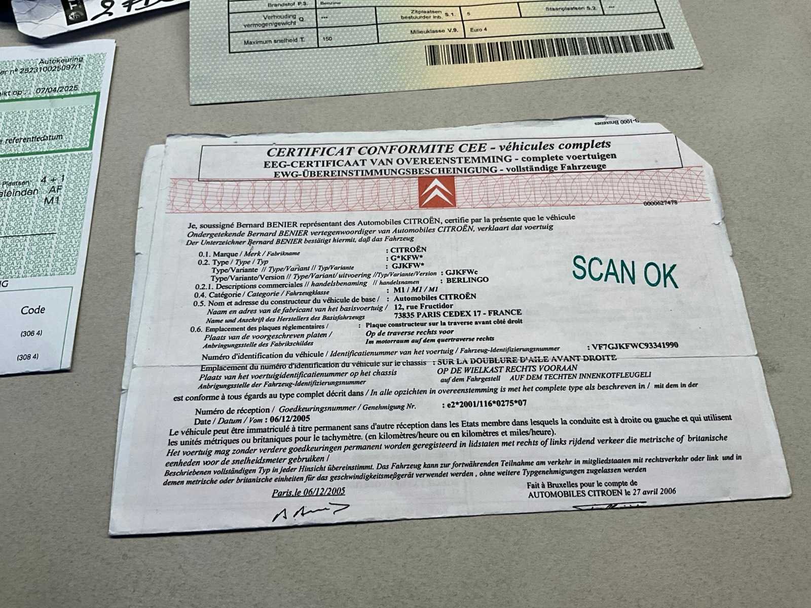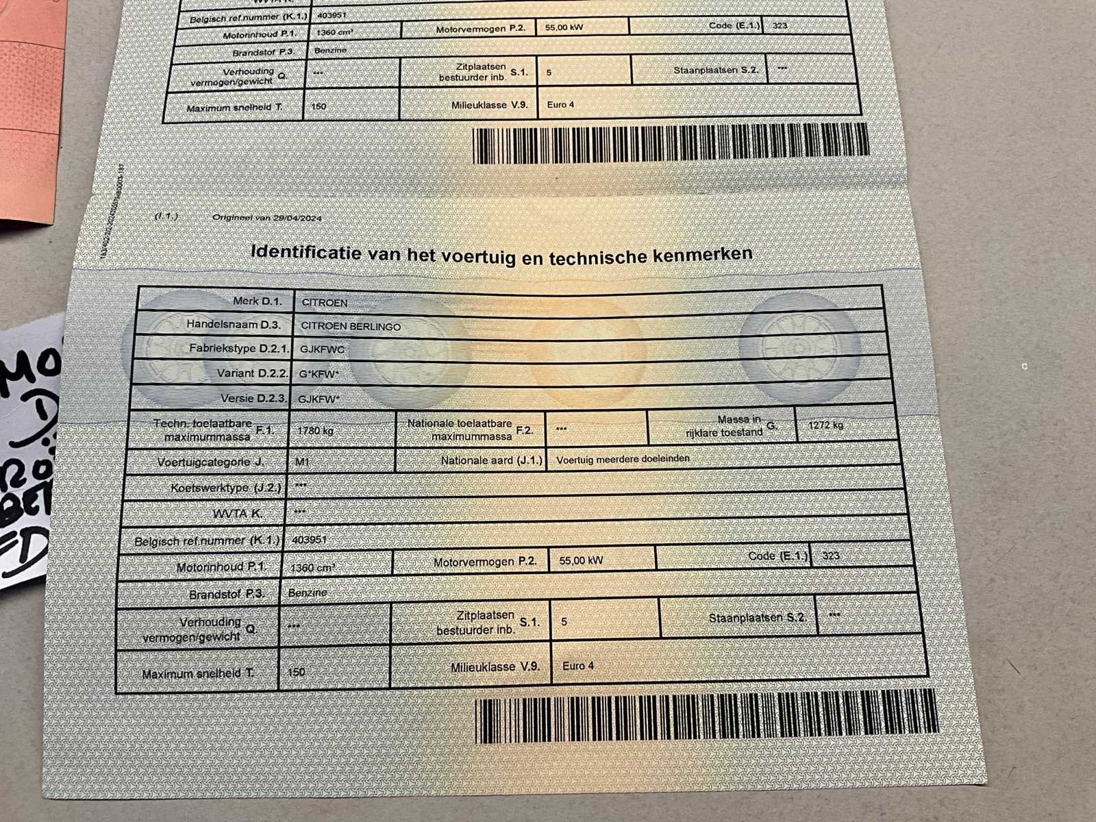 Aanwezige boorddocumenten: keuringsbewijs, inschrijvingsbewijs deel I en II, conformiteitscertificaat Nee Merk: Citroën Type: Berlingo Bouwjaar: 2006 Afgelezen kilometerstand: 240206km Cilinderinhoud: 1360cc Vermogen (kW): 55kW Brandstof: benzine Chassisnummer: VF7GJKFWC93341990 Datum eerste toelating: 06/06/2006 Transmissie: Handgeschakeld Emissieklasse: Euro4 Aantal deuren: 4 Aantal sleutels: 1 Nationaliteit documenten: Belgisch Gelijkvormigheidsattest aanwezig: true Start en rijdt: Start mits boosten Keuringsrapport geldig tot: 18/04/2026 startinformatie : Start en rijdt(booster) Zichtbare schade: Zie foto’s Vavato voert geen technische keuring uit.: true Inschrijvingsbewijs - deel 1 : Aanwezig Inschrijvingsbewijs - deel 2: Aanwezig