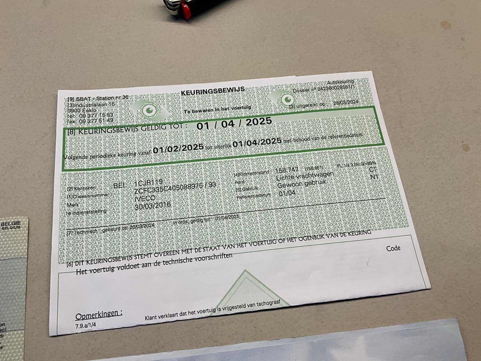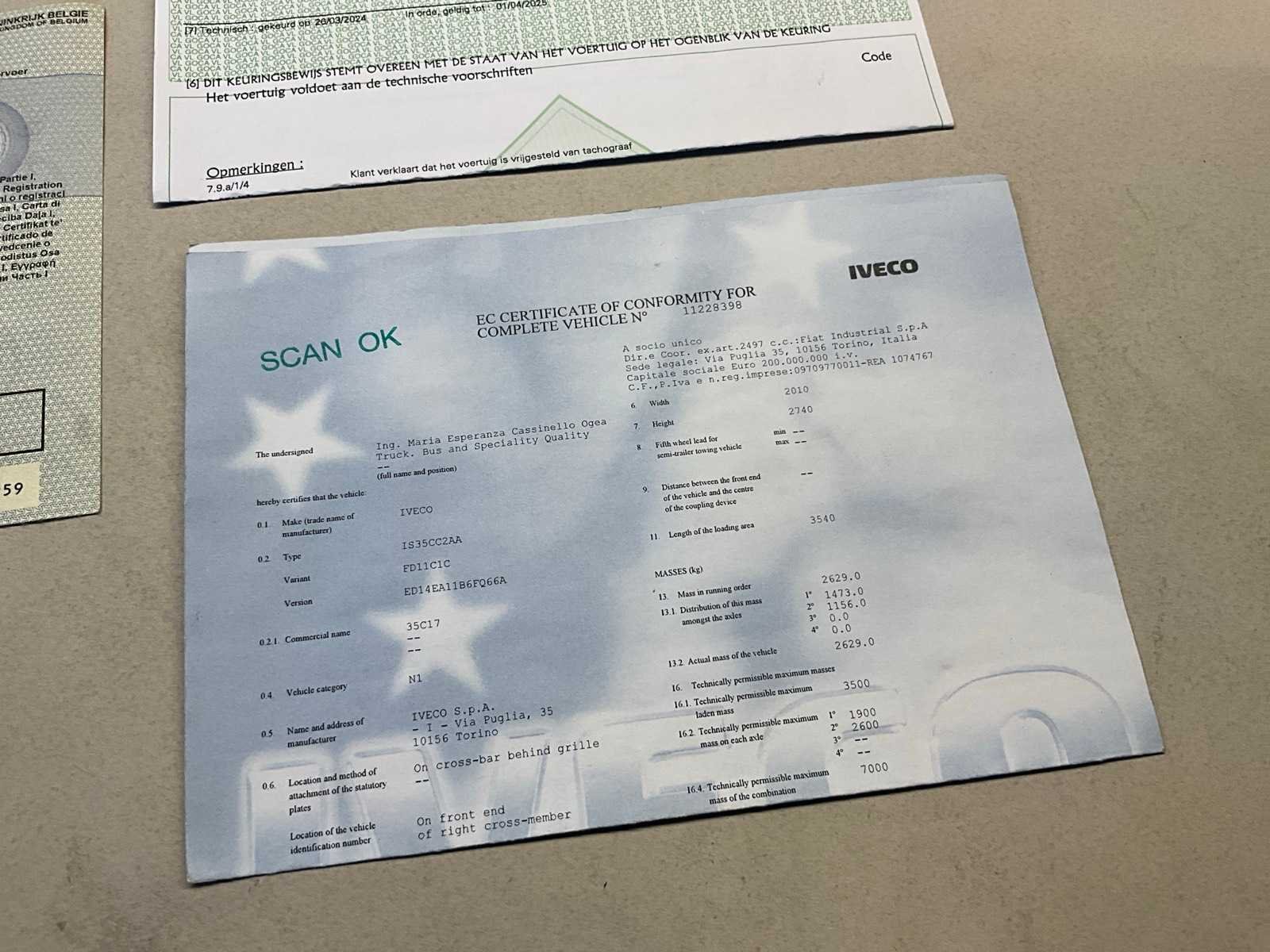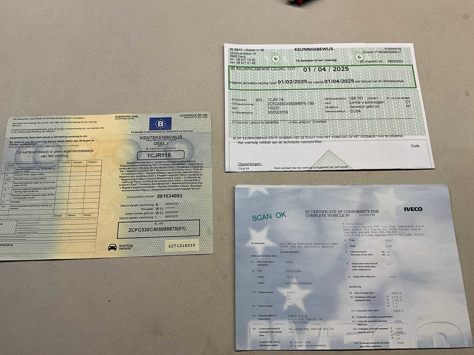 Aanwezige boorddocumenten:gelijkvormigheidsattest, keuringsbewijs, inschrijvingsbewijs deel I, compleet met inhoud Nee Merk: Iveco Type: IS35CC2AA Bouwjaar: 2016 Cilinderinhoud: 2998cc Vermogen (kW): 125kW Brandstof: Diesel Chassisnummer: ZCFC335C405088975 Datum eerste toelating: 30/03/2016 Aantal zitplaatsen: 3 Transmissie: Handgeschakeld Emissieklasse: Euro5 Aantal deuren: 4 Aantal sleutels: 2 Nationaliteit documenten: Belgisch Gelijkvormigheidsattest aanwezig: true Start en rijdt: Ja Keuringsrapport geldig tot: 01/04/2025 startinformatie : Start maar rijdt niet Vavato voert geen technische keuring uit.: true Inschrijvingsbewijs - deel 1 : Aanwezig Inschrijvingsbewijs - deel 2: Niet aanwezig