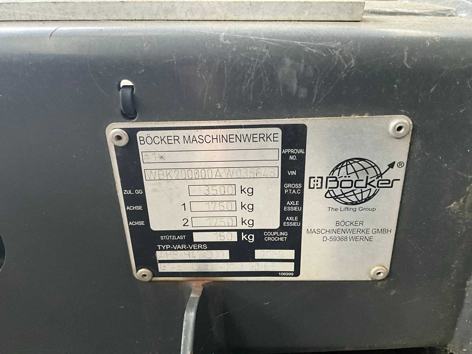ZONDER metalen schepbak Böcker, compleet met pallethaak BÖCKER PH600A Nee Merk: Bocker Type: AHK30/1600 Bouwjaar: 2011 Chassisnummer: WBK200000AW035648 Aantal assen: 2 Datum eerste toelating: 04/03/2011 Nationaliteit documenten: Belgisch