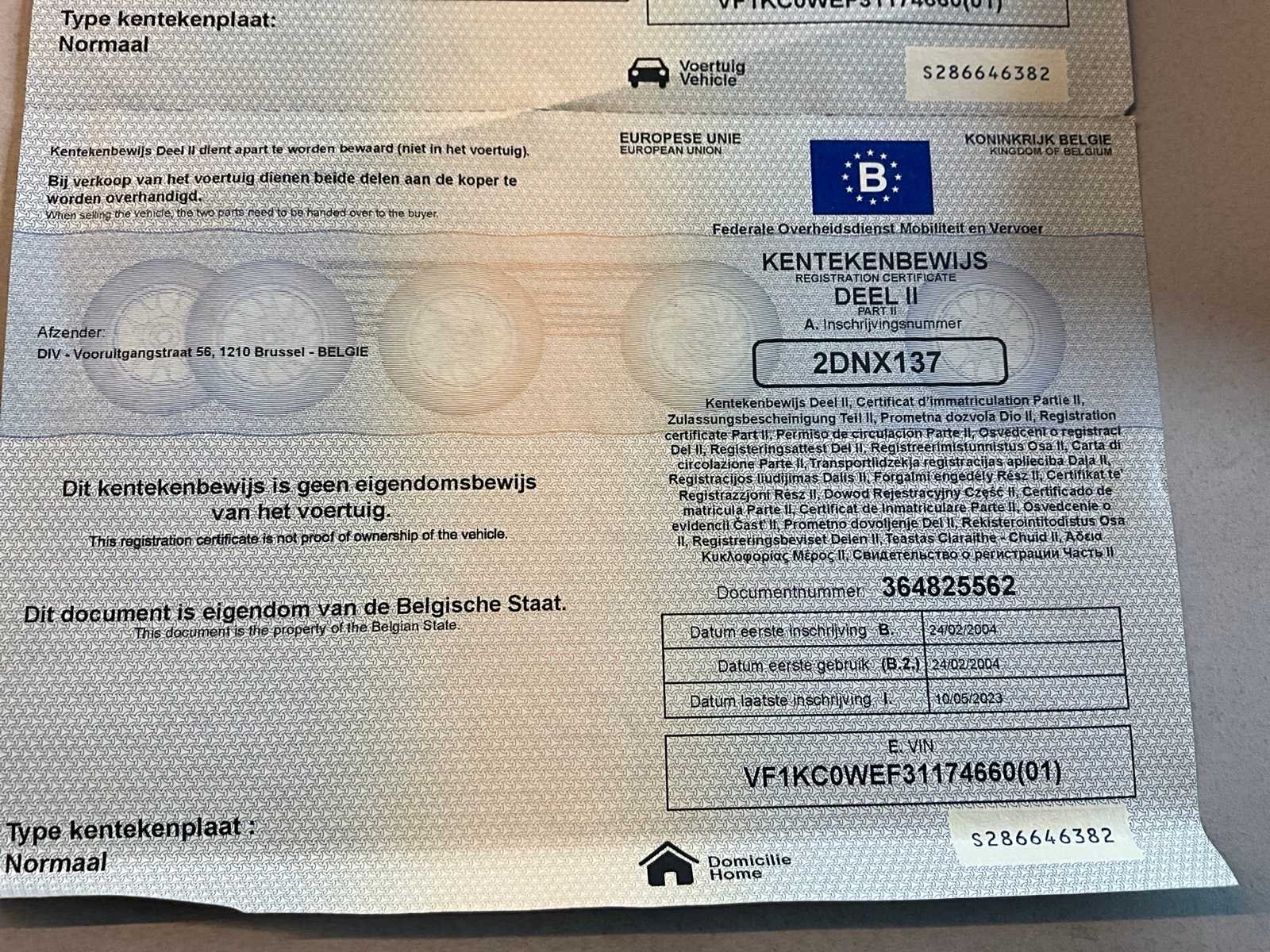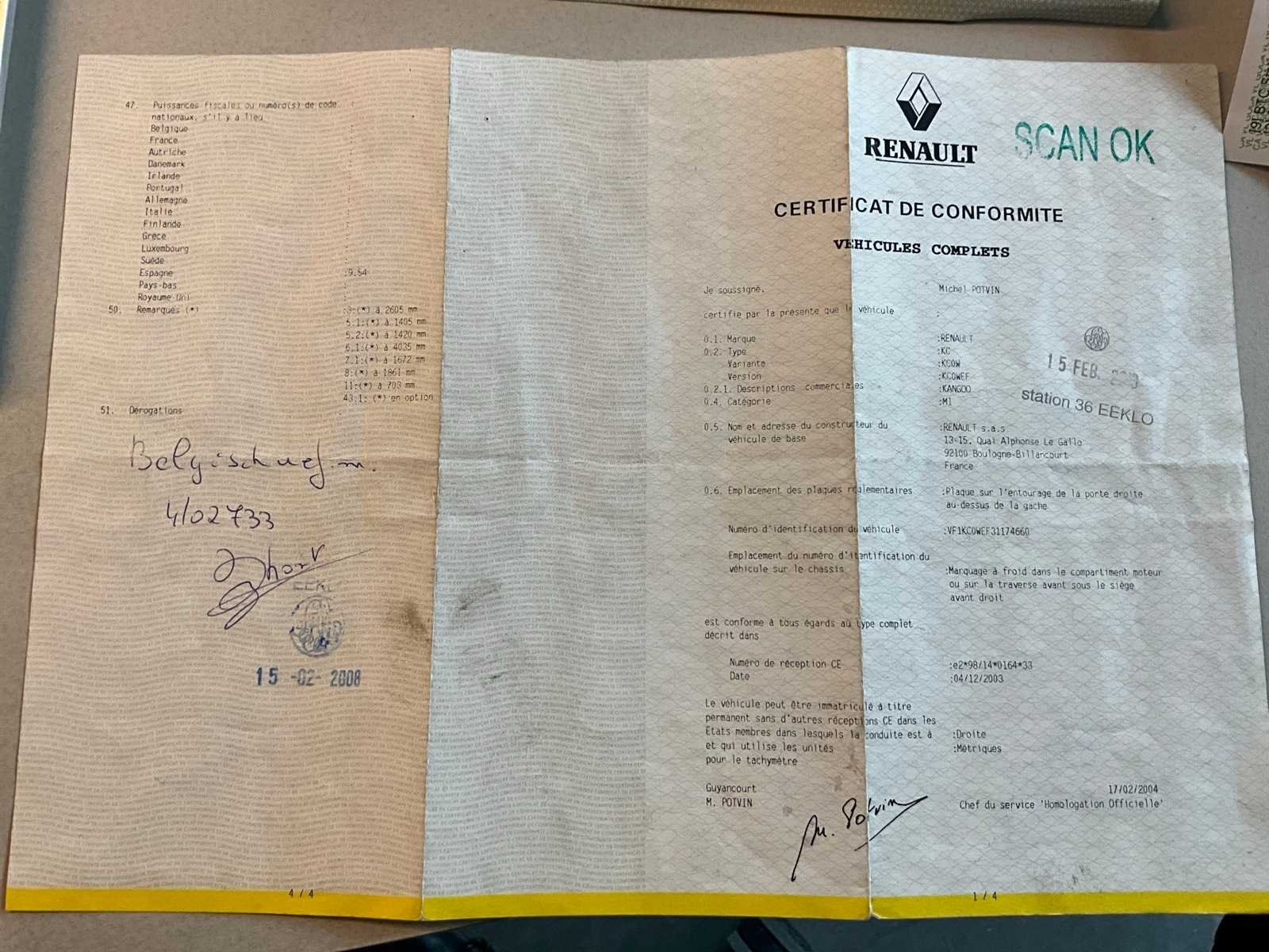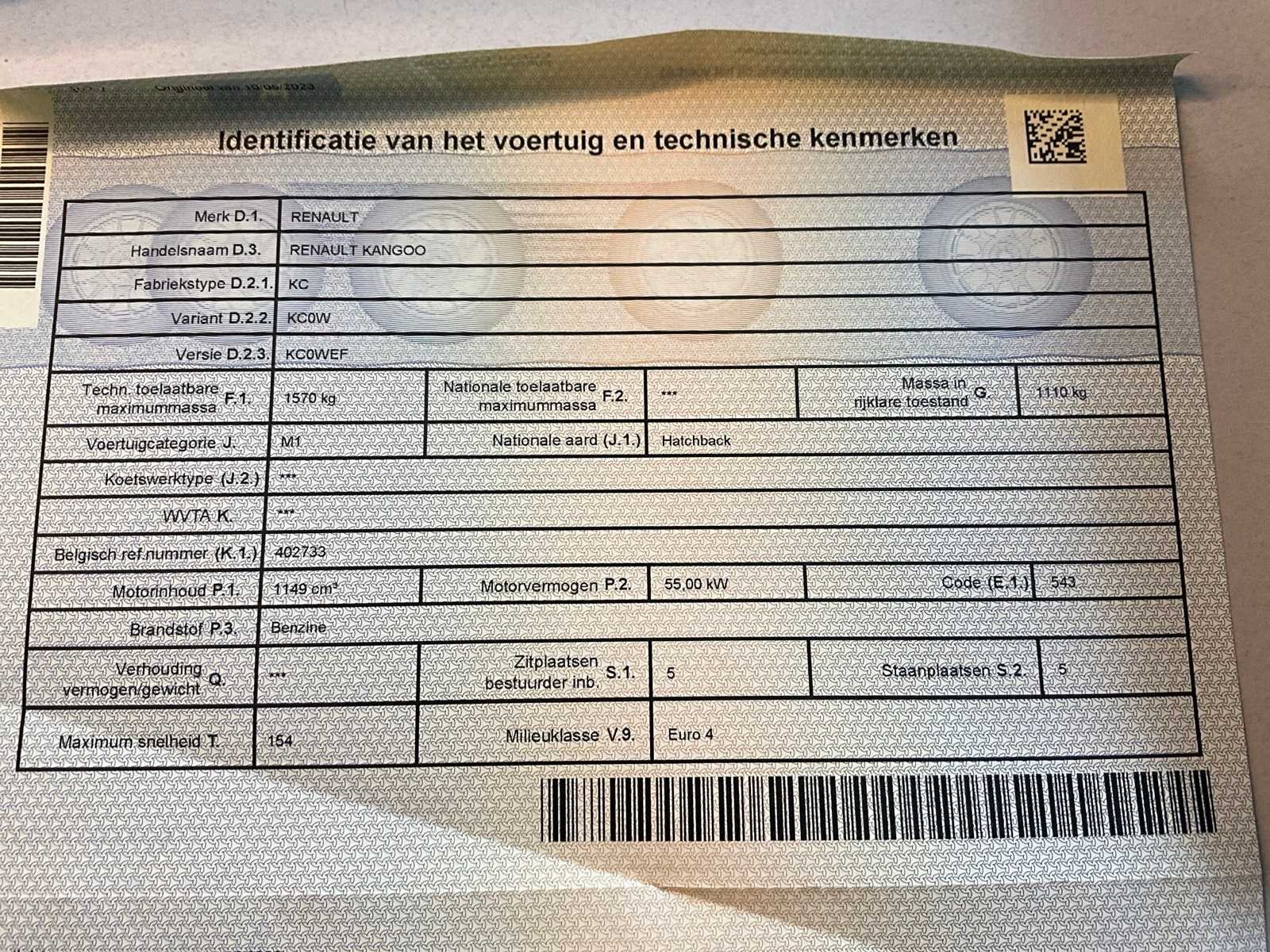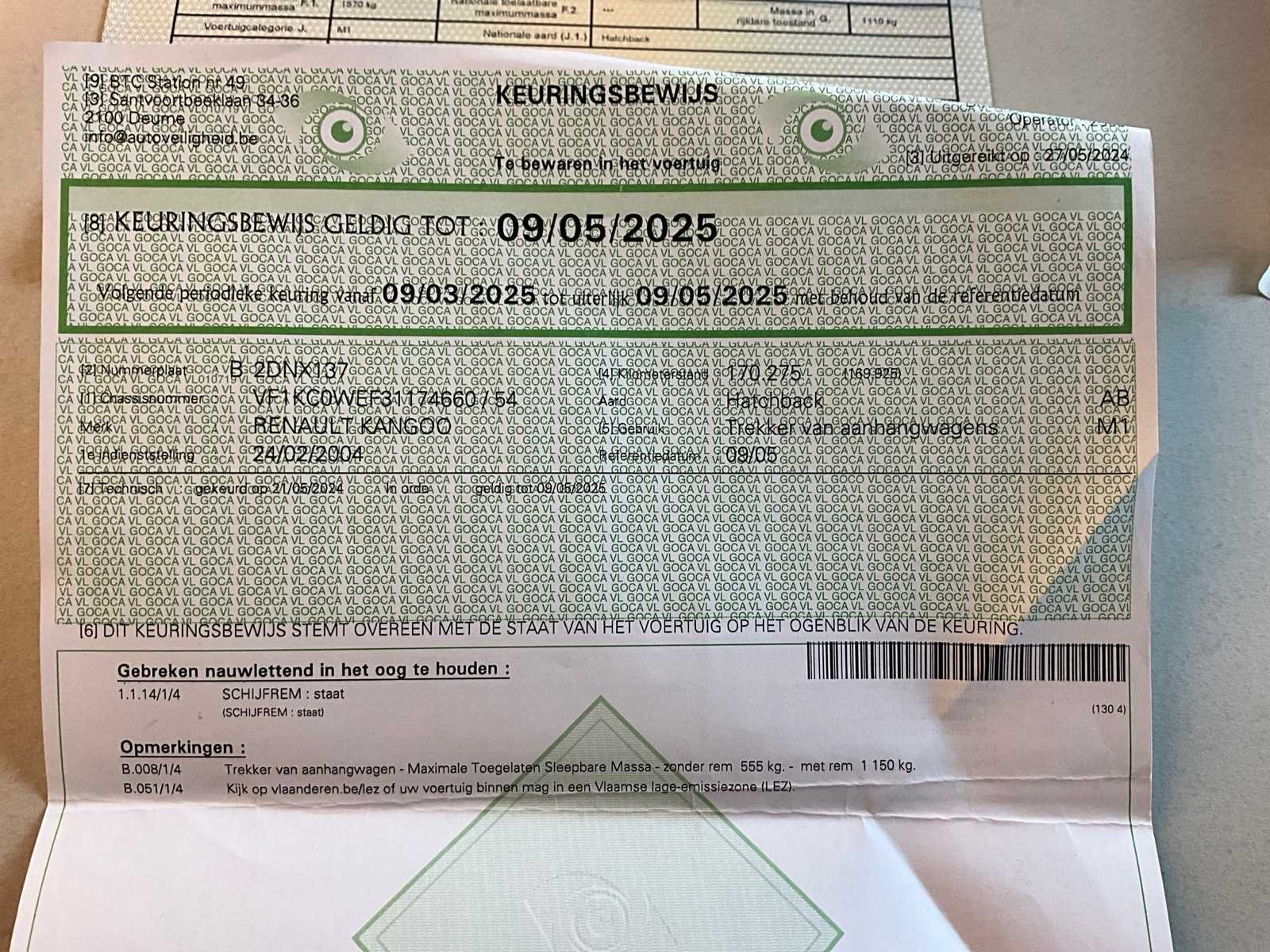 Start niet. Band linksachter plat. Nee Merk: Renault Model: Kangoo Type: Kangoo Bouwjaar: 2004 Cilinderinhoud: 1149cc Vermogen (kW): 55kW Brandstof: benzine Tellerstand niet afleesbaar: true Chassisnummer: VF1KC0WEF31174660 Datum eerste toelating: 24/2/2004 Transmissie: Handgeschakeld Emissieklasse: Euro 4 Aantal sleutels: 1 Nationaliteit documenten: België Gelijkvormigheidsattest aanwezig: true Carpass: true Start en rijdt: Nee Keuringsrapport geldig tot: 9/5/2025 Vavato voert geen technische keuring uit.: true Inschrijvingsbewijs - deel 1 : Aanwezig Inschrijvingsbewijs - deel 2: Aanwezig