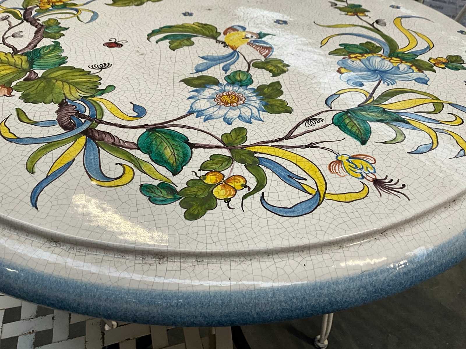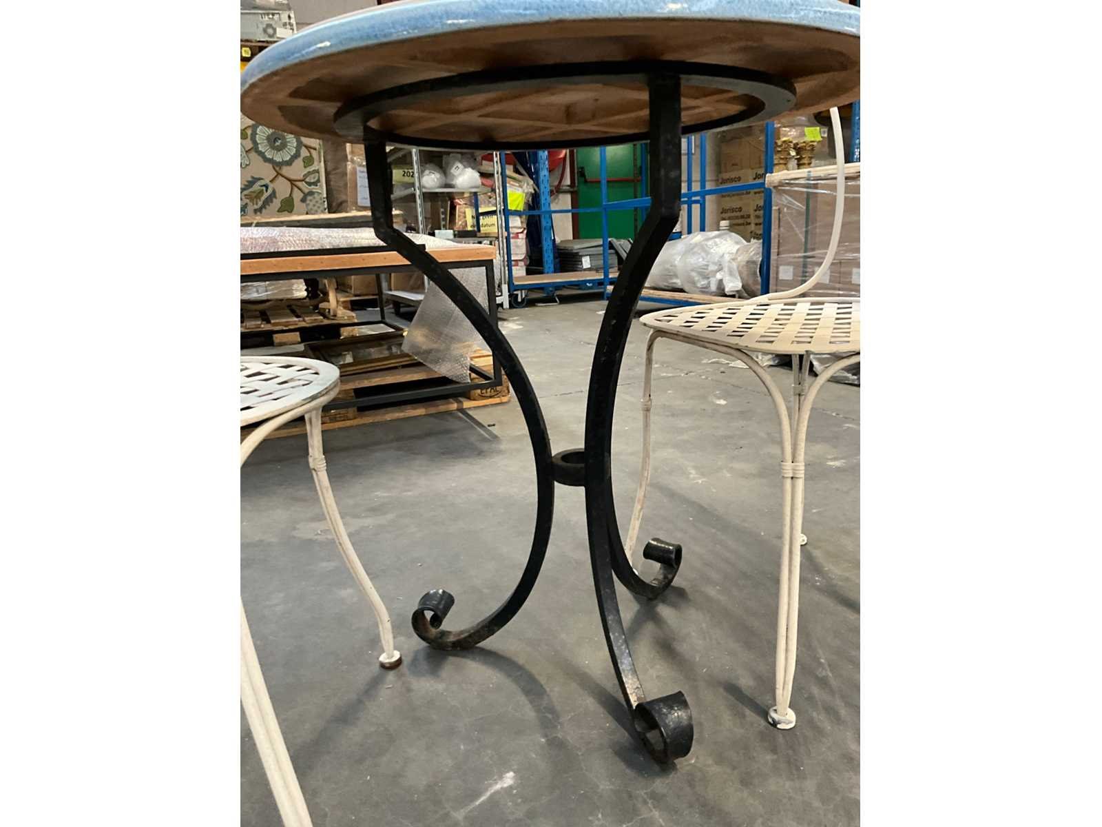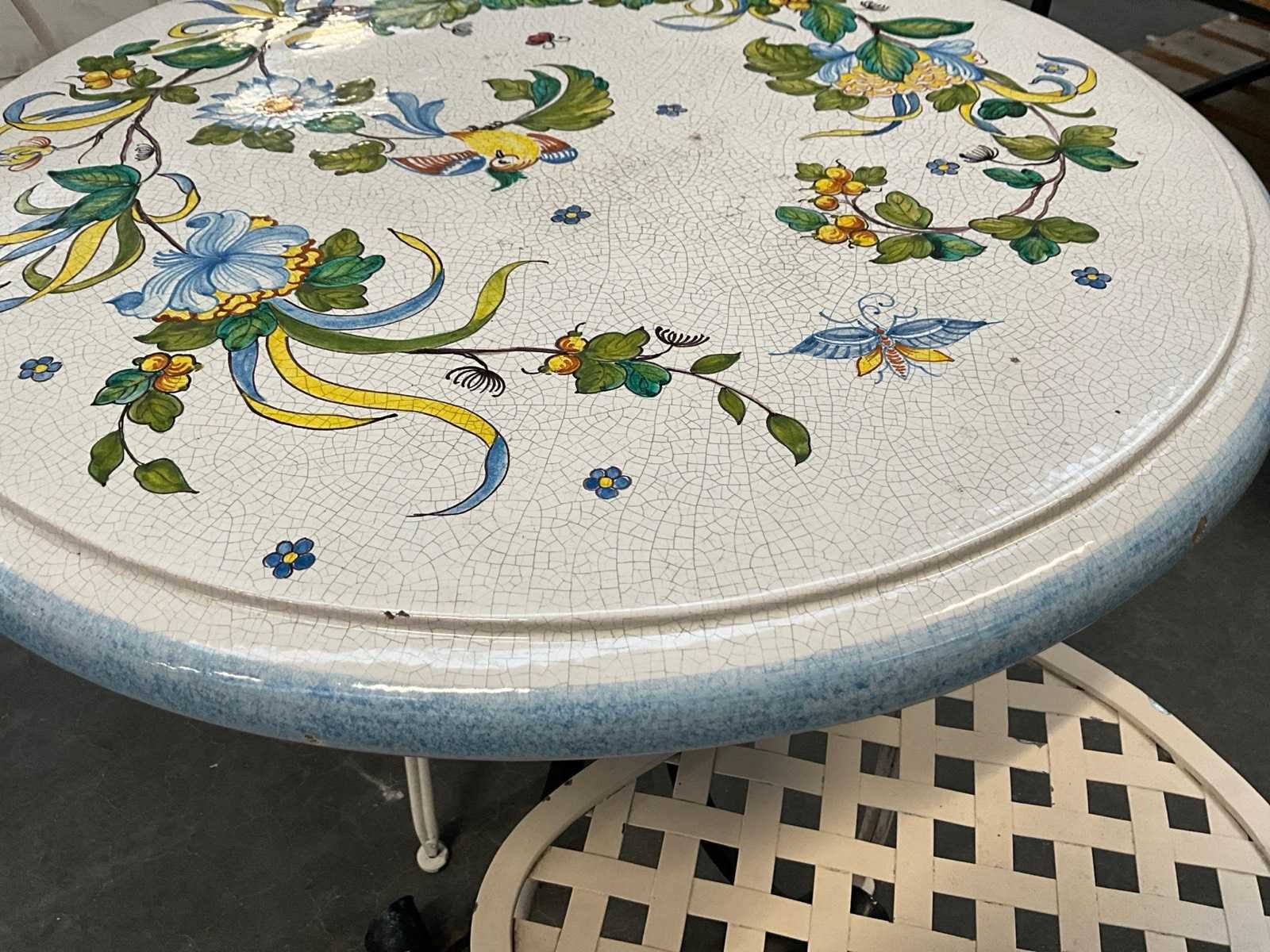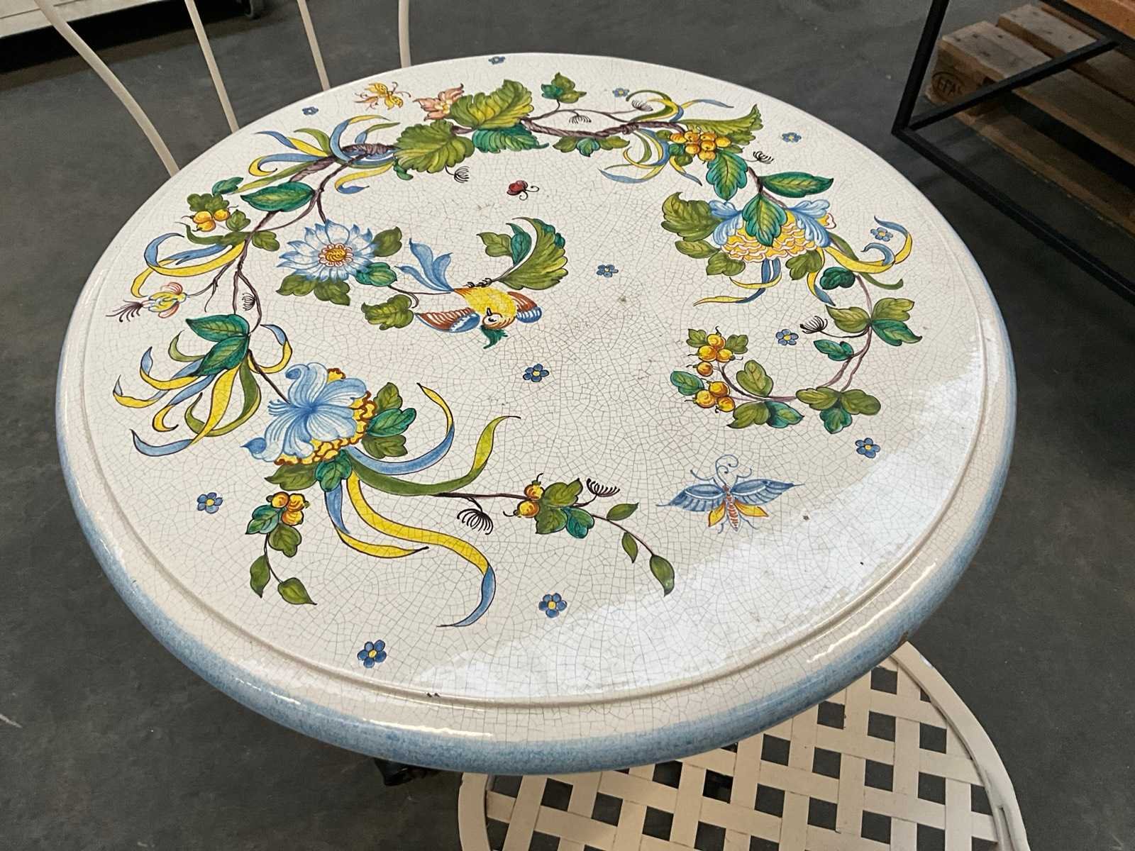 Voorzien van handbeschilderd lavasteen blad, smeedijzeren onderstel, 2x metalen stoel Nee