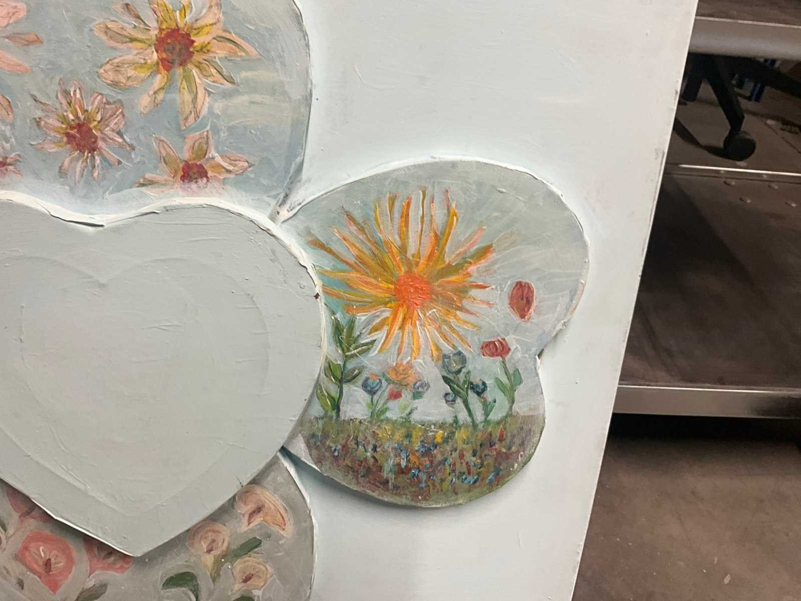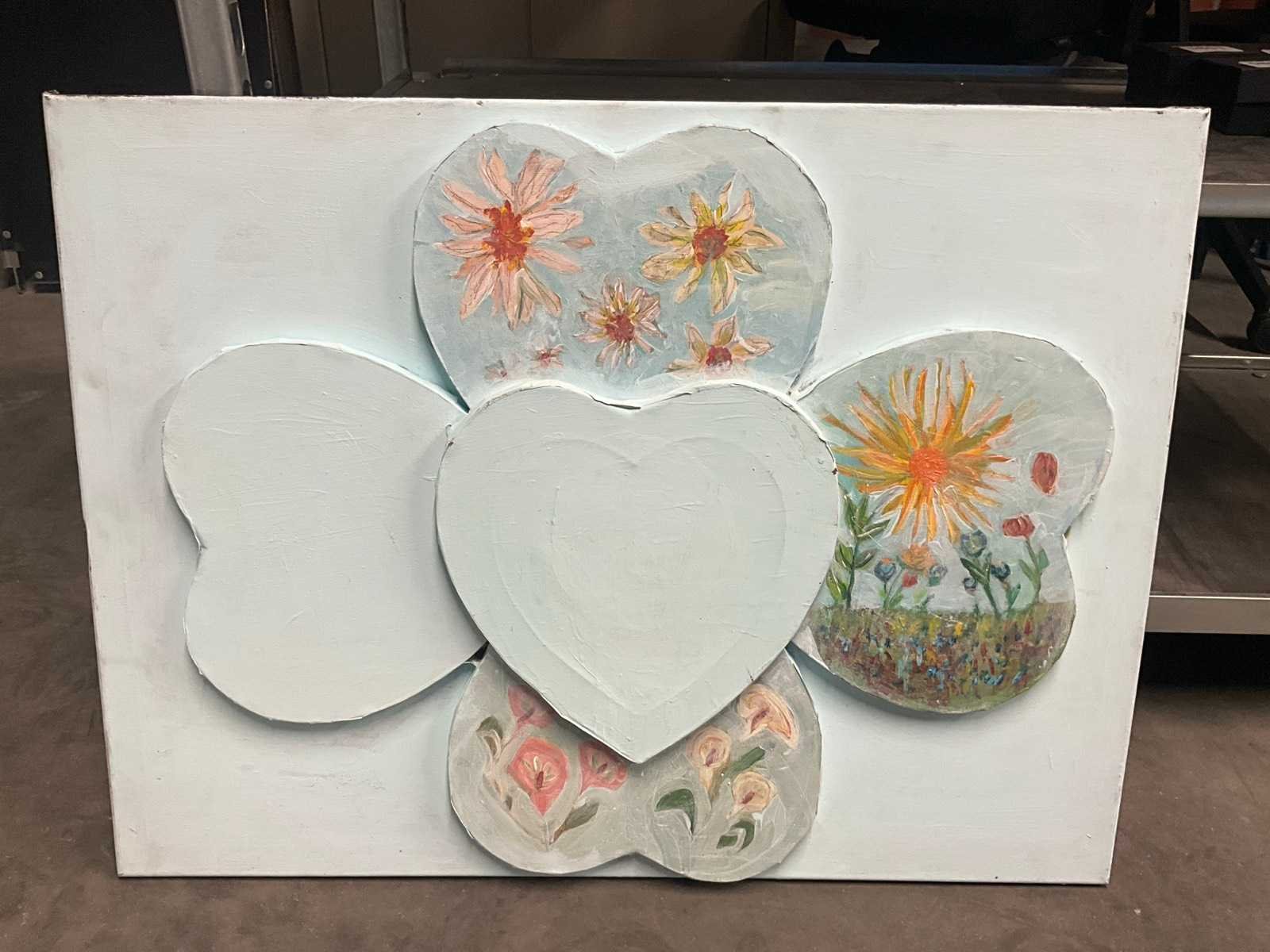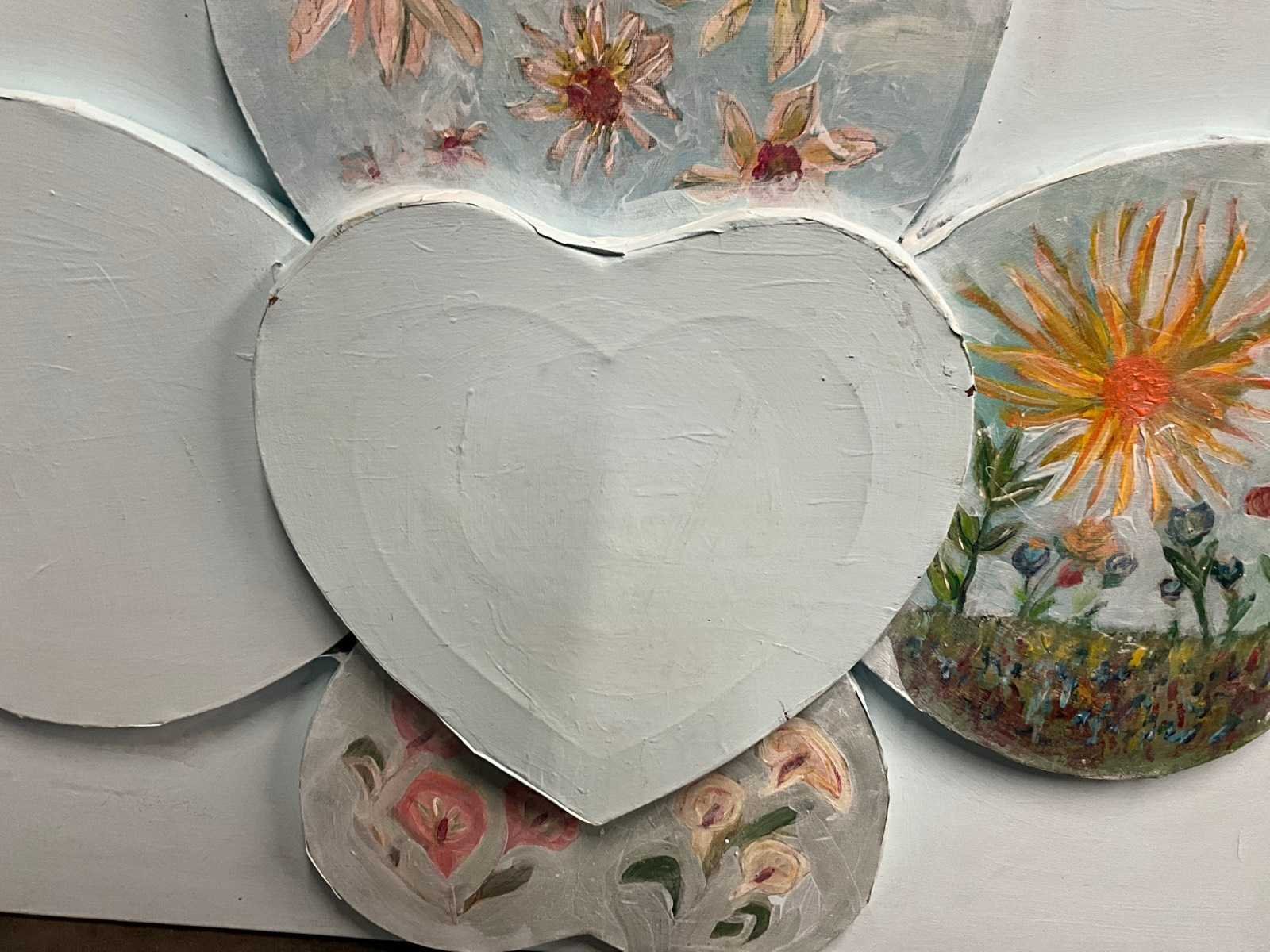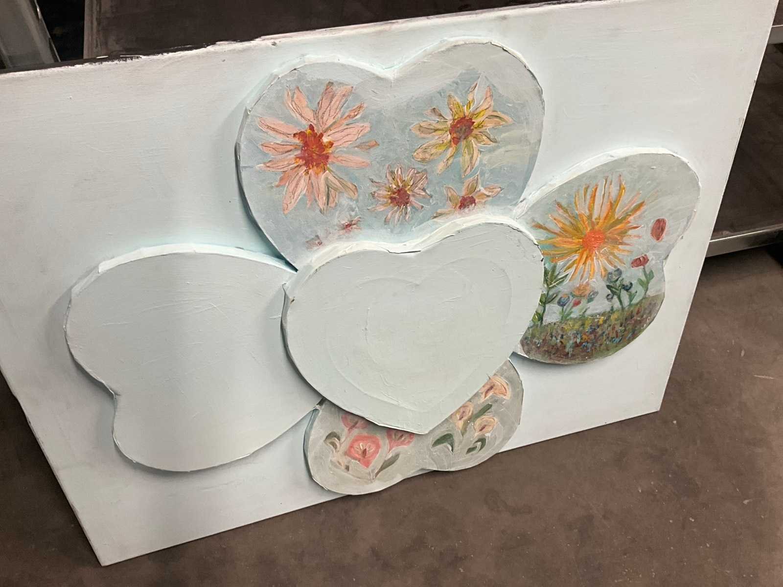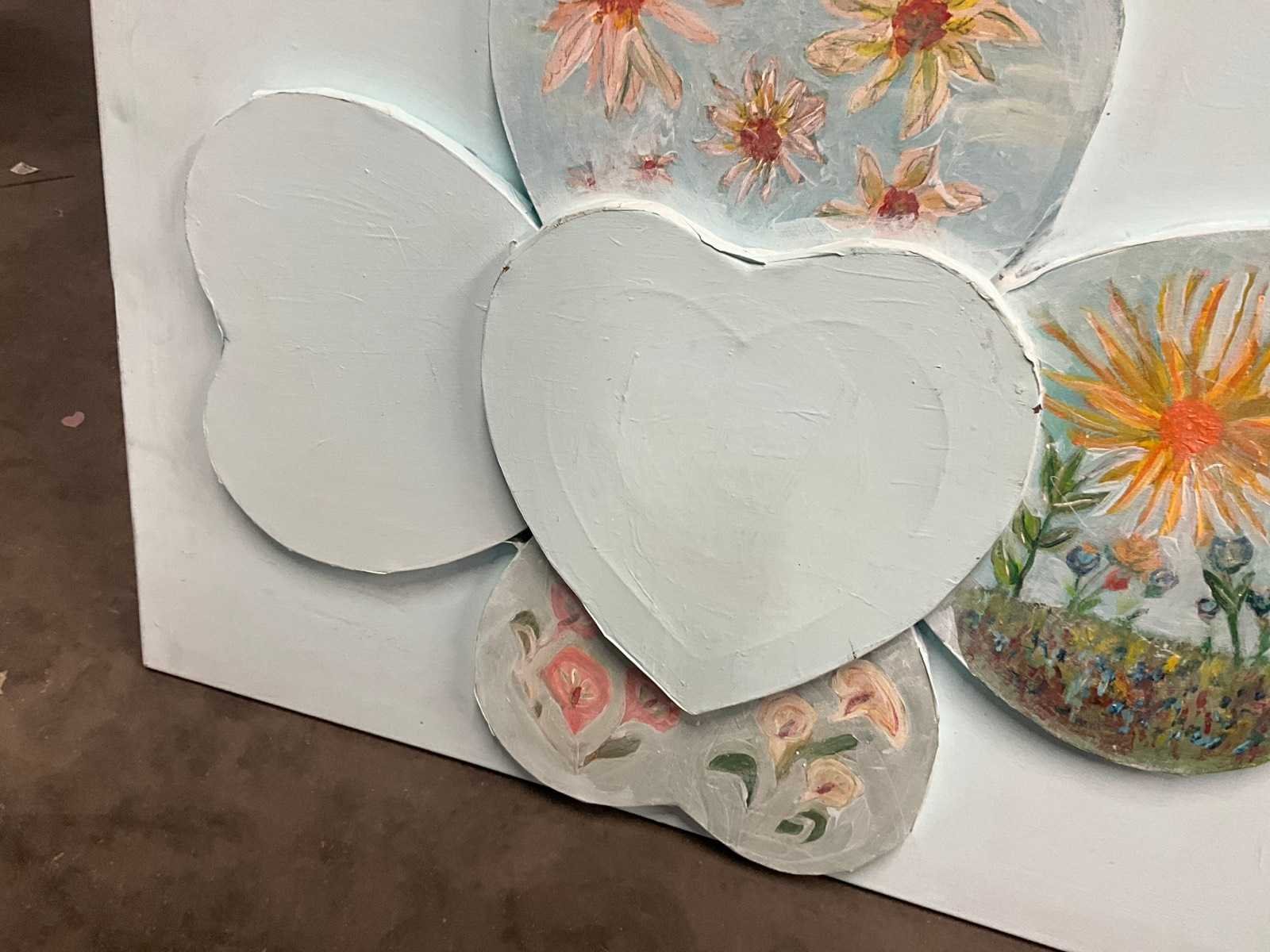 Acryl op doek, afbeeldend harten, waaronder er bovenop. No Techniek: Gemengd Hoogte: 60cm Breedte: 80cm