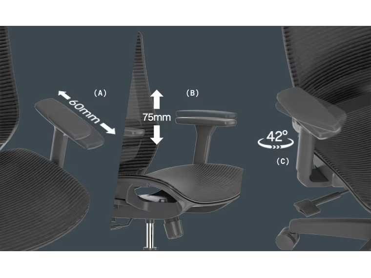 Model BS4 Kleur Grijs Verstelbare hoogte 112,5-124,5 cm Hoogte van vloer tot zitschaal 46-58 cm Zitbreedte 51,5 cm Zitdiepte 46,5 cm Rugleuningsbreedte 47,5 cm Lendensteunverstelafstand 5,5 cm Hellingshoek 108°-128° Hoofdsteunverstellingsbereik 6 cm Let op: Til de hoofdsteun voorzichtig omhoog om hem op de gewenste hoogte vast te zetten. Hef het op naar de hoogste positie om het slot los te maken. Armleuningen (3D) Hoogte 7,5 cm Diepte 6 cm 42° rotatie Hoogte van armleuning tot zitplaats 21-28,5 cm Aantal wielen 5 Geschikte oppervlakken De meeste oppervlakken, waaronder parket, tegels, laminaat en beton. Materialen Zit- en rugkussen: zwart nylon met vezel rugframe + Koreaanse meshstof De armleuningen van 3D PU kunnen heen en weer worden gedraaid. De lendensteun van schuim + ABS kan worden verhoogd en versteld. Nylon voeten. Laadvermogen 136 kg Non