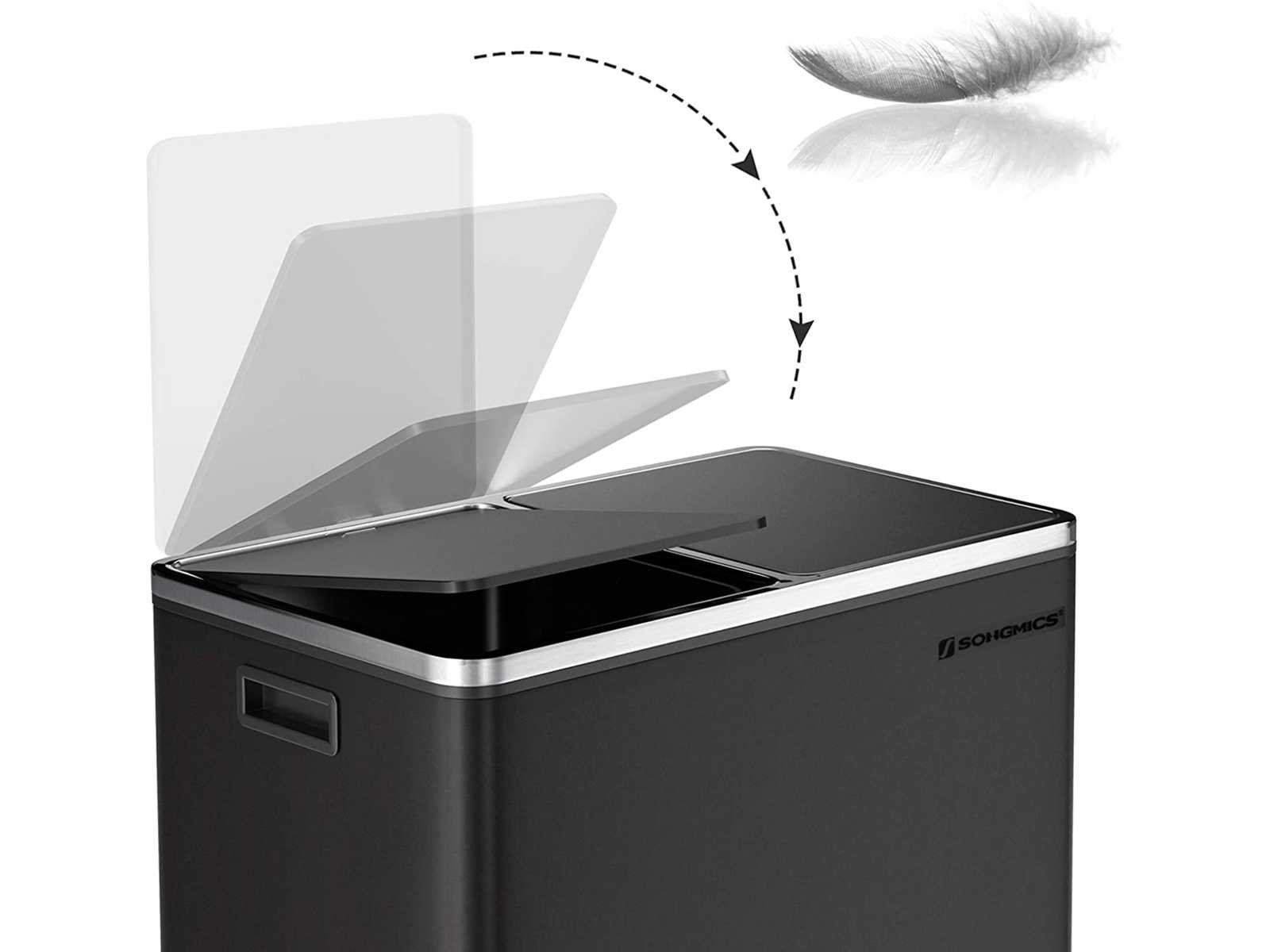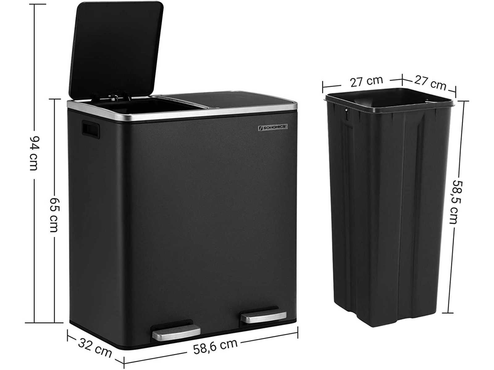 Functie: Kleur: Zwart Afmetingen van de bak: 58,6 x 32 x 65 cm (L x B x H) Afmetingen per interne emmer: 27 x 27 x 58,5 cm (L x B x H) Totale hoogte met open deksel: 94 cm Gewicht: 9,1 kg Bezorging: 1 x Prullenbak Non