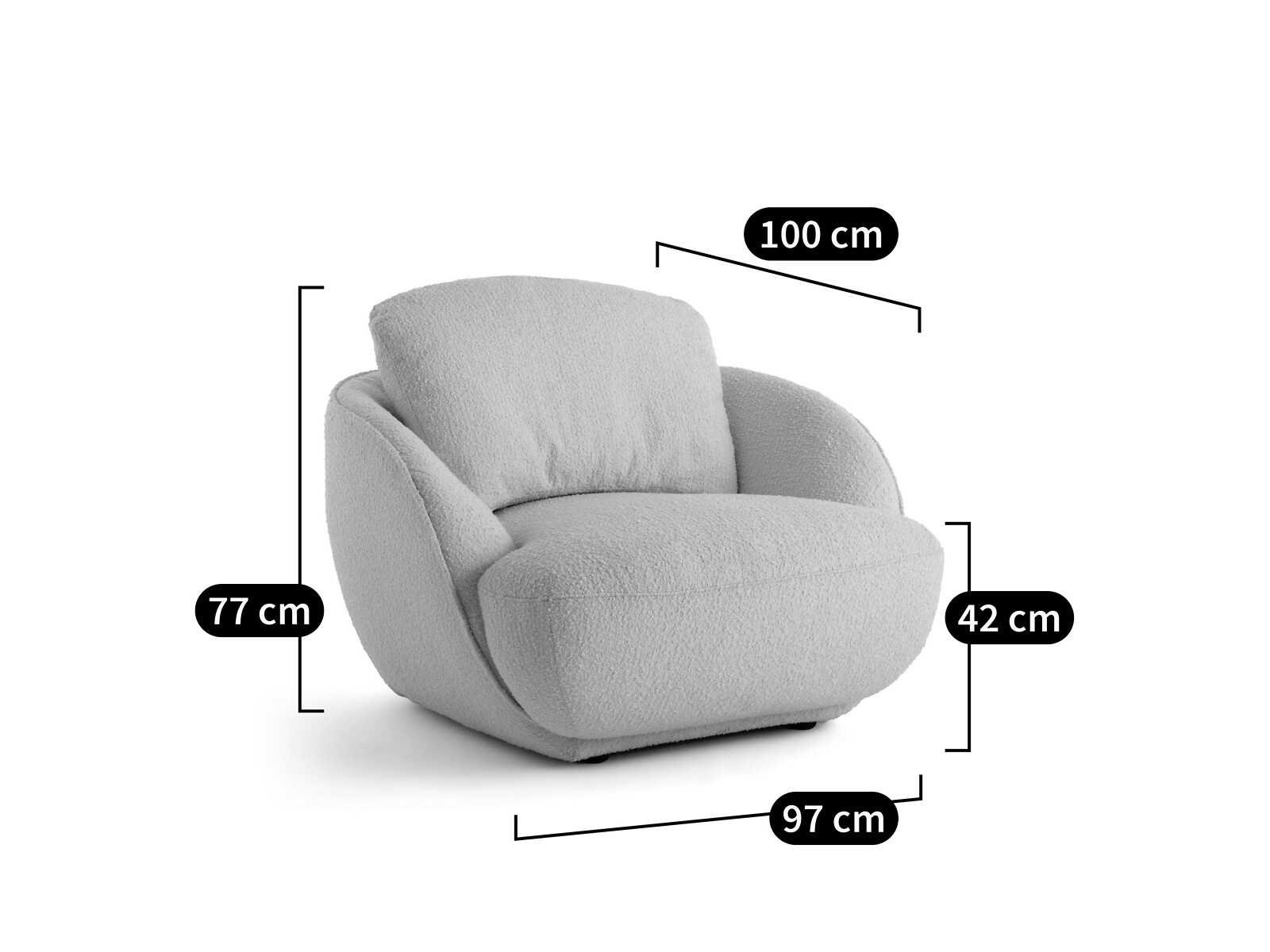Beschrijving • 95% polyester, 5% acryl terry bekleding, ecru kleur • Frame: massief populier en dennenmultiplex • 16 kg/m³ polyetherschuimvulling en polyestervezelcoating • Vaste zitplaats, gevuld met 22 kg/m³ en 30 kg/m³ polyurethaanschuim en een coating van polyestervezels • Afneembaar, afneembaar rugkussen met een mengsel van veren en polyester vezelvlokken • Verstelbare PVC-voeten, H15 mm Afmetingen • Breedte: 97 cm • Hoogte: 77 cm • Diepte: 100 cm • Zitting: W86 x H42 x D62 cm Non