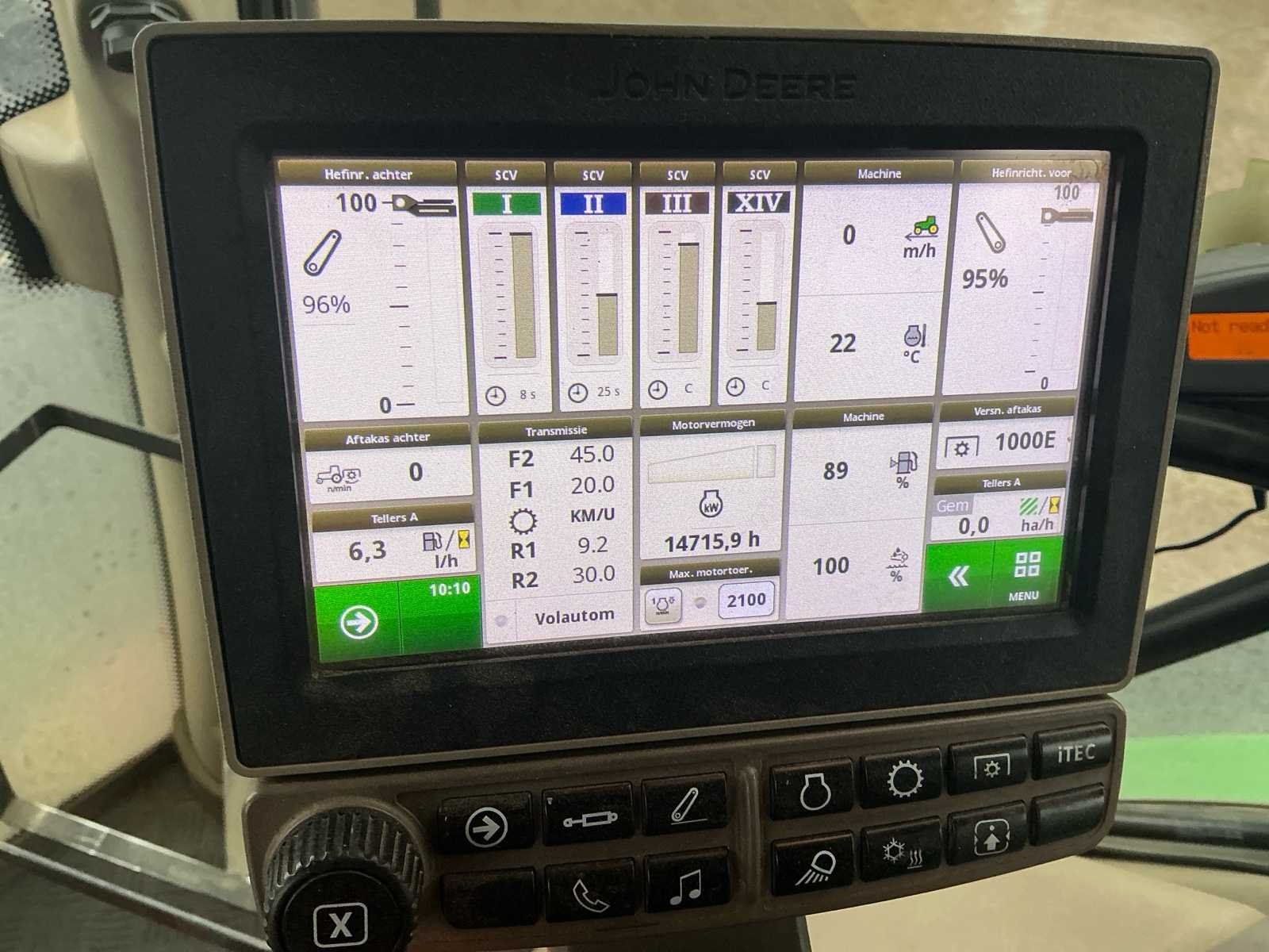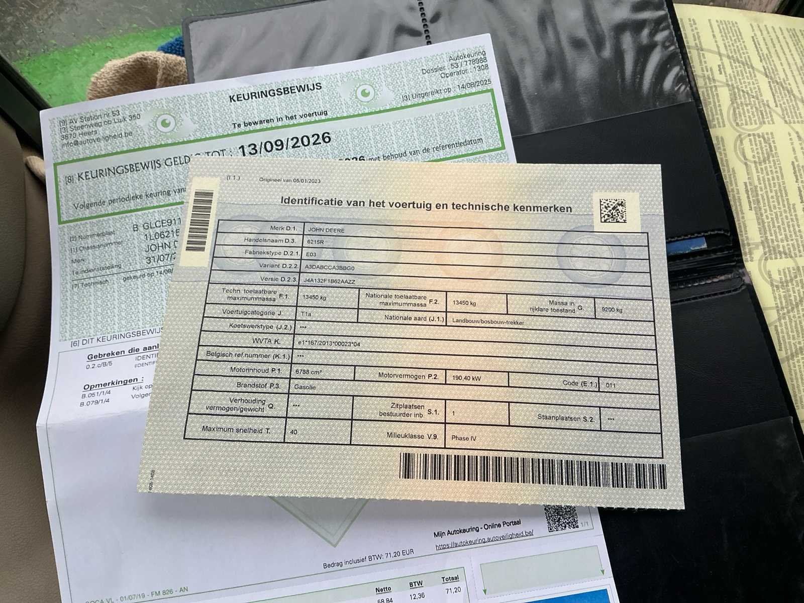 Krachtige en goed onderhouden John Deere 6215R landbouwtrekker, bouwjaar 2018, afkomstig uit professioneel gebruik. De trekker is uitgerust met een 6-cilinder 6,8L dieselmotor (Stage IV) en levert een motorvermogen van 190,4 kW (±259 pk). De machine is 40 km/u gehomologeerd en beschikt over een rijklaar gewicht van ca. 9.200 kg met een toelaatbare maximummassa van 13.450 kg, wat hem geschikt maakt voor zowel zwaar veldwerk als transport. De trekker is correct ingeschreven en beschikt over een geldig keuringsbewijs tot 13/09/2026.Geen COC aanwezig. Inschrijvingsbewijs DEEL I & II aanwezig. Nee Merk: John Deere Type: 6215 R Bouwjaar: 2018 Motorvermogen (kW): 190kW Afgelezen urenstand: 14716 Frontgewichtenset: true Frontaftakas: false Cabine: true Luchtgeveerde stoel: true
