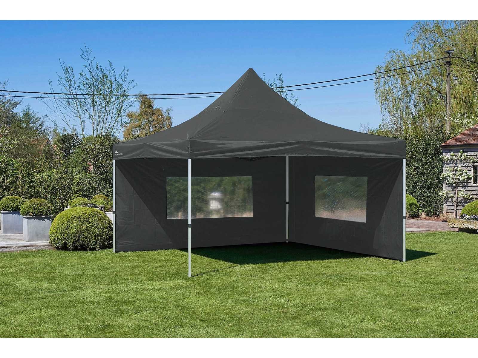 Deze premium aluminium vouwtent is perfect voor evenementen, feestjes en beurzen en dankzij het lichte gewicht eenvoudig mee te nemen. De tent kan rondom volledig dicht worden gemaakt met de vier inbegrepen zijwanden van elk 4 meter, waarvan twee zijwanden met raam, één zijwand met een deur en één blanco zijwand. Snel op te zetten zonder enige voorkennis dankzij het stevige hexagonale aluminium frame en duurzame nylon connectoren. Inclusief waterdichte topcover en zijwanden van hoogwaardig polyester met pvc-coating, evenals een draagtas voor het frame. Nieuw en in de originele, ongeopende verpakking. Frame: Aluminium (in hoogte verstelbaar) Inbegrepen draagtas voor frame Inbegrepen zijwanden: 2x 4m raam, 4m deur, 4m blanco Diameter: 45 mm Doorsnede: Hexagonaal (zeskantig) Wanddikte: 1,8 mm Koppelingen: Quick Release Connectors: Nylon! (geen breekbaar plastic PP) Hoogte Frame (dicht): 206 cm Zeilen: Polyester met PVC coating - Sunprotected/Waterproof 350g/m² Bevestigingen: wand/wand = rits — topcover/wand = velcro Doorloophoogte: min. 210 / max. 230 Max nokhoogte: min. 350 / max. 370 Oppervlakte: 16m2 No Merk: VOUWTENT.EU Kleur: Antraciet Gewicht: 37,5kg Lengte: 400cm Breedte: 400cm Hoogte: 330cm Materiaal: Aluminium