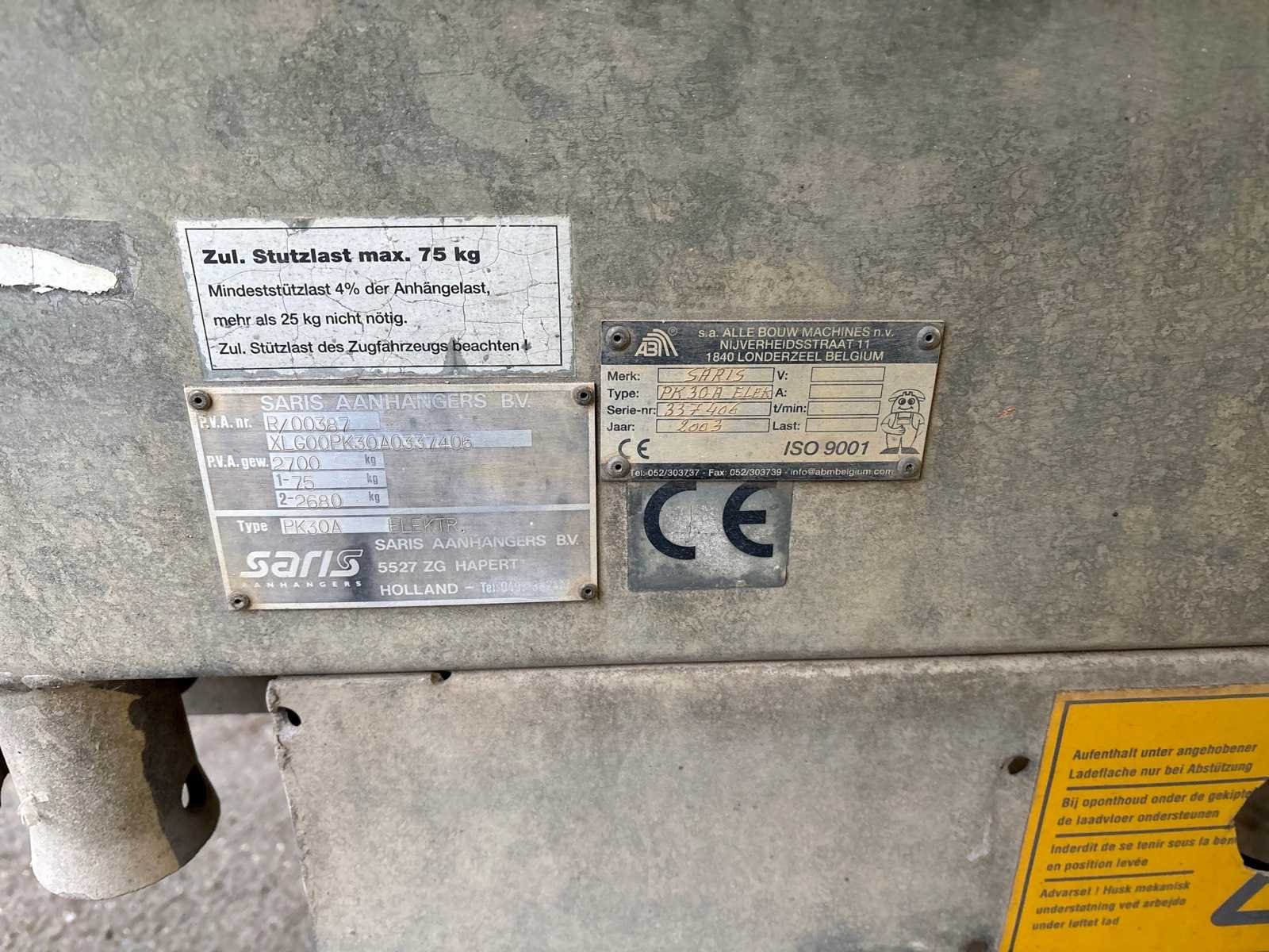 Nee Merk: Saris Type: PK30A Bouwjaar: 2003 Chassisnummer: XLG00PK30A0337406 Aantal assen: 2 Laadbak afmeting l: 310cm Laadbak afmeting b: 175cm Laadvermogen: 2700kg Kentekenpapieren compleet?: true Nationaliteit documenten: België
