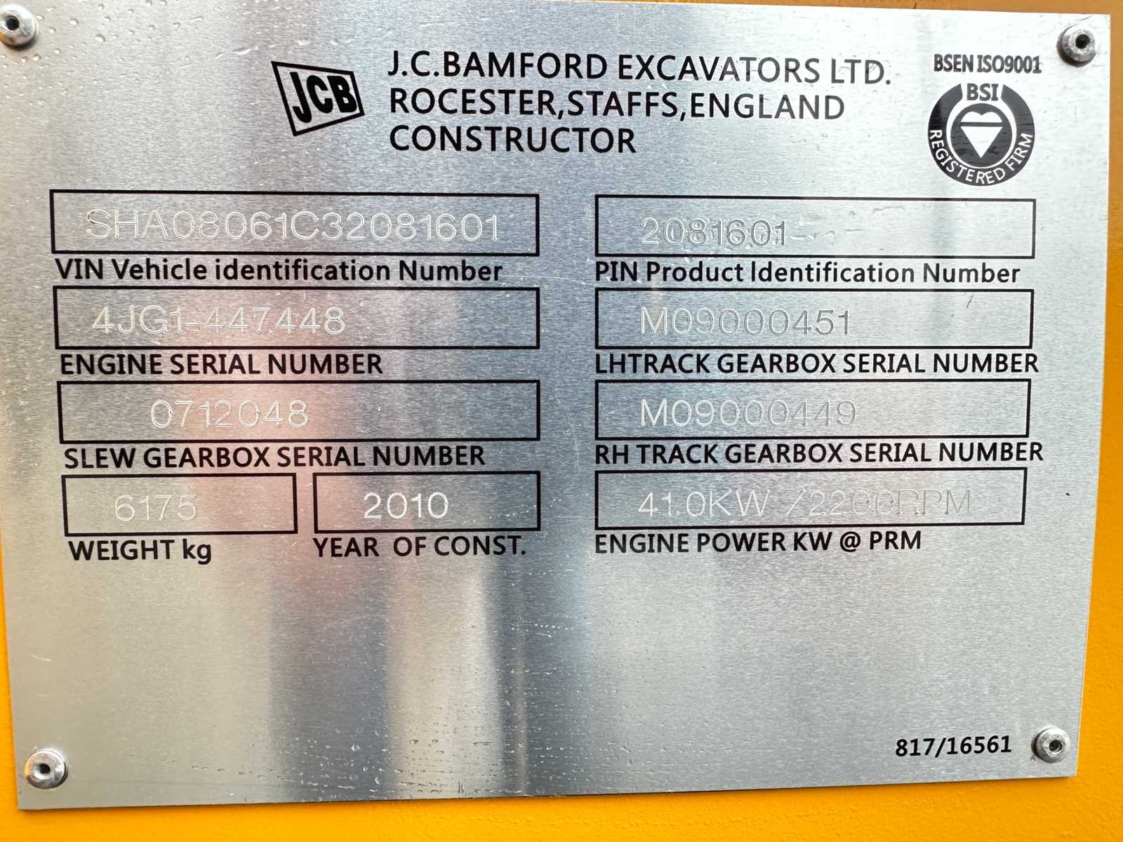 -Mechanische snelwissel -Hamerleidingen -Tandenbak -Duwblad -Rupsen met rubber pads -Geen documenten Nee Merk: JCB Type: 8061 Bouwjaar: 2010 Serienummer: SHA08061C32081601 Merk motor: ISUZU Motorvermogen (kW): 41kW Aantal cilinders: 4 Brandstof: Diesel Graafbak afm. b: 650mm Rups breedte: 400mm Afgelezen urenstand: 680.7 Eigen gewicht: 6175kg Totale afmeting L: 5900mm Totale afmeting Breedte: 2000mm Totale afmeting Hoogte: 2700mm GS Code: 8429521200