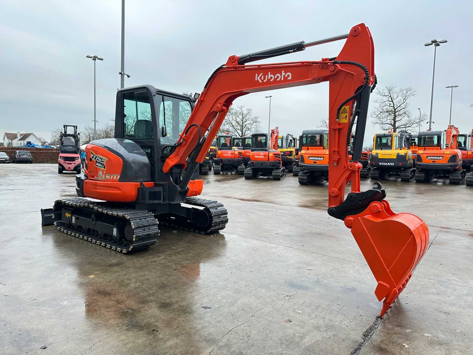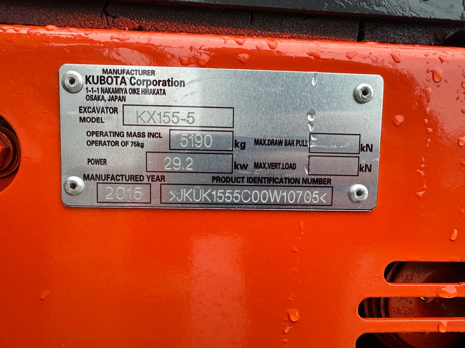 -Mechanische snelwissel. -Hamerleidingen. -Tandenbak. -Duwblad . -Rupsen met rubber pads. -Geen documenten. Nee Merk: Kubota Type: KX155-5 Bouwjaar: 2015 Serienummer: JKUK1555C00W107005 Merk motor: Kubota V2403 Motorvermogen (kW): 29.2kW Aantal cilinders: 4 Brandstof: Diesel Graafbak afm. b: 650mm Rups breedte: 400mm Afgelezen urenstand: 4368 Eigen gewicht: 5190kg Totale afmeting L: 5500mm Totale afmeting Breedte: 2000mm Totale afmeting Hoogte: 2600mm GS Code: 8429521200