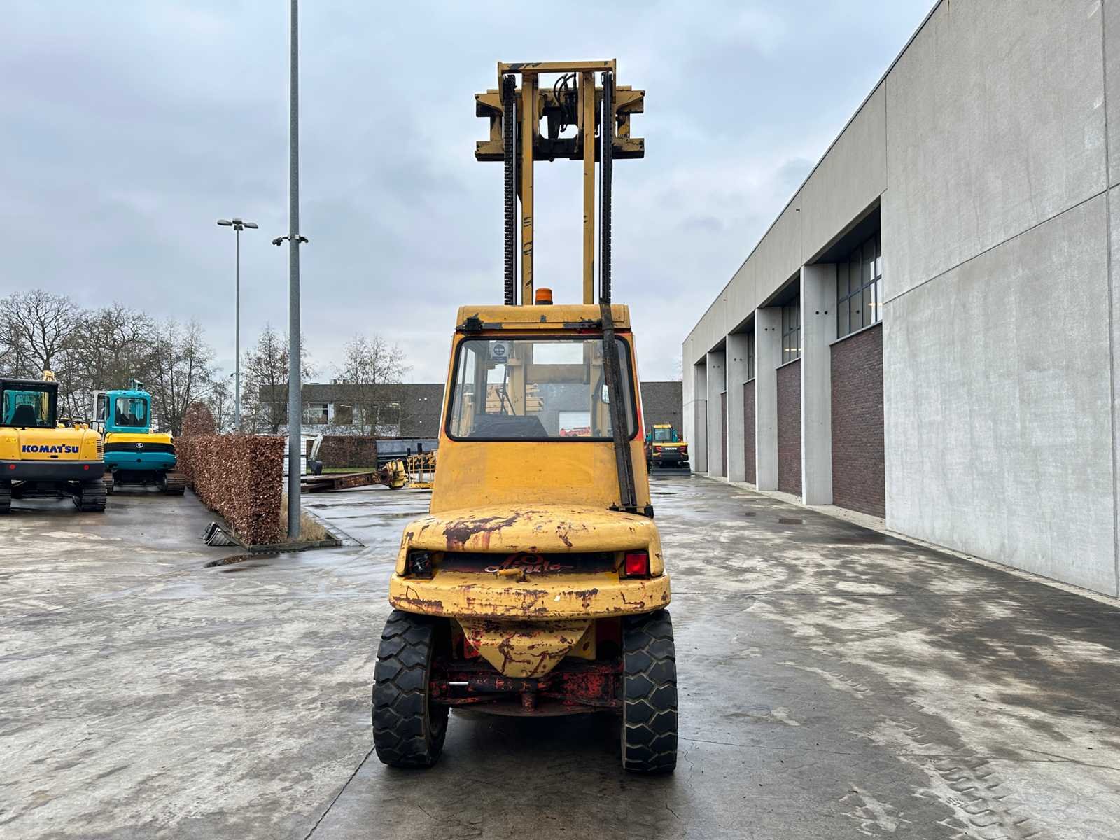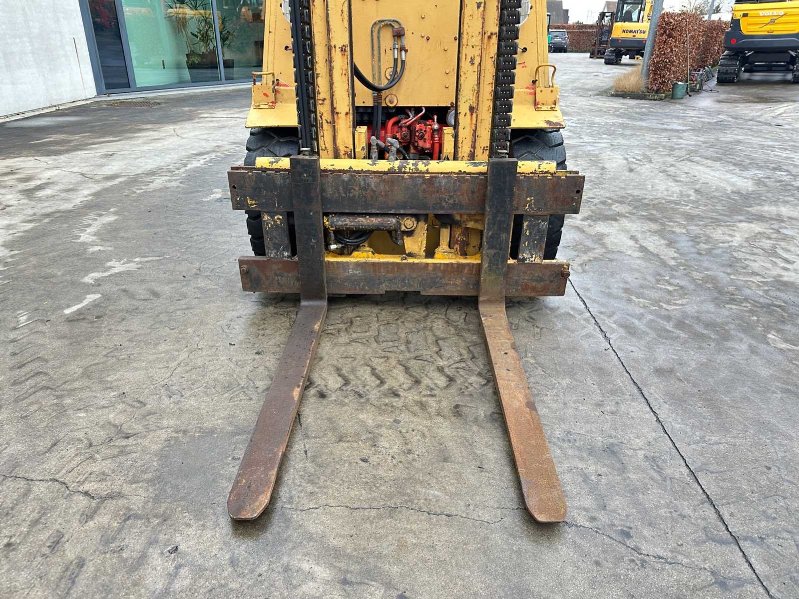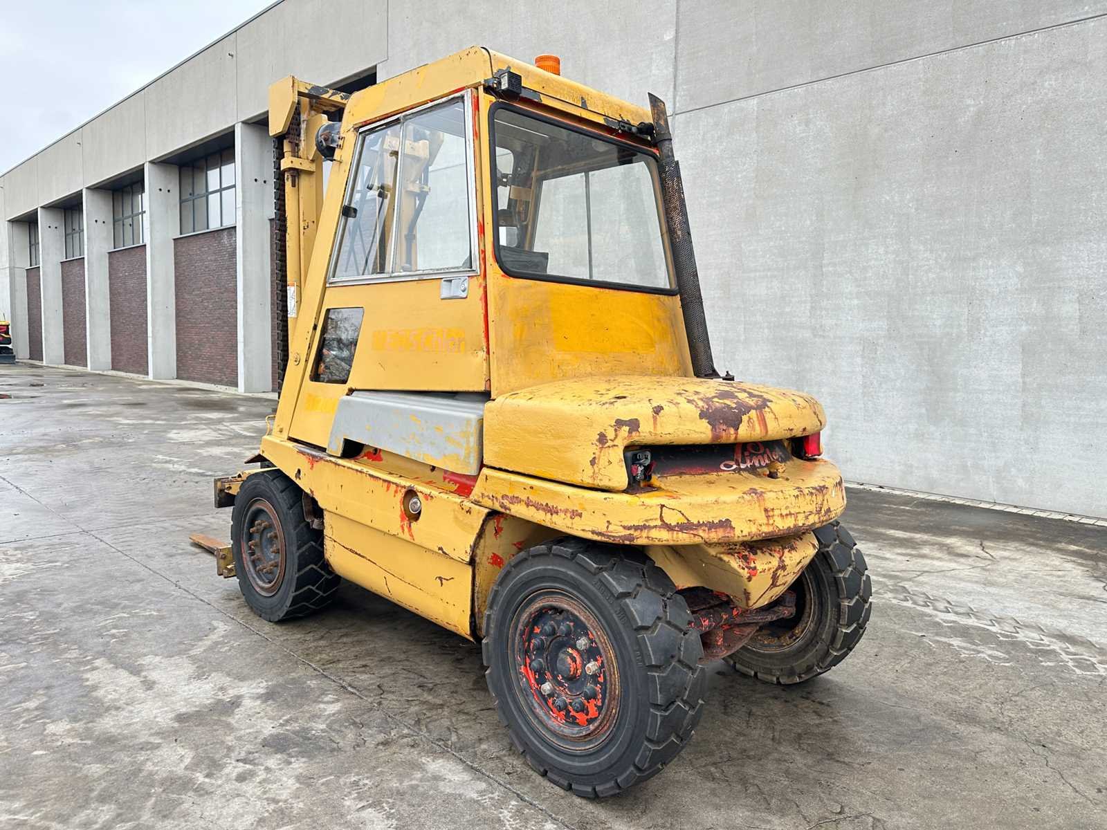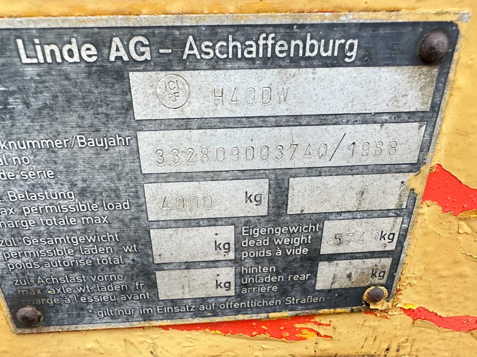 Geen documenten Nee Merk: Linde Type: H40DW Bouwjaar: 1988 Serienummer: 332809003740 Brandstof: Diesel Mast: Duplex doorkijkmast Soort band: Vol Rubber Aantal wielen: 4 Afgelezen urenstand: 7041 Duplex mast: true Eigen gewicht: 5740kg Hefvermogen: 4000kg Lepellengte: 1000mm Max. hefhoogte: 3250mm Vol rubber banden: true Totale afmeting L: 2900mm Totale afmeting Breedte: 1450mm Totale afmeting Hoogte: 2400mm Diesel: true
