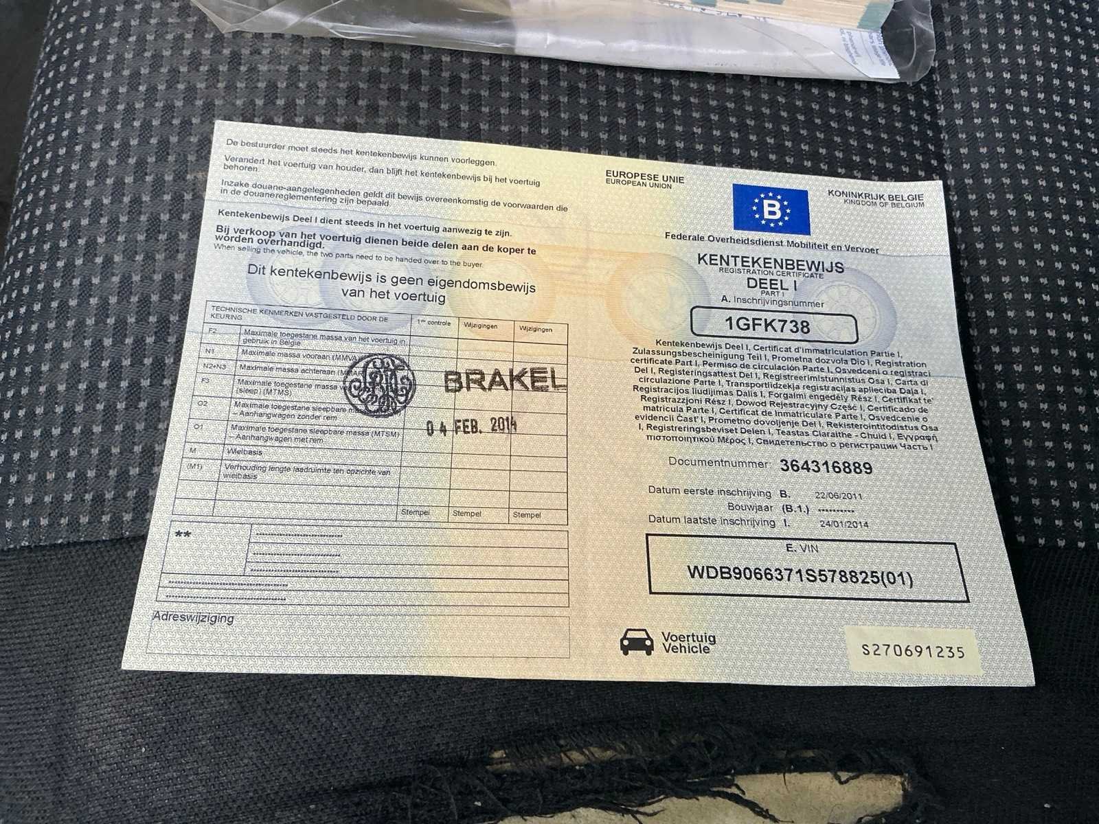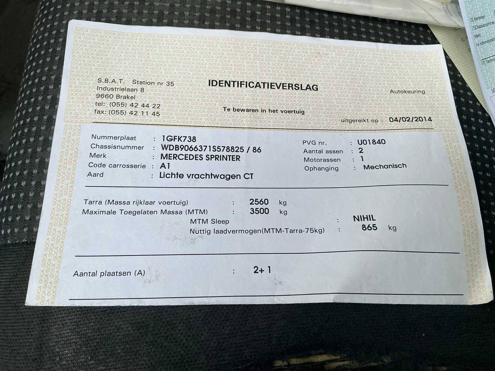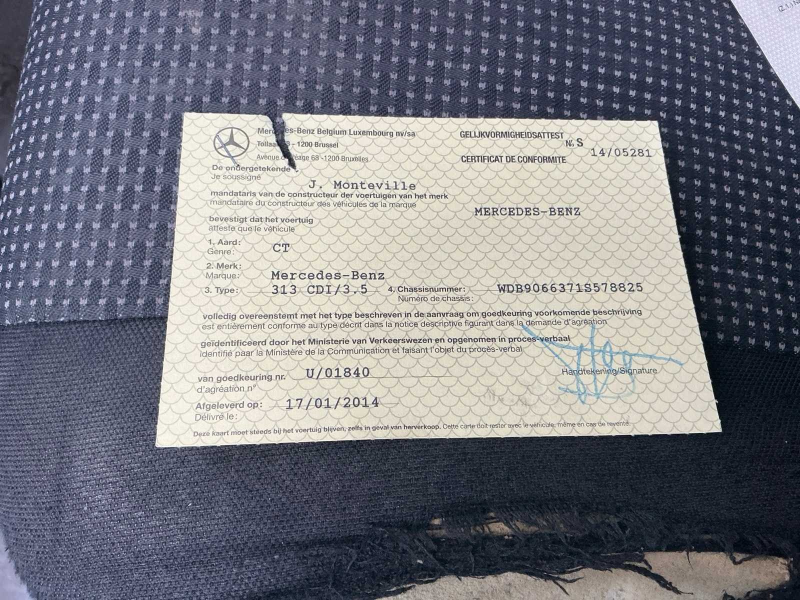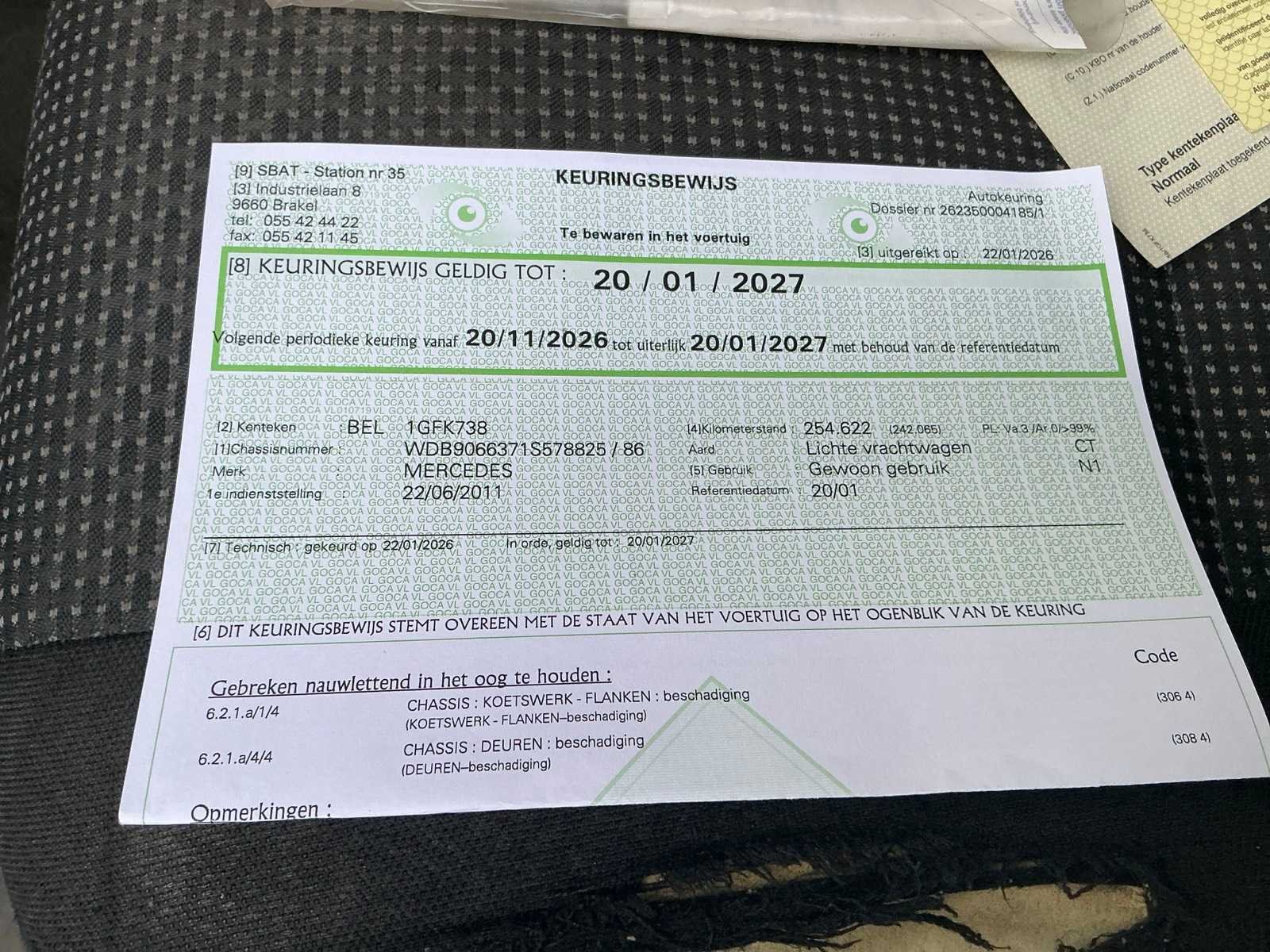 Documentatie waaronder keuringsbewijs, kentekenbewijs deel 1 + deel 2, gelijkvormigheidsattest, identificatieverslag aanwezig. Trekhaak. Voorzien van laadplatform en achteruitrijcamera. Totale lengte: 755cm. Laadruimte: 480 cm Inclusief: 2x nieuwe koplamp en 2x nieuwe spiegel in laadruimte Nee Merk: Mercedes-Benz Type: 313CDI Model: Sprinter Bouwjaar: 2011 Chassisnummer: WDB9066371S578825 Afgelezen kilometerstand: 254741km Cilinderinhoud: 2143cc Vermogen (kW): 120kW Brandstof: diesel Datum eerste inschrijving: 22/06/2011 Datum eerste toelating: 22/06/2011 Transmissie: Handgeschakeld Aantal zitplaatsen: 3 Kleur: Wit Nationaliteit documenten: België Aantal deuren: 5 Aantal sleutels: 2 Ledig gewicht: 2560kg Laadvermogen: 865kg Kentekenpapieren compleet?: true Boorddocumenten aanwezig?: true Startinformatie: Start en rijdt