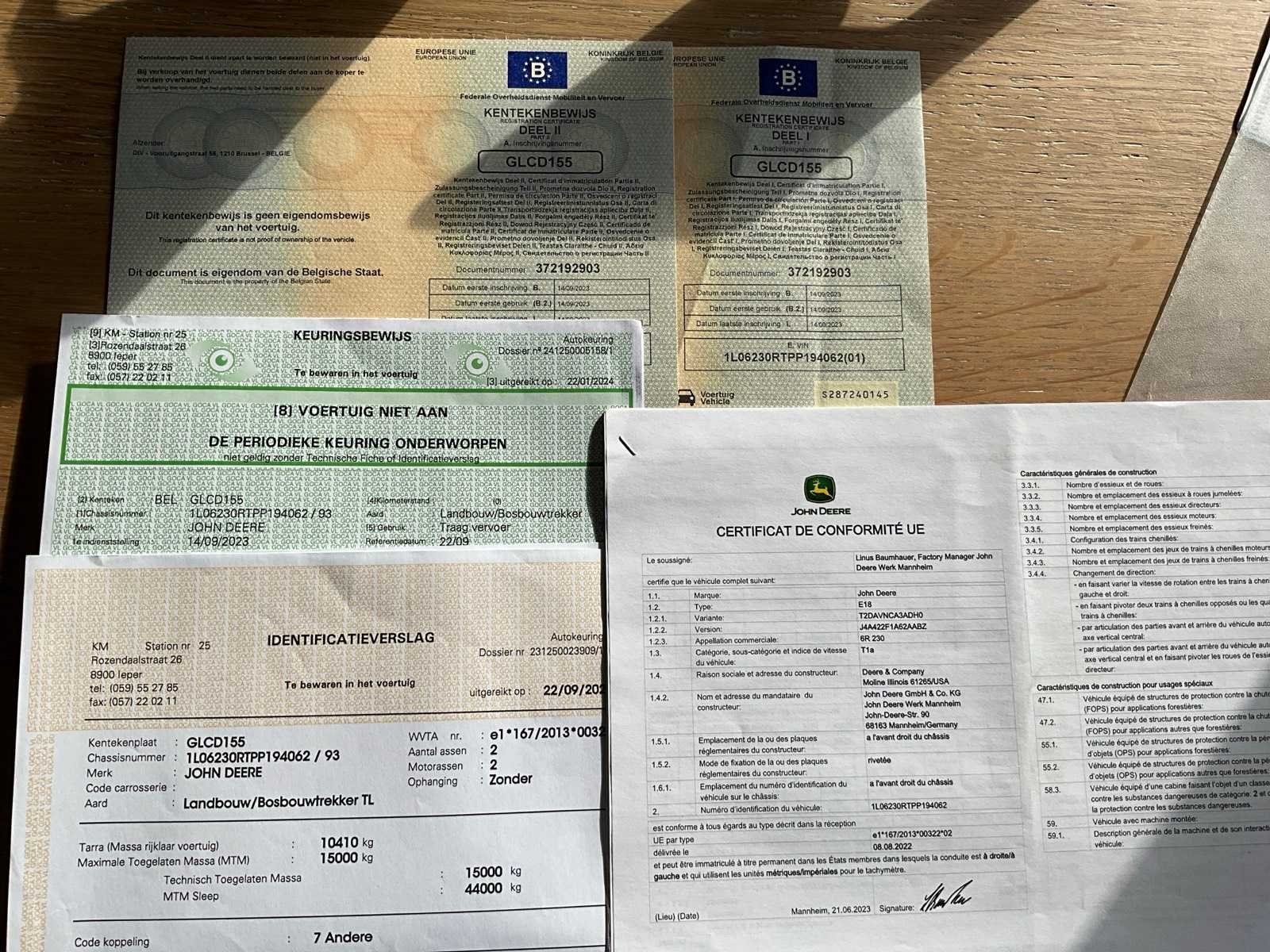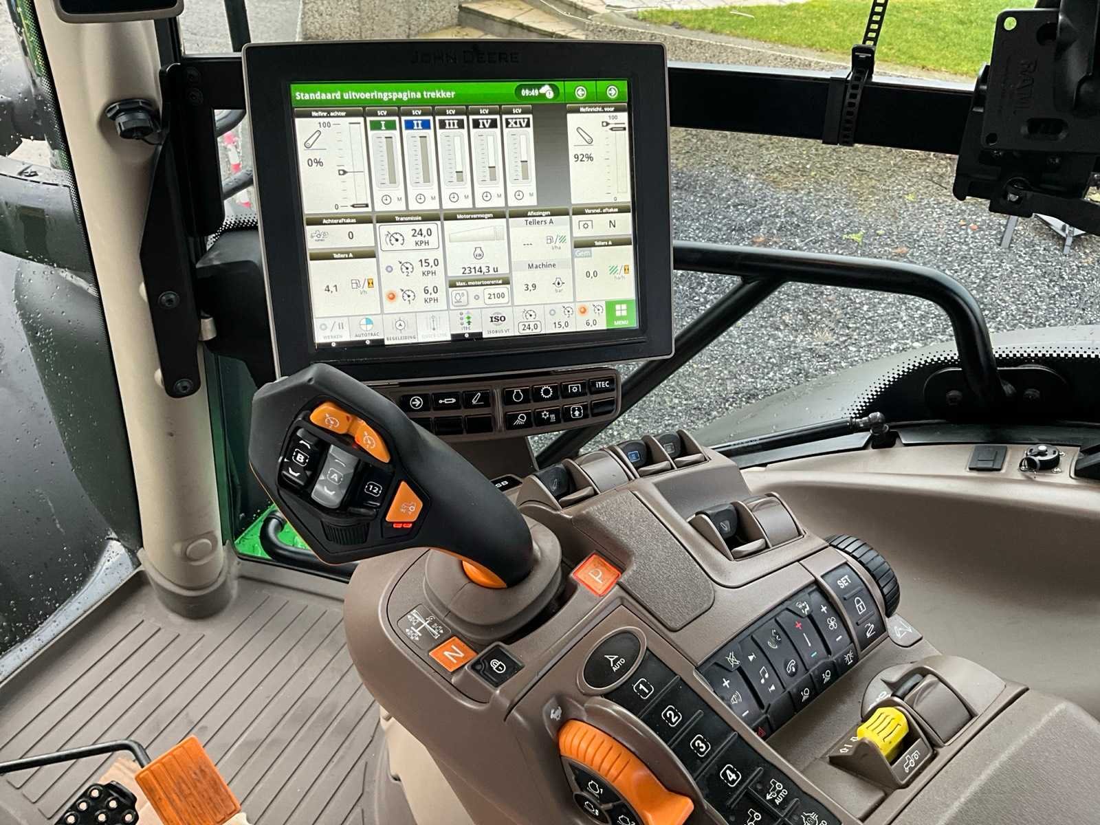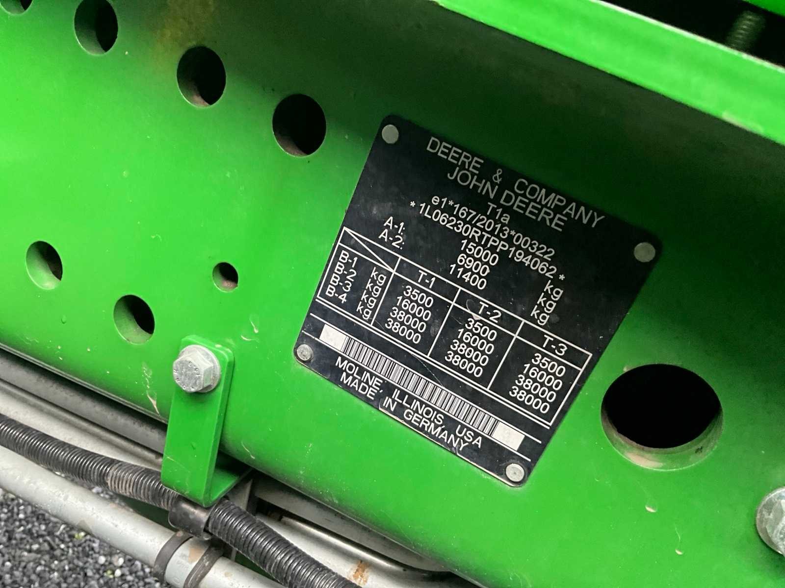 Voorzien van hydraulisch cabine en voorasvering, AD bleu, variabele spoorbreedte op achteras, banden druk regeling, electrische spiegel regeling, koelkast, klapdak, lederen zetels, hydraulische topstang, piton fix trekhaak, abs stekker, isobus, automatische vanghaken, luchtdruk en hydraulische remmen, Belgische boorddocumenten compleet, sleutel aanwezig No Merk: John Deere Type: 6R230 Bouwjaar: 2023 Serienummer: 1L06230RTPP194062 Motorvermogen (kW): 169kW Afgelezen urenstand: 2314 Versnellingsbaktype: Vario command pro Aantal hydraulische ventielen voor: 1 Aantal hydraulische ventielen achter: 4 Bandenmaat voor: 600/70R30 SFT type Bandenmaat achter: 710/70R42 SFT type Fronthefinrichting: true Cabine: true Luchtgeveerde stoel: true Eigen gewicht: 10750kg Totale afmeting L: 5000mm Totale afmeting Breedte: 2750mm Totale afmeting Hoogte: 3450mm Datum eerste toelating: 14-09-2023 Nationaliteit documenten: Belgische