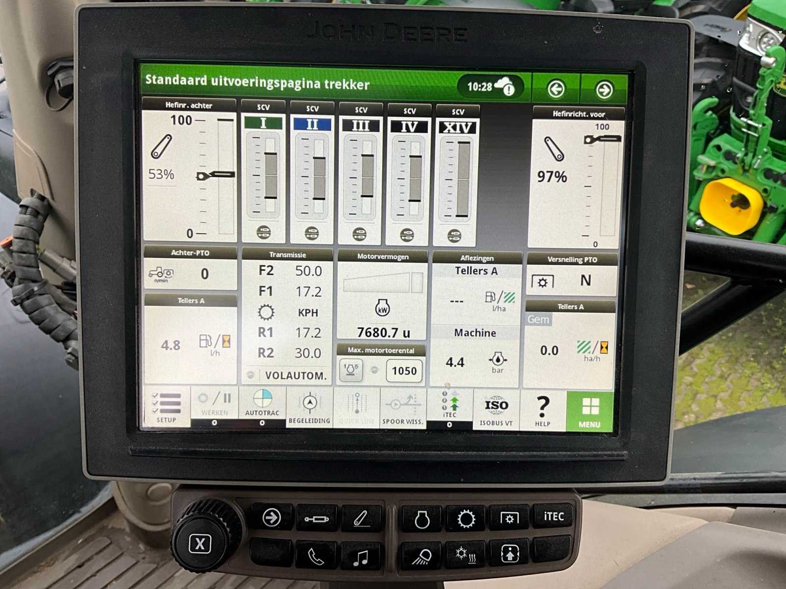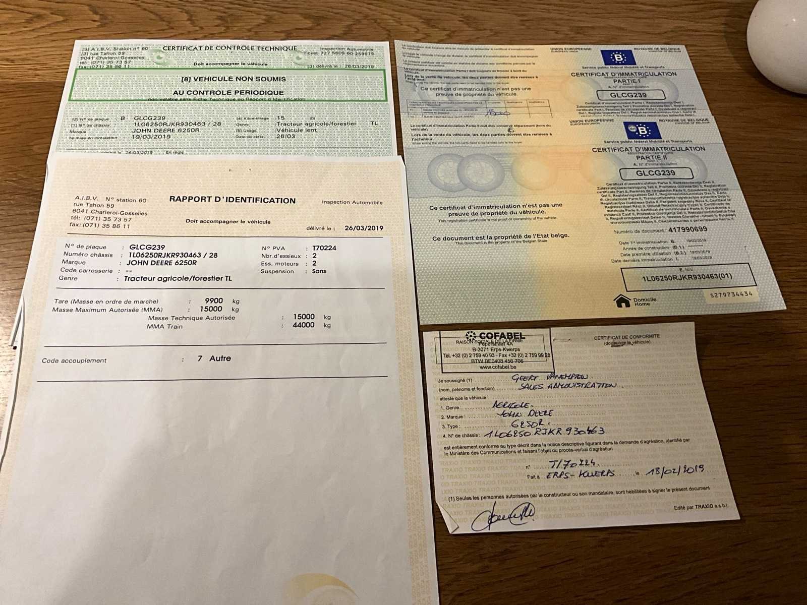 Voorzien van hydraulisch cabine en voorasvering, AD bleu, klapdak, piton fix trekhaak met stuuras koppelingen, isobus, automatische vanghaken, luchtdruk en hydraulische remmen, front topstang, Belgische boorddocumenten compleet, sleutel aanwezig No Merk: John Deere Type: 6250R Bouwjaar: 2019 Serienummer: 1L06250RJKR930463 Afgelezen urenstand: 7680 Versnellingsbaktype: Vario auto power Aantal hydraulische ventielen voor: 1 Aantal hydraulische ventielen achter: 4 Bandenmaat voor: 600/70R28 Bandenmaat achter: 650/85R38 Fronthefinrichting: true Cabine: true Luchtgeveerde stoel: true Eigen gewicht: 9900kg Totale afmeting L: 5000mm Totale afmeting Breedte: 2500mm Totale afmeting Hoogte: 3450mm Datum eerste toelating: 19-03-2019 Nationaliteit documenten: Belgische GS Code: 7
