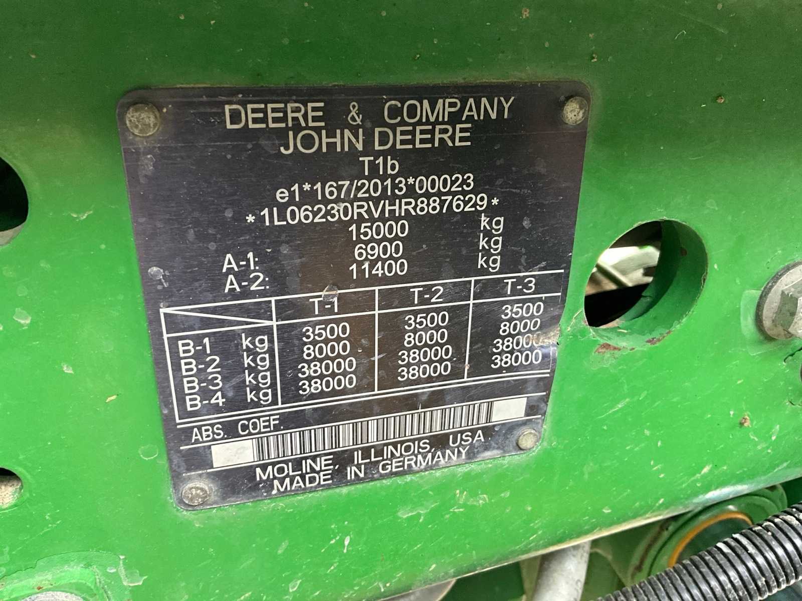 Voorzien van hydraulisch cabine en voorasvering, AD bleu, variabele spoorbreedte op achteras, hydraulische topstang, piton fix trekhaak, isobus, automatische vanghaken, luchtdruk en hydraulische remmen, Belgische boorddocumenten compleet, sleutel aanwezig Nee Merk: John Deere Type: 6R230 Bouwjaar: 2017 Serienummer: 1L06230RVHR887629 Motorvermogen (kW): 169kW Afgelezen urenstand: 4630 Versnellingsbaktype: Vario command pro Aantal hydraulische ventielen voor: 1 Aantal hydraulische ventielen achter: 4 Bandenmaat voor: 600/70R28 Bandenmaat achter: 650/85/R38 Fronthefinrichting: true Cabine: true Luchtgeveerde stoel: true Eigen gewicht: 10615kg Totale afmeting L: 5000mm Totale afmeting Breedte: 2750mm Totale afmeting Hoogte: 3450mm Nationaliteit documenten: Belgische