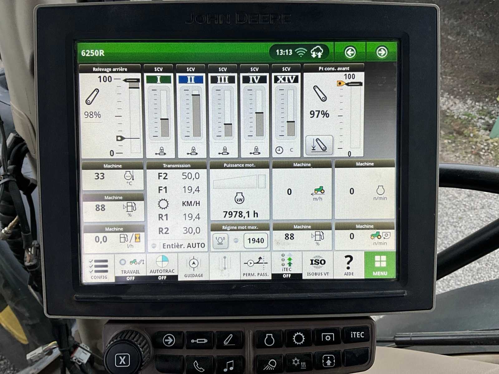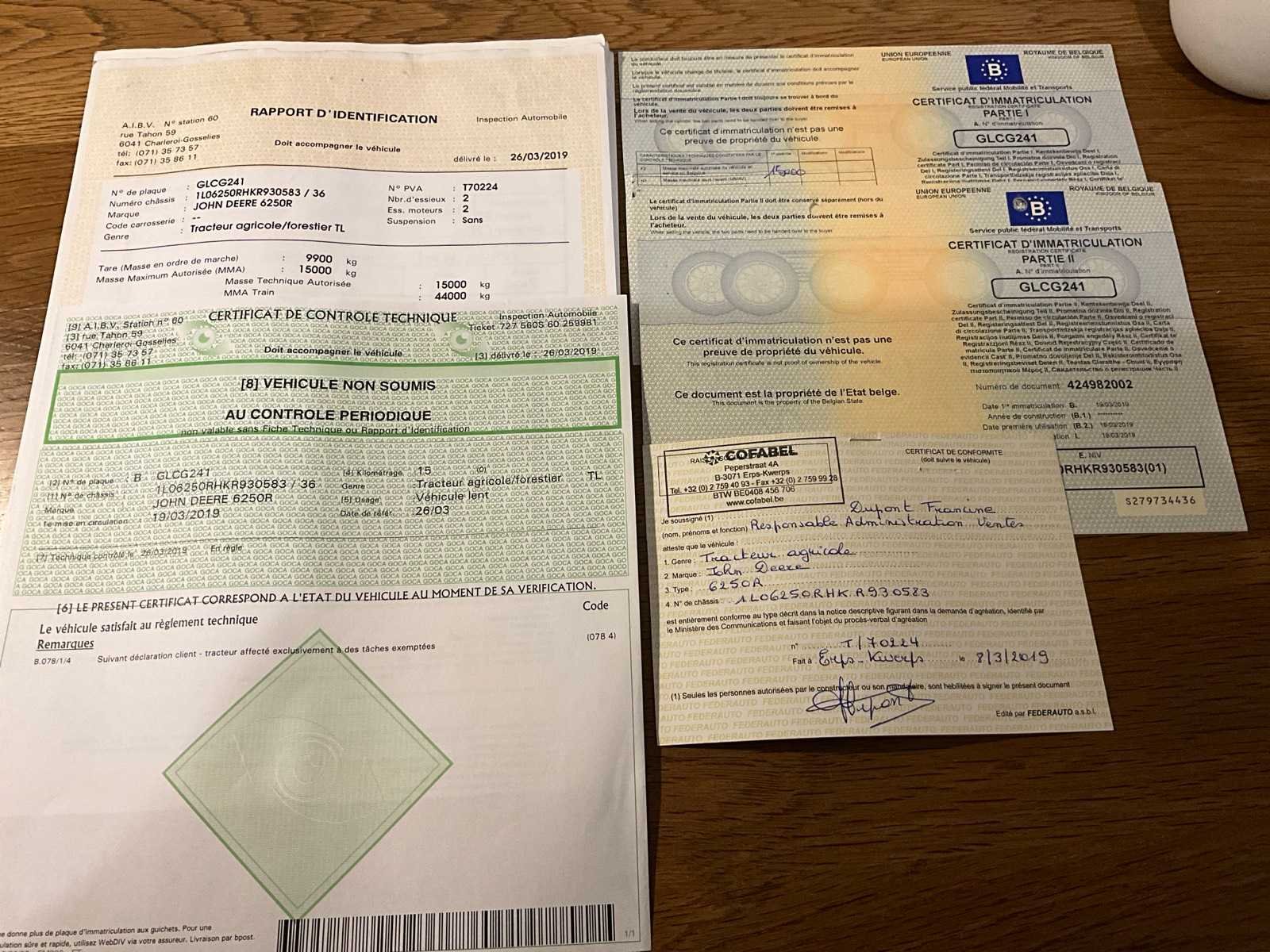 Voorzien van hydraulisch cabine en voorasvering, AD bleu, variabele spoorbreedte op achteras, hydraulische topstang, piton fix trekhaak, isobus, automatische vanghaken, luchtdruk en hydraulische remmen, Belgische boorddocumenten compleet, sleutel aanwezig No Merk: John Deere Type: 6R250 Bouwjaar: 2019 Serienummer: 1L06250RHKR930583 Motorvermogen (kW): 214kW Afgelezen urenstand: 7978 Versnellingsbaktype: Vario command arm Aantal hydraulische ventielen voor: 1 Aantal hydraulische ventielen achter: 4 Bandenmaat voor: 600/70R30 Bandenmaat achter: 710/70R42 Fronthefinrichting: true Cabine: true Luchtgeveerde stoel: true Eigen gewicht: 9900kg Totale afmeting L: 5000mm Totale afmeting Breedte: 2750mm Totale afmeting Hoogte: 3450mm Datum eerste toelating: 19-03-2019 Nationaliteit documenten: Belgische
