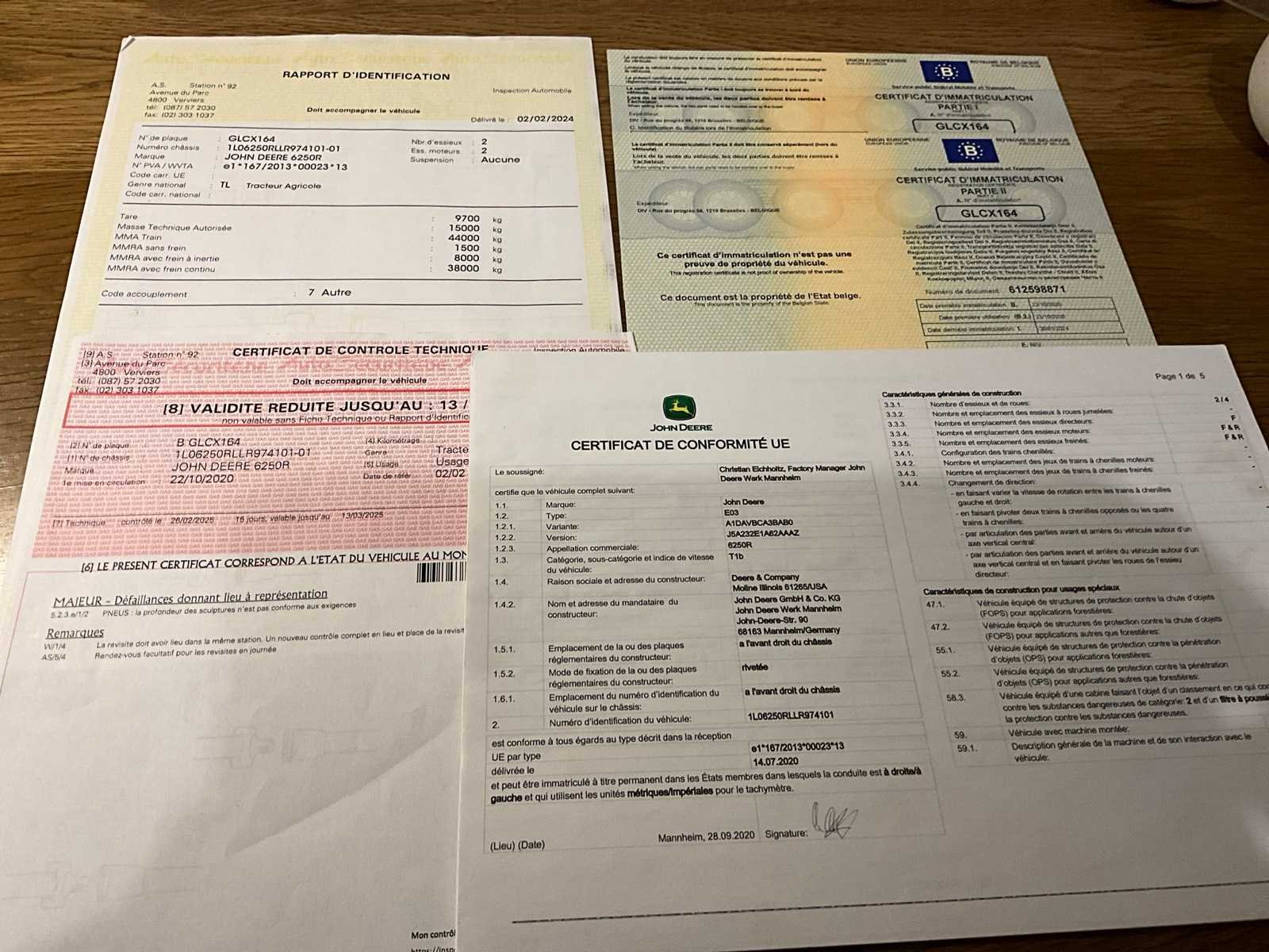 Voorzien van hydraulisch cabine en voorasvering, AD bleu, variabele spoorbreedte op achteras, hydraulische topstang, piton fix trekhaak, isobus, automatische vanghaken, luchtdruk en hydraulische remmen, Belgische boorddocumenten compleet, sleutel aanwezig No Merk: John Deere Type: 6R250 Bouwjaar: 2020 Serienummer: 1L06250RLLR974101 Motorvermogen (kW): 220.9kW Afgelezen urenstand: 10136 Versnellingsbaktype: Vario command pro Aantal hydraulische ventielen voor: 1 Aantal hydraulische ventielen achter: 4 Bandenmaat voor: 600/70R28 Bandenmaat achter: 650/85/R38 Fronthefinrichting: true Cabine: true Luchtgeveerde stoel: true Eigen gewicht: 9700kg Totale afmeting L: 5000mm Totale afmeting Breedte: 2750mm Totale afmeting Hoogte: 3450mm Datum eerste toelating: 22-10-2020 Nationaliteit documenten: Belgische