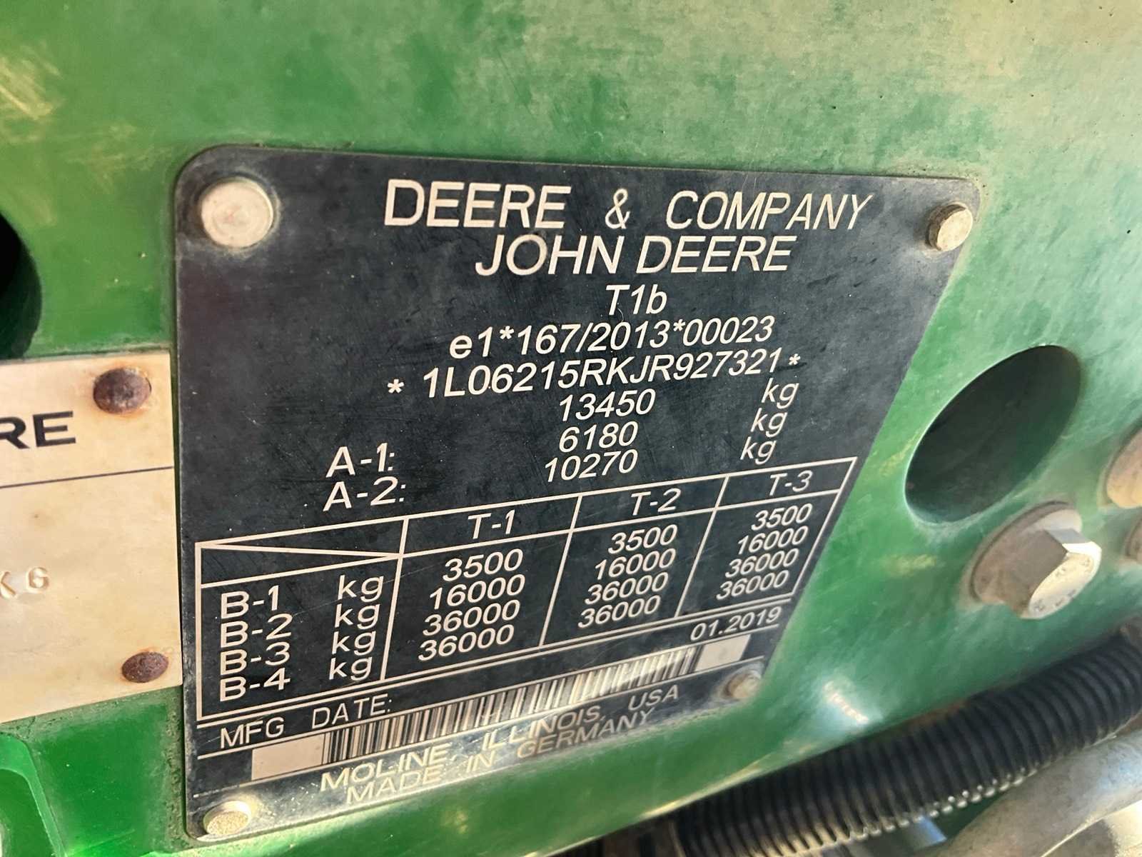 Voorzien van hydraulisch cabine en voorasvering, lead sensing, AD bleu, hydraulische topstang, topstang vooraan, piton fix trekhaak, isobus, automatische vanghaken, luchtdruk en hydraulische remmen, Belgische boorddocumenten compleet, sleutel aanwezig No Merk: John Deere Type: 6R215 Bouwjaar: 2019 Serienummer: 1L06215RKJR927321 Motorvermogen (kW): 158kW Afgelezen urenstand: 1989 Versnellingsbaktype: Vario Aantal hydraulische ventielen voor: 1 Aantal hydraulische ventielen achter: 4 Bandenmaat voor: 600/65R28 Bandenmaat achter: 650/65R42 Fronthefinrichting: true Cabine: true Luchtgeveerde stoel: true Eigen gewicht: 9200kg Totale afmeting L: 5000mm Totale afmeting Breedte: 2750mm Totale afmeting Hoogte: 3450mm Datum eerste toelating: 21-02-2019 Nationaliteit documenten: Belgische