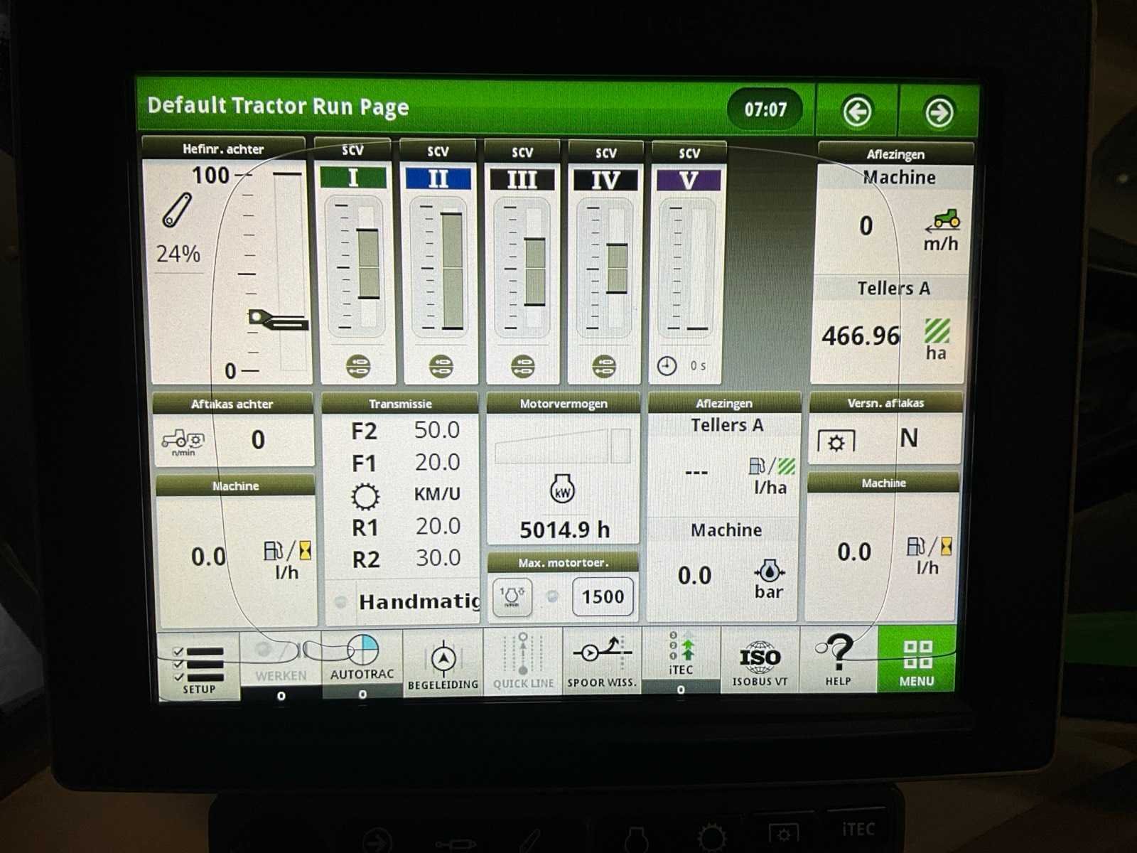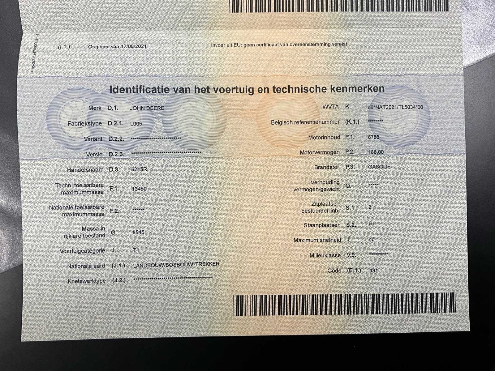 No Merk: John Deere Type: 6215R Bouwjaar: 2015 Serienummer: 1L06215RTFR832665 Motorvermogen (kW): 188kW Afgelezen urenstand: 5014.9 Versnellingsbaktype: AutoPowr Fronthefinrichting: true Totale afmeting L: 5050mm Totale afmeting Breedte: 2550mm Totale afmeting Hoogte: 3160mm Kentekenpapieren compleet?: true Chassisnummer: 1L06215RTFR832665 Datum eerste toelating: 30/6/2015 Nationaliteit documenten: België
