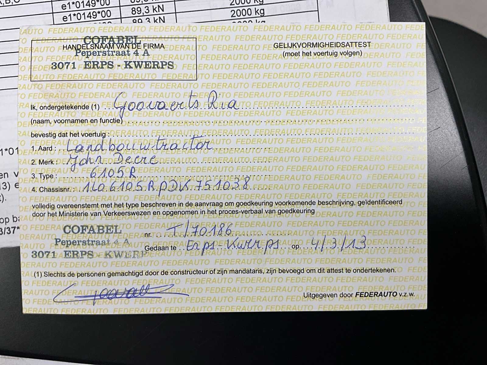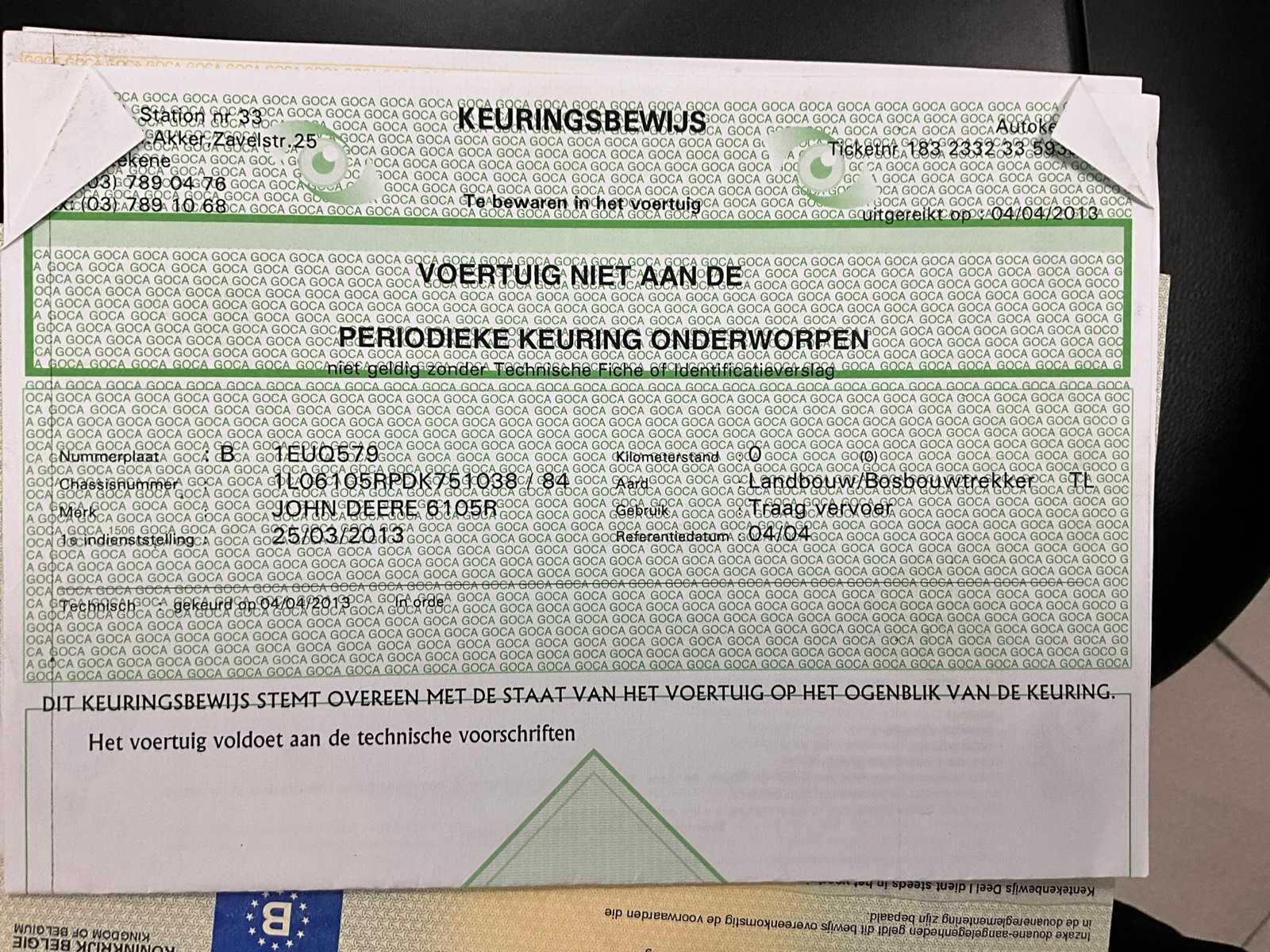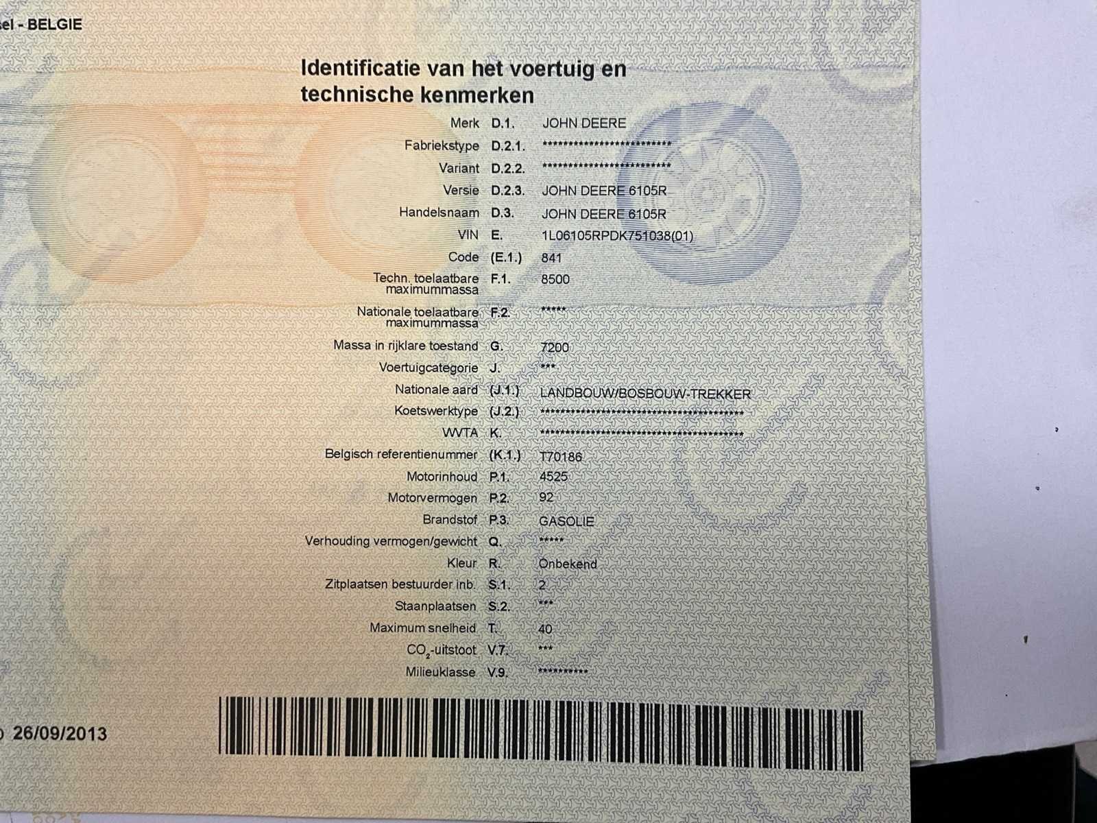 No Merk: John Deere Type: 6105R Bouwjaar: 2013 Serienummer: 1L06105RPDK751038 Motorvermogen (kW): 92kW Afgelezen urenstand: 6902.1 Bandenmaat voor: 14,9R24 Bandenmaat achter: 420/85R38 Cabine: true Kentekenpapieren compleet?: true Chassisnummer: 1L06105RPDK751038 Nationaliteit documenten: België