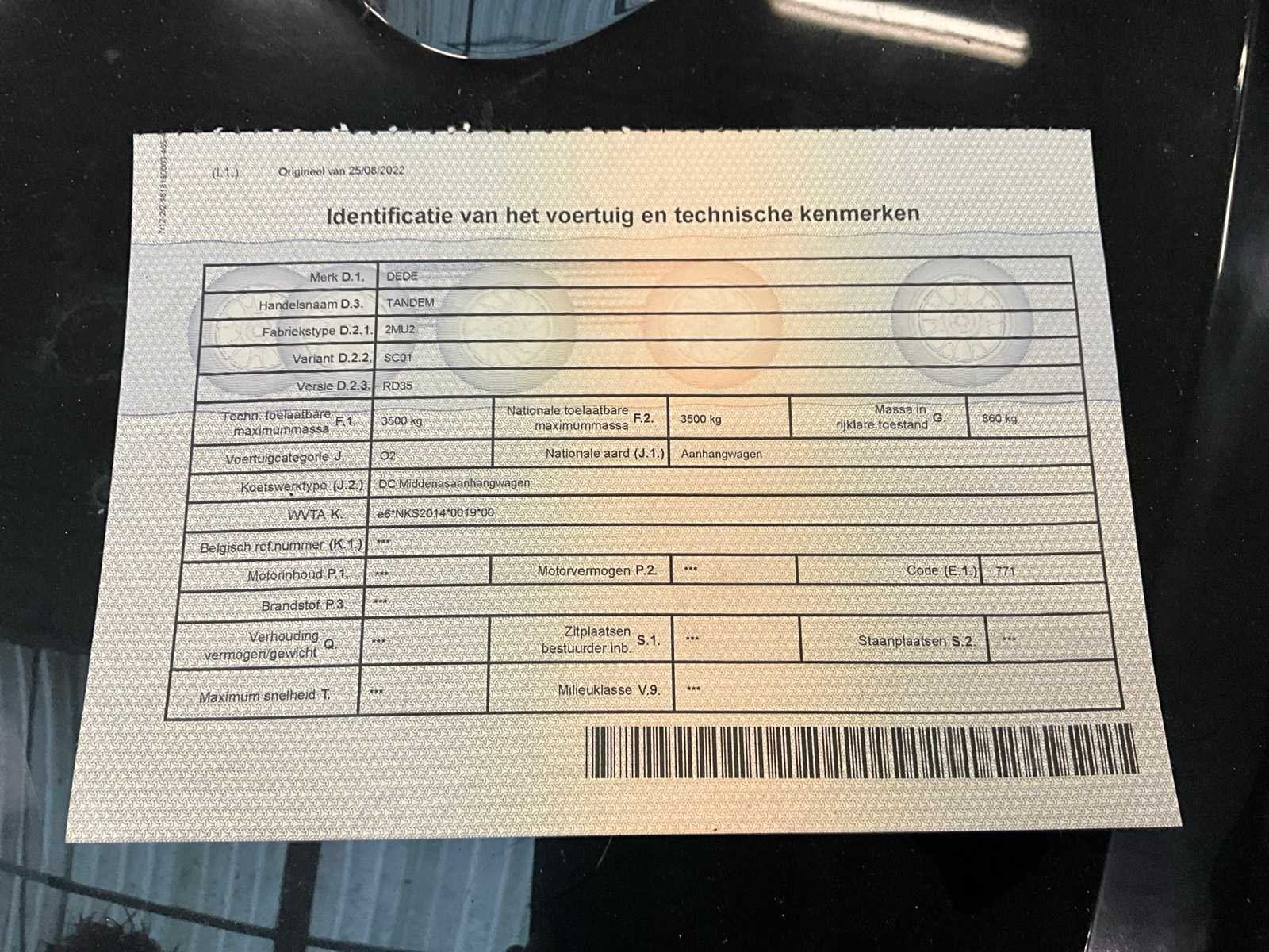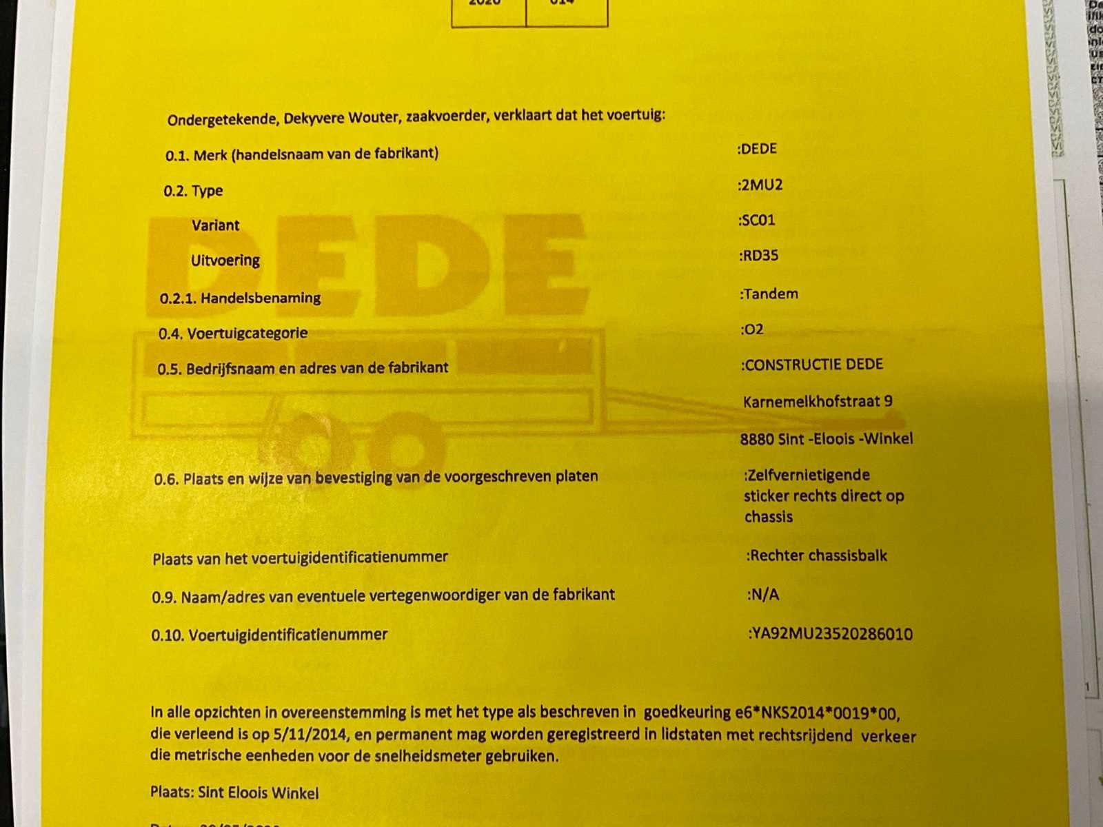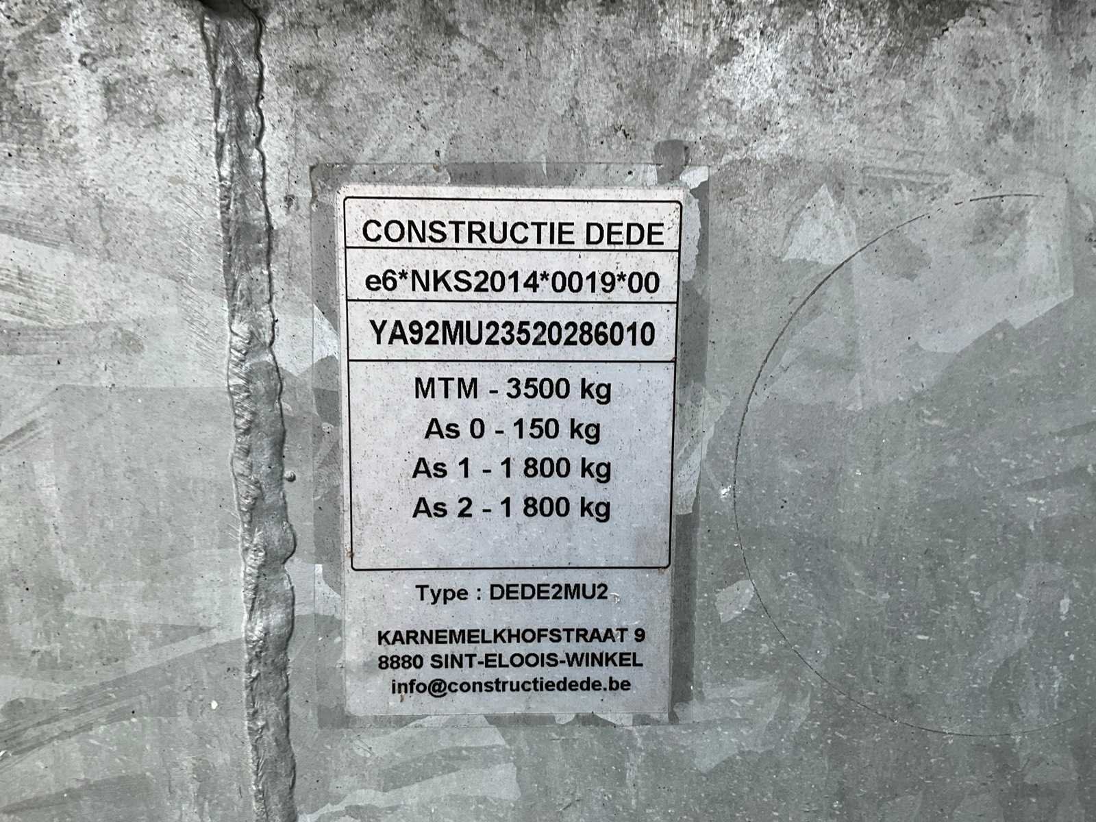 No Merk: Dede Type: Tandem Bouwjaar: 2020 Chassisnummer: YA92MU23520286010 Laadbak afmeting l: 560cm Laadbak afmeting b: 250cm Ledig gewicht: 860kg Laadvermogen: 2640kg Datum eerste toelating: 4/6/2020 Kentekenpapieren compleet?: true Lengte: 560cm Breedte: 250cm Nationaliteit documenten: België