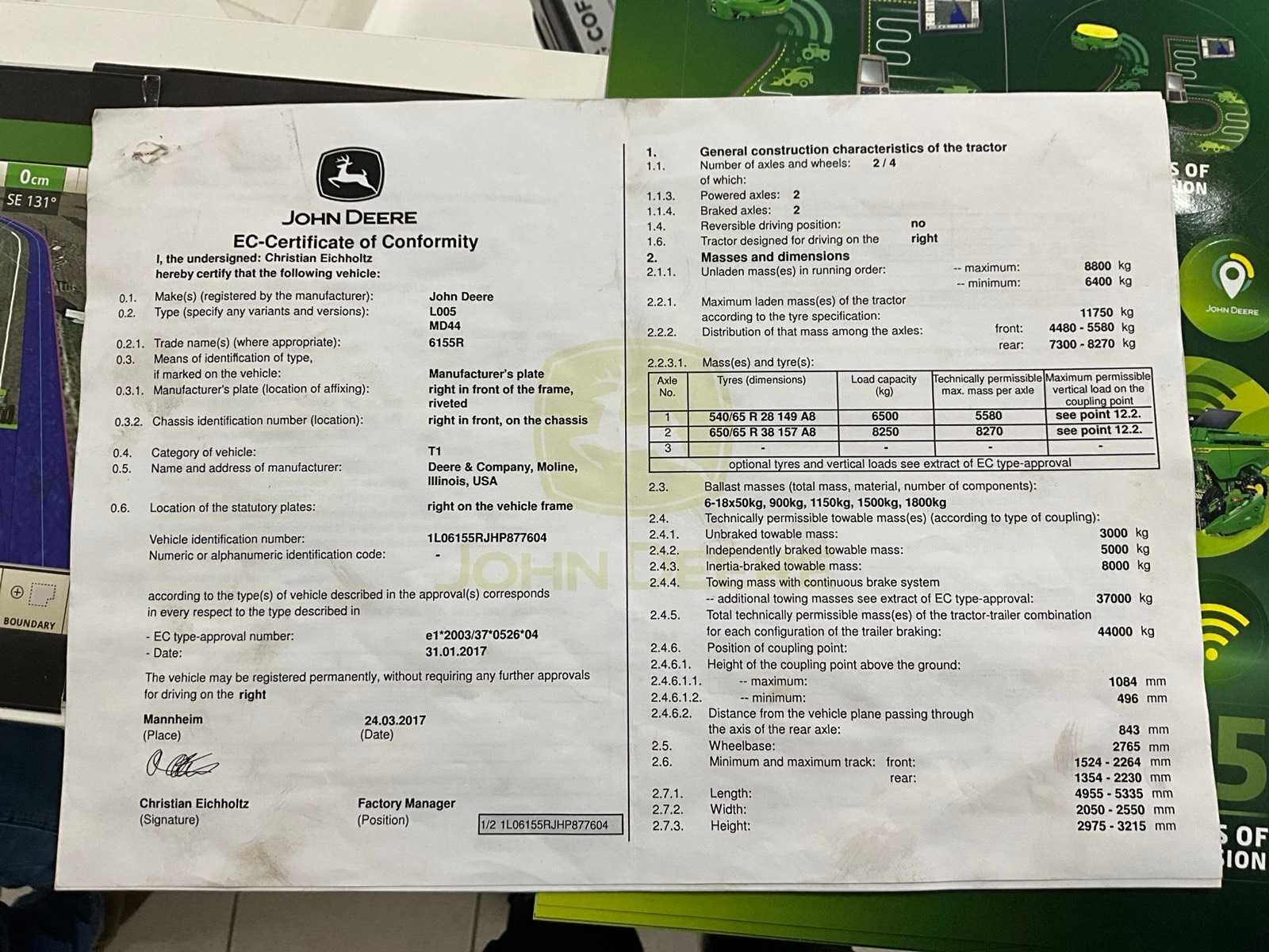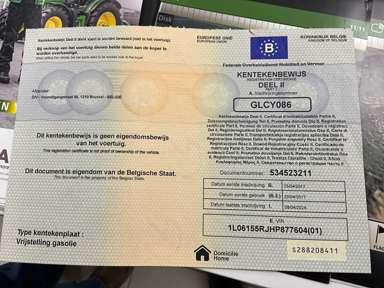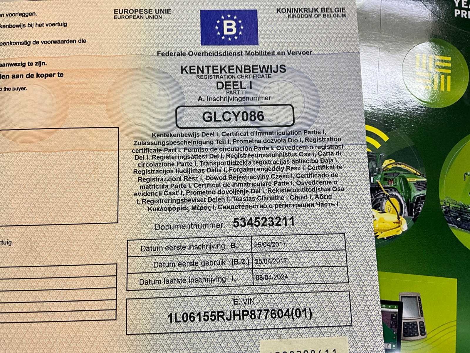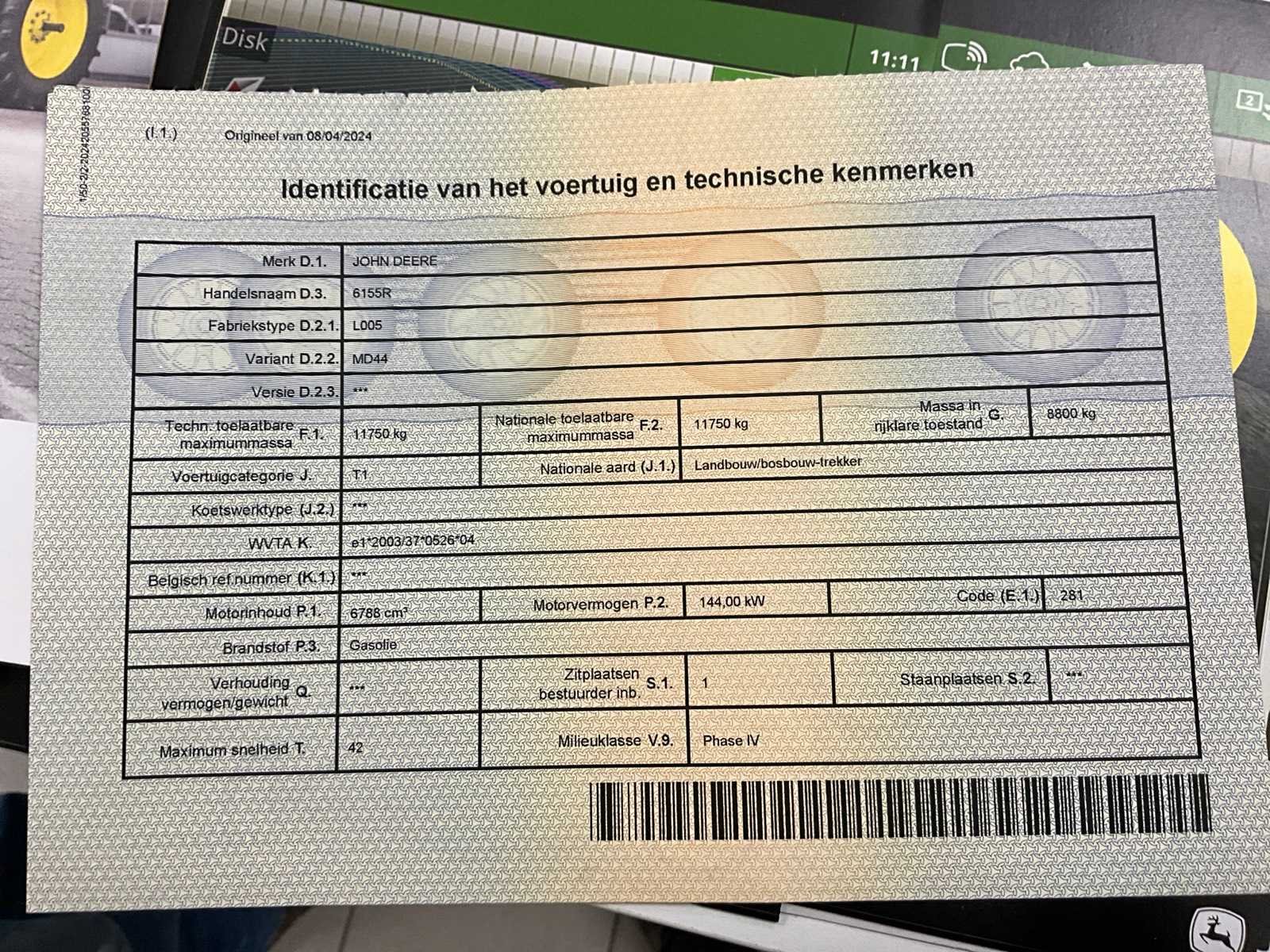 Banden aan vervanging toe, met front PTO No Merk: John Deere Type: 6155R Bouwjaar: 2017 Serienummer: 1L06155RJHP877604 Motorvermogen (kW): 144kW Afgelezen urenstand: 7355 Versnellingsbaktype: AutoPowr Fronthefinrichting: true Frontaftakas: true Cabine: true Kentekenpapieren compleet?: true Chassisnummer: 1L06155RJHP877604 Datum eerste toelating: 25/4/2017 Nationaliteit documenten: België