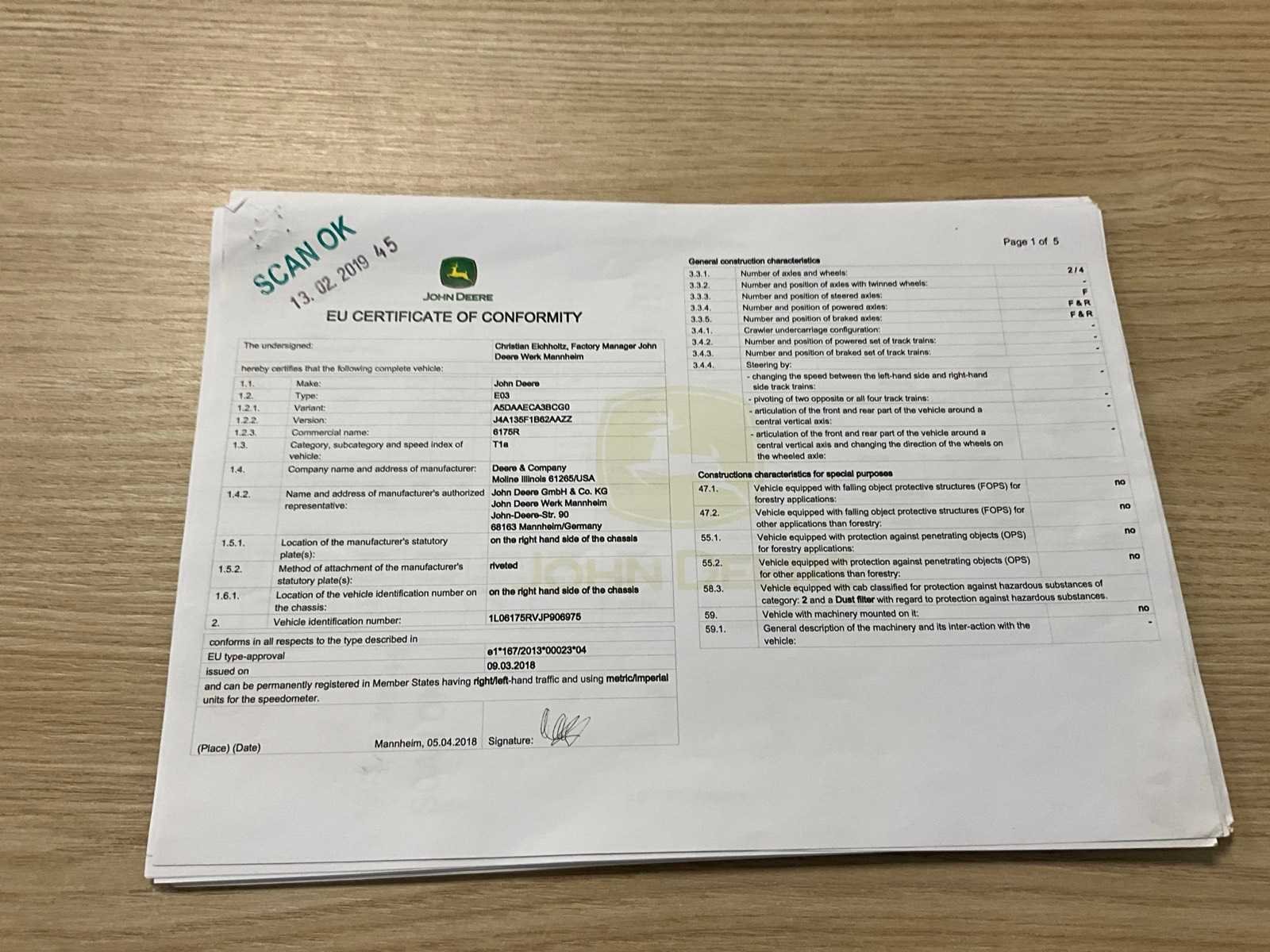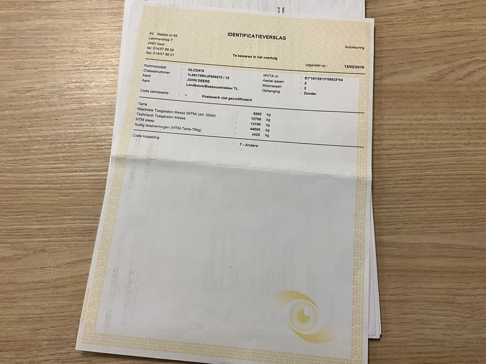 Aanwezige documenten: Kentekenbewijs deel I, Identificatieverslag, Keuringsbewijs, Gelijkvormigheidsattest. No Merk: John Deere Type: 6175R Bouwjaar: 2018 Serienummer: 1L06175RVJP906975 Motorvermogen (kW): 164kW Afgelezen urenstand: 3900 Versnellingsbaktype: AutoPowr Bandenmaat voor: 600/60 R30 Bandenmaat achter: 710/60 R42 Fronthefinrichting: true Frontaftakas: true Cabine: true Eigen gewicht: 9200kg Totale afmeting L: 5000mm Totale afmeting Breedte: 2550mm Totale afmeting Hoogte: 3000mm Chassisnummer: 1L06175RVJP906975 Datum eerste toelating: 26/4/2018 Nationaliteit documenten: België
