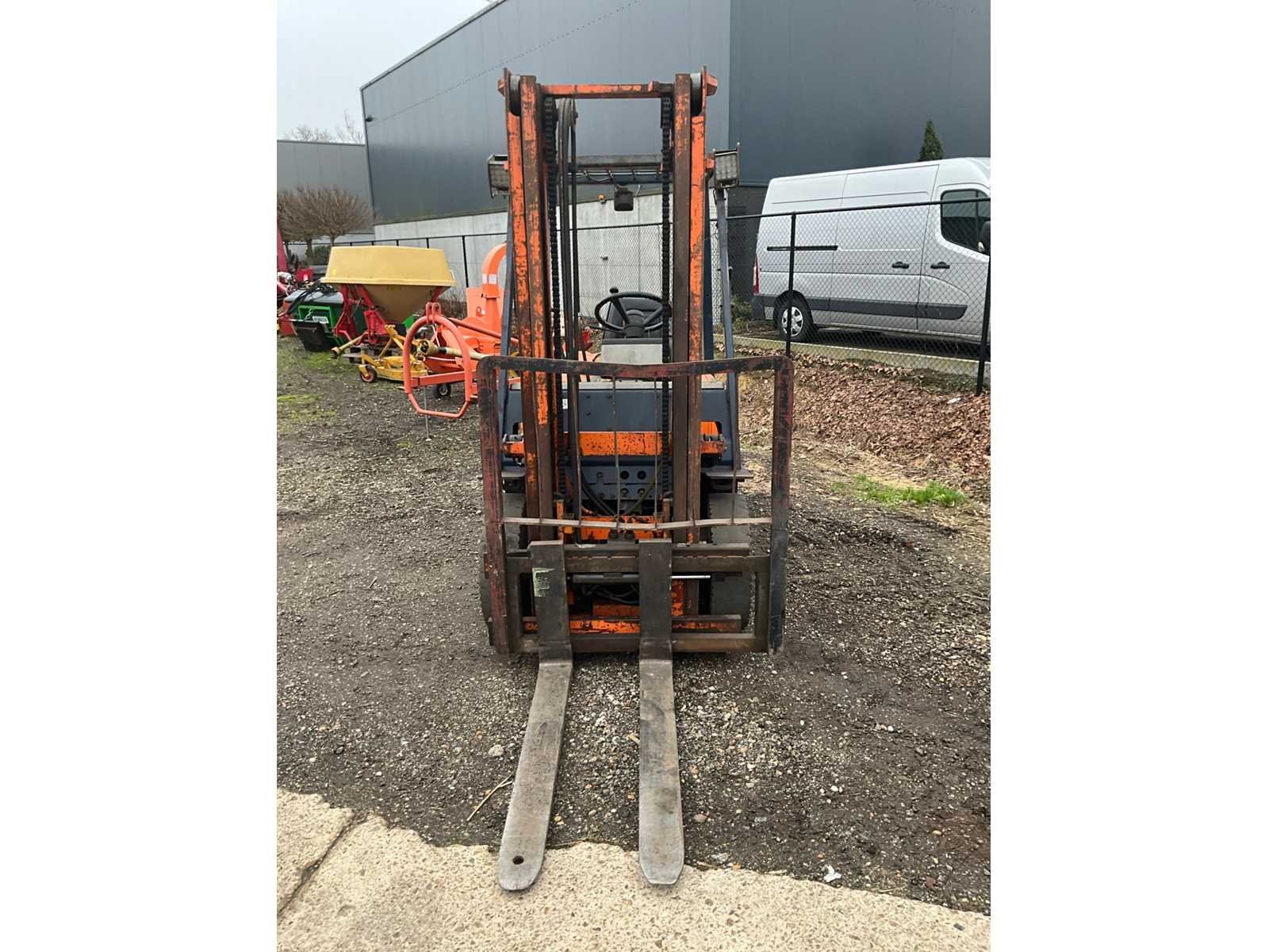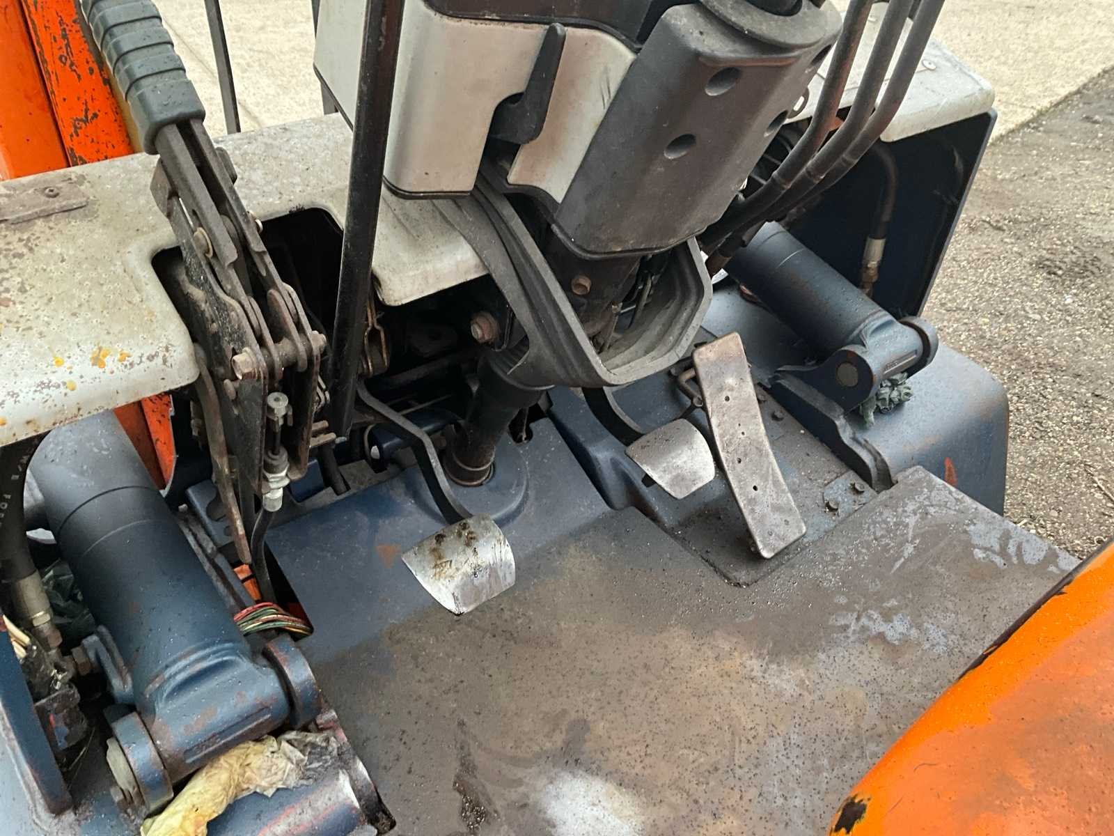 No Merk: Toyota Type: 02 5FDF 25 Bouwjaar: 1991 Serienummer: 5FDF25 41362 Afgelezen urenstand: 8243 Duplex mast: true Eigen gewicht: 3995kg Hefvermogen: 2500kg Lepellengte: 1100mm Max. hefhoogte: 3500mm Vol rubber banden: true Minimale doorrijhoogte: 2150mm Diesel: true