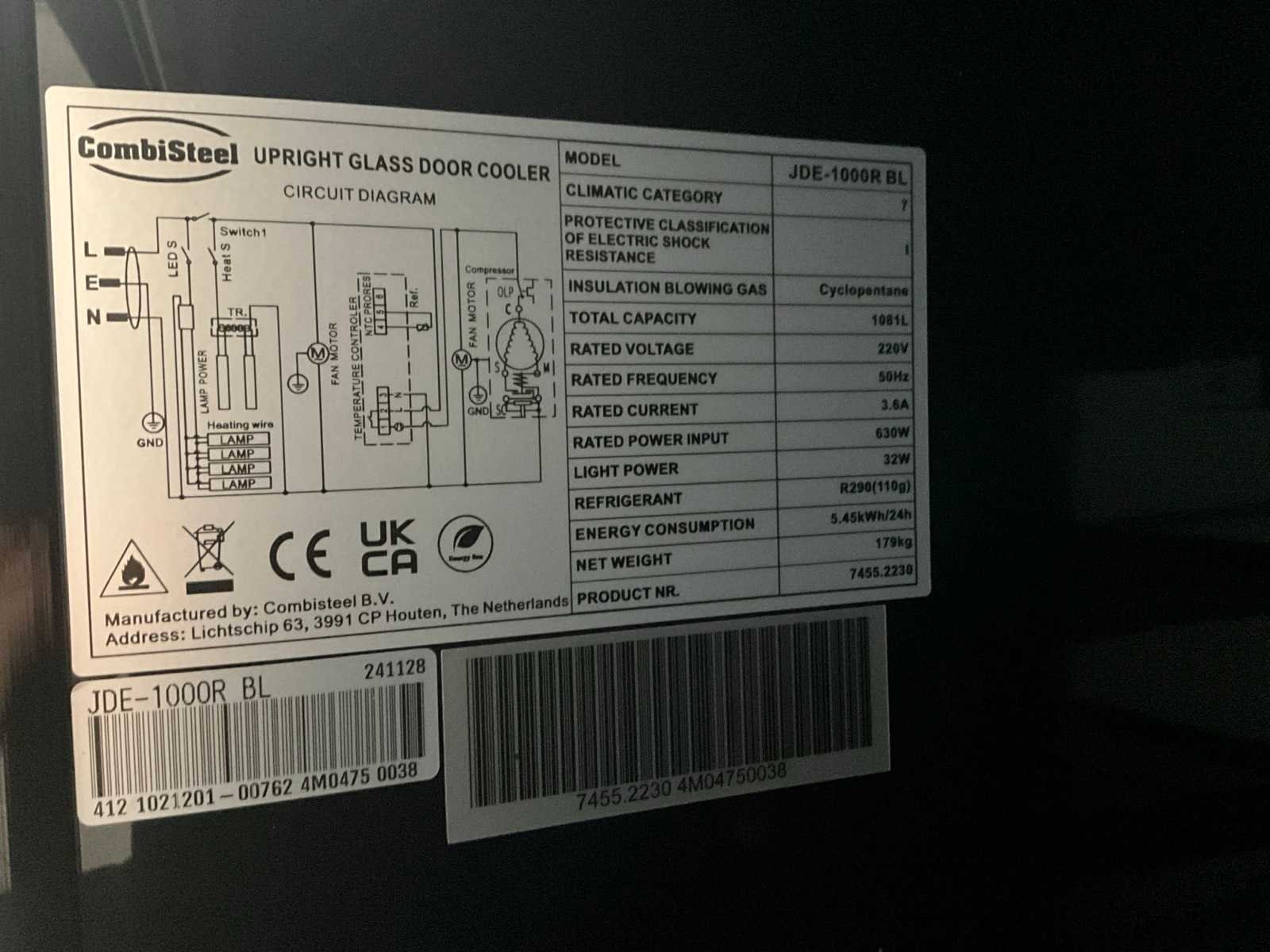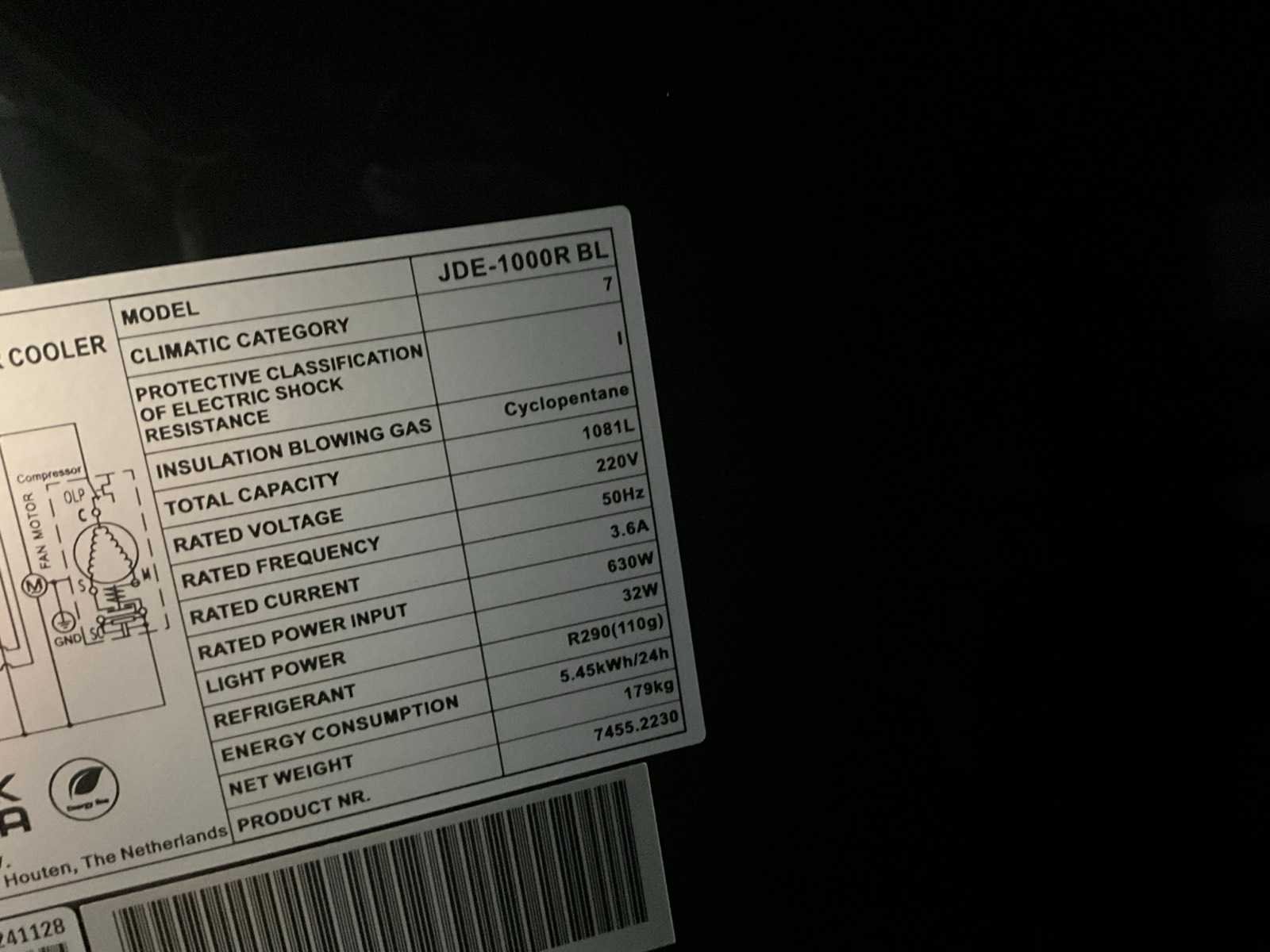 Compleet met koelunit. Nee Merk: Combisteel Type: JDE-1000R BL Aansluiting: 230V Capaciteit.: 1081l Totale afmeting L: 70cm Totale afmeting Breedte: 136cm Totale afmeting Hoogte: 200cm