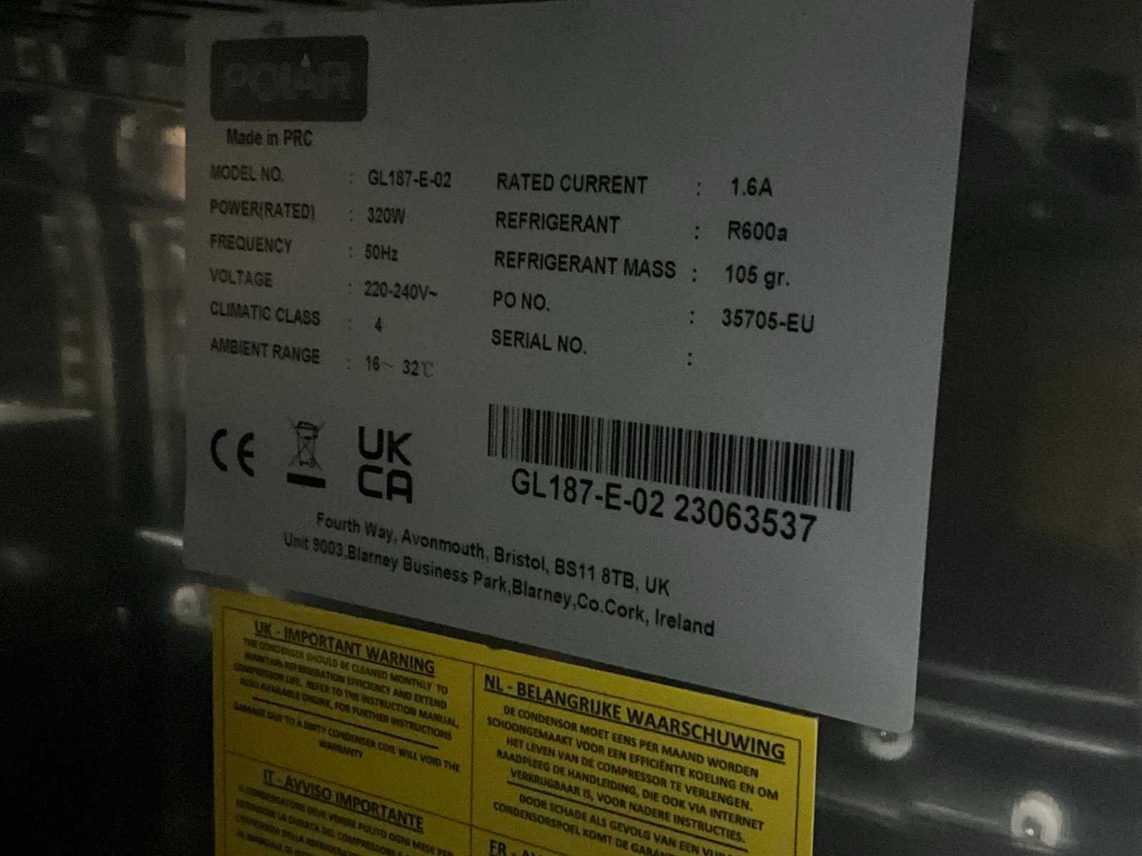Nee Merk: Polar Type: GL187-E-02 Aansluiting: 230V Totale afmeting L: 510mm Totale afmeting Breedte: 2000mm Totale afmeting Hoogte: 850mm