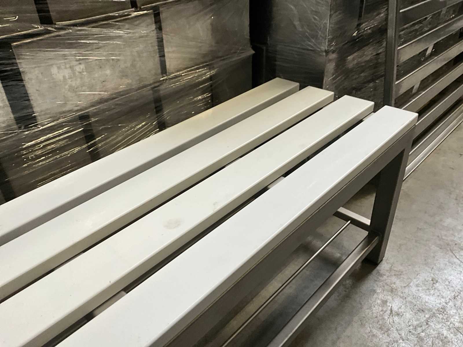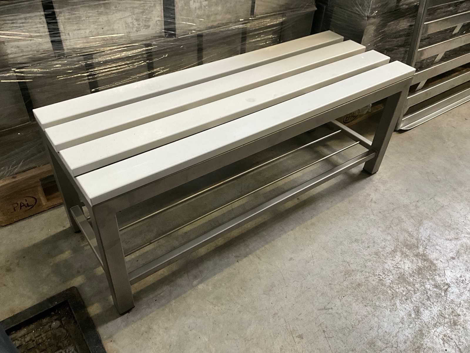 Nee Lengte: 35cm Breedte: 100cm Hoogte: 40cm Materiaal: Metaal, kunststof zitting