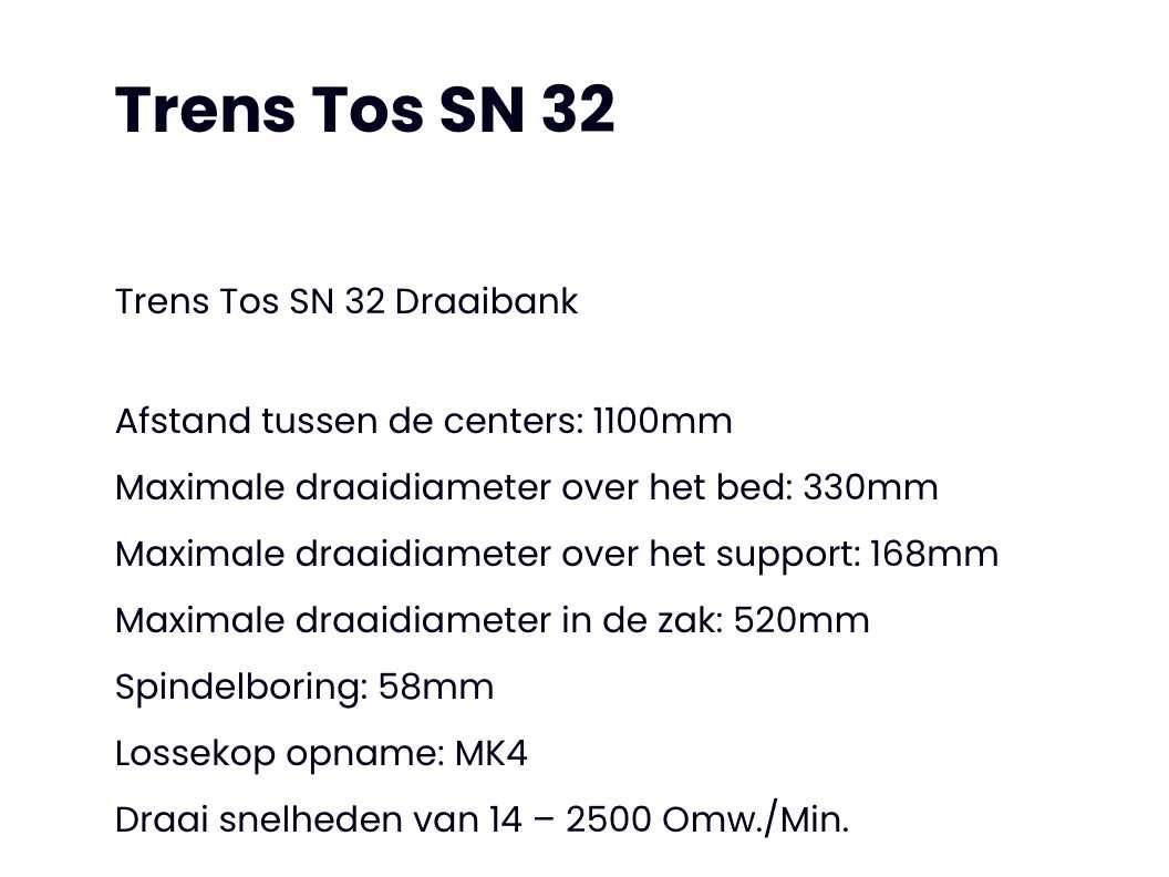 Inclusief kast met divers toebehoren Nee Merk: Trens Type: SN 32 Serienummer: 62 Draailengte: 1100mm Aantal snelheden: 16 Snelheid van n =: 14rpm Snelheid tot n =: 2500rpm Koelmiddelpomp: true Aansluiting: 400V Machinegewicht: 1650kg Afmeting l: 1100mm Afmeting b: 2650mm Afmeting h: 1460mm