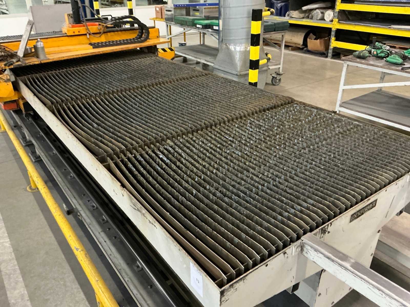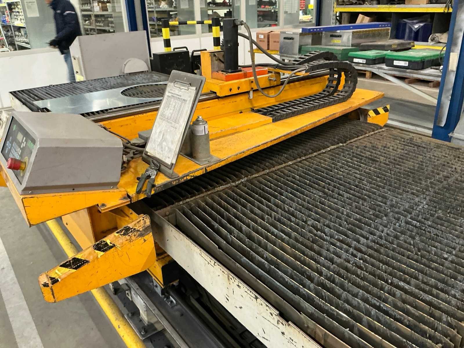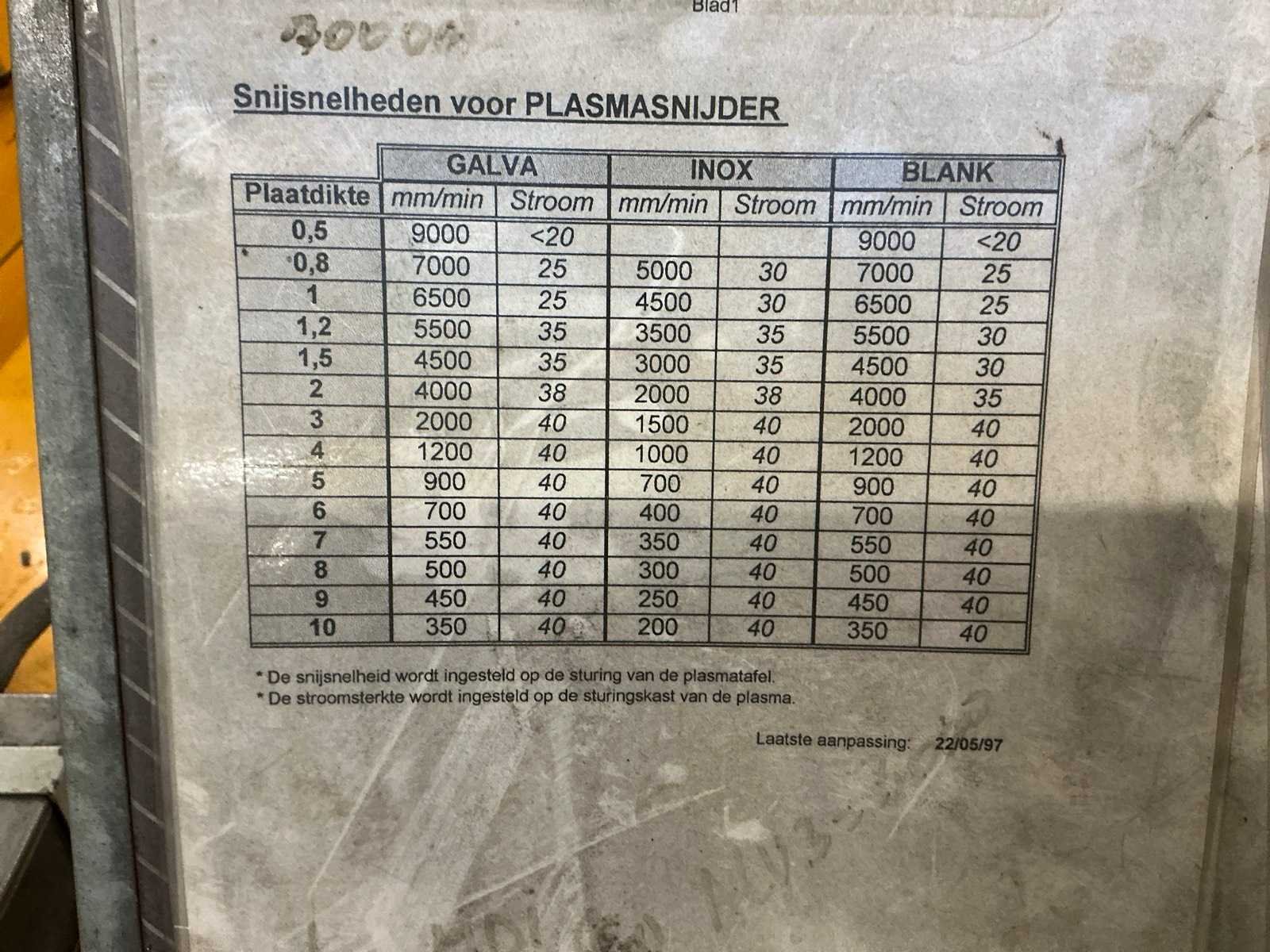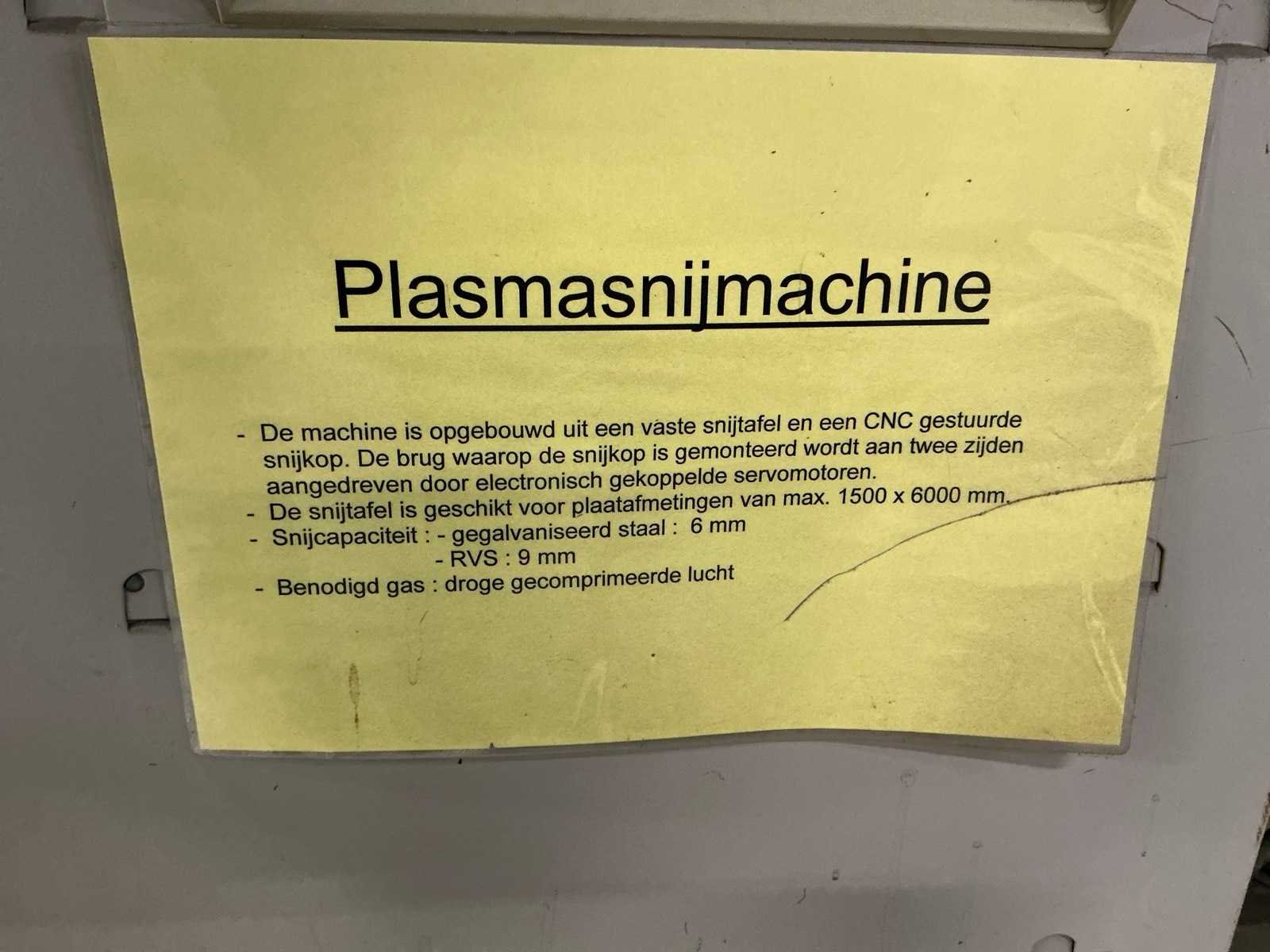 Met afzuigmotor en luchtkanalen, (afzuigmotor bevindt zich op het dak) Nee Merk: Lockformer Type: Vulcan 2900 Snijbereik: 1500x6000mm Merk en type plasma-unit: Hypertherm Powermax 1000 Ampère belasting: 60A Max. snijdikte: 10mm Aansluiting: 400V Afmeting l: 8000mm Afmeting b: 2400mm Afmeting h: 1500mm