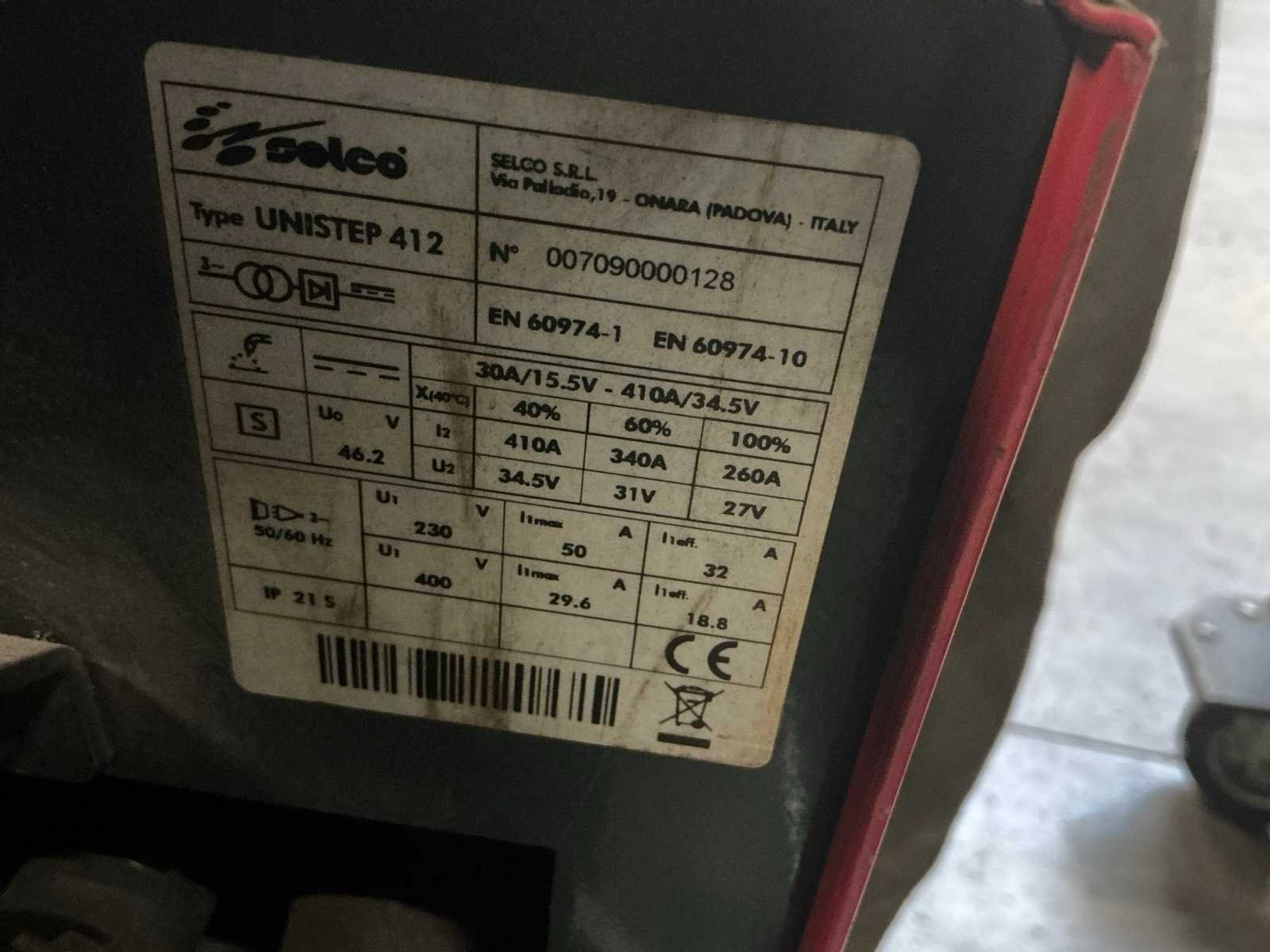<Br> - 30A/15,5V - 410A/34,5V. - Selco WF106 draadaanvoerunit. - Koelunit. - Met aardingsklem en Mig-lastoorts. Nee Merk: Selco Type: Unistep 412 Aansluiting: 400V Draadaanvoerunit: true