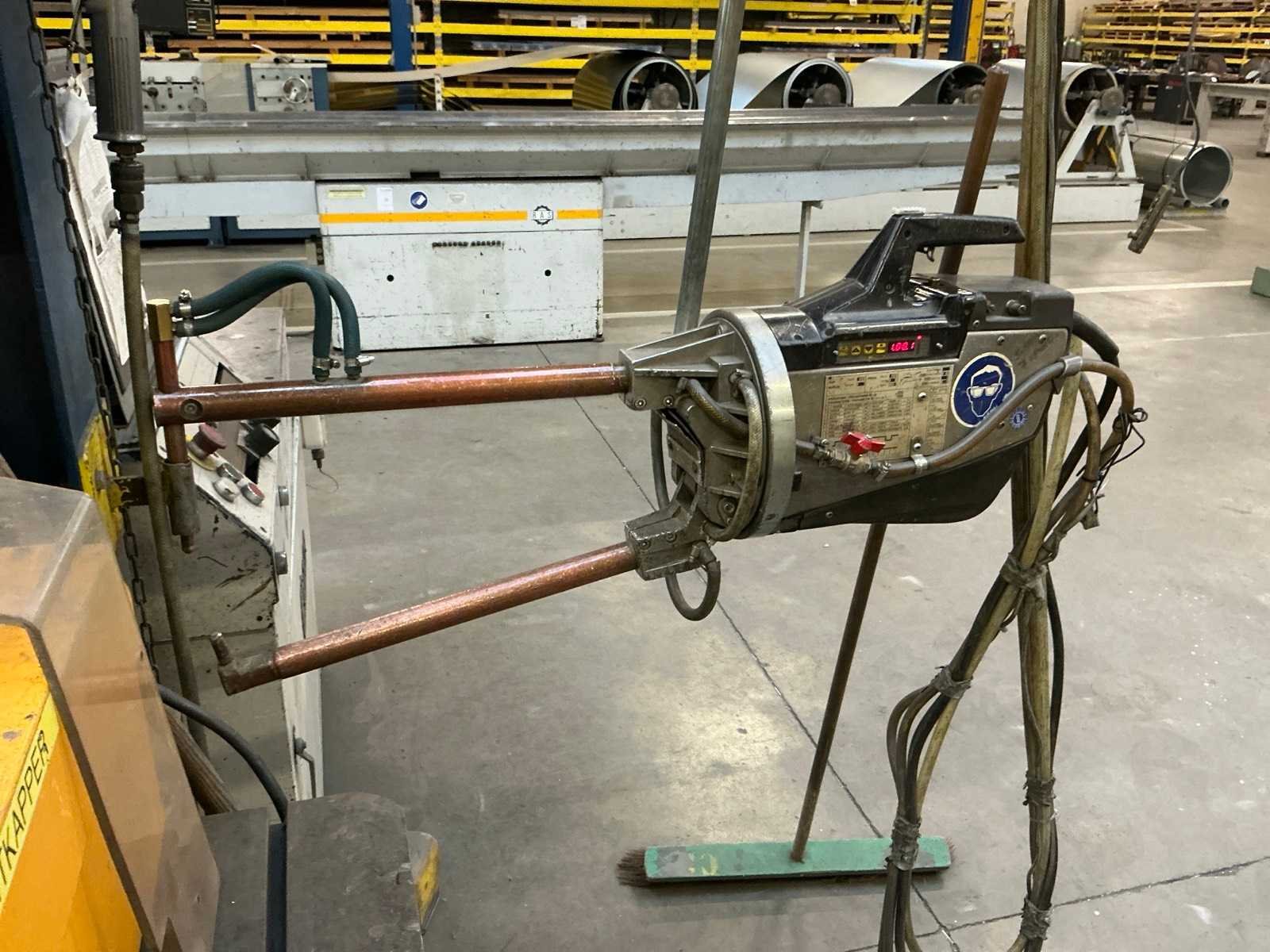 Hangend aan zwenkarm op circa 4m hoogte, inclusief zwenkarm Nee Merk: Tecna Type: 3302 Bouwjaar: 1995 Serienummer: 86 Nominale vermogen: 23kVA Max. lasvermogen: 60.8kVA Digitale uitlezing: true Aansluiting: 400V