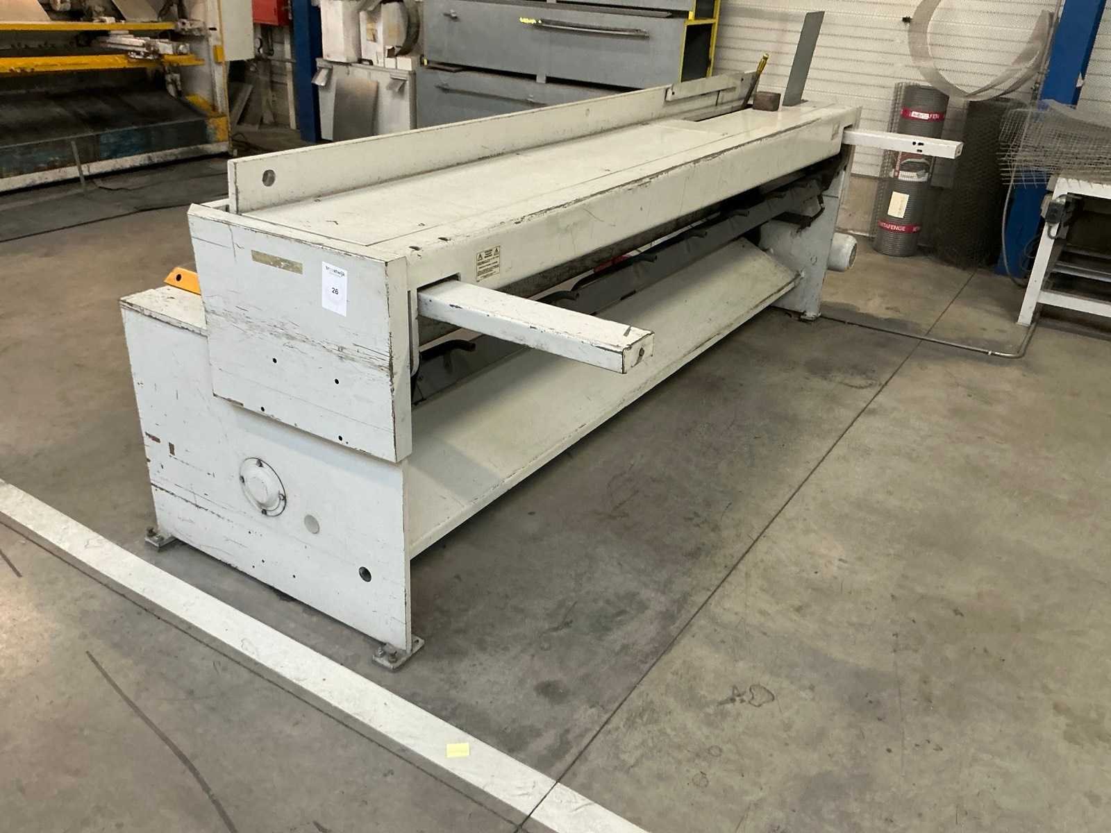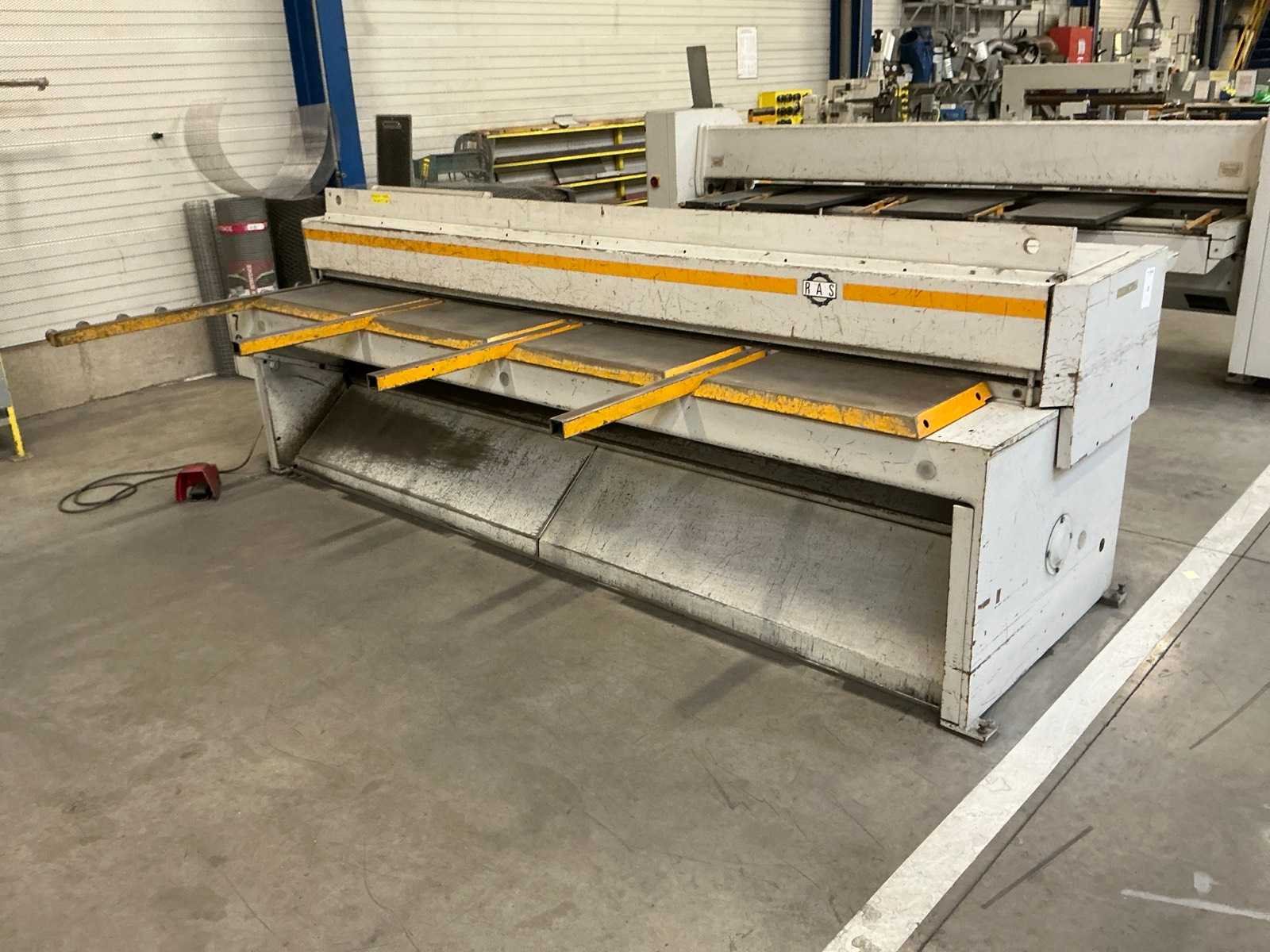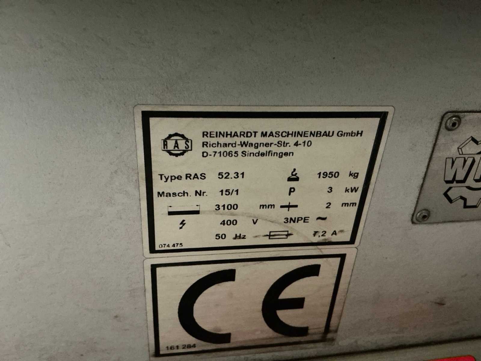 Maximum werkbreedte 3100mm Nee Merk: RAS Type: 52.31 Serienummer: 15/1 Max. plaatdikte: 2mm Motorvermogen (kW): 3kW Aansluiting: 400V Machinegewicht: 1950kg Afmeting l: 2300mm Afmeting b: 3600mm Afmeting h: 1200mm