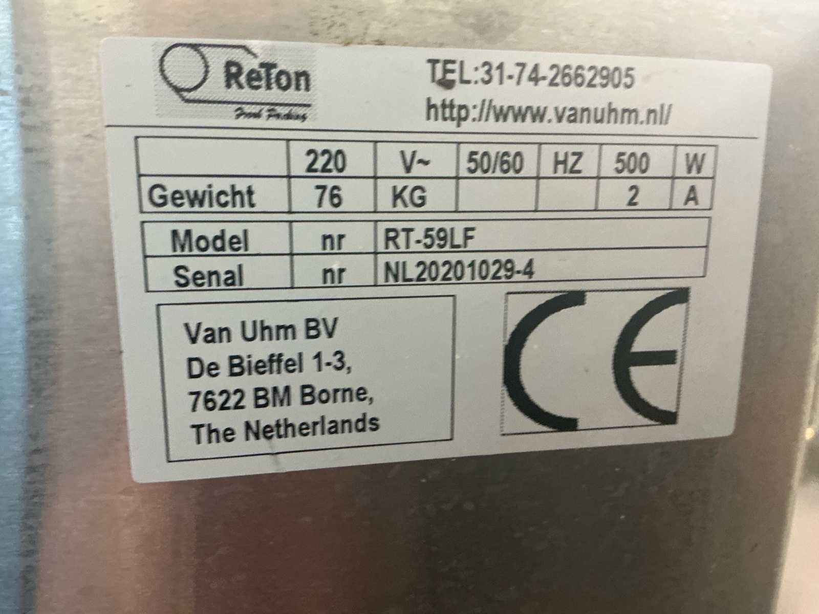Verkoop wegens stopzetting handelszaak. Werkend en goed onderhouden, met extra rollen.Zie bijgevoegde foto’s. Een traysealer (traysealmachine) sluit voedselverpakkingen (trays) met een folie‑deksel door middel van verhitting/druk. De machines kunnen vaak ook werken met vacuum + gas (MAP) voor langere houdbaarheid.  Typische toepassingen: • Vlees en vleeswaren • Vis en seafood • Kant‑en‑klaar maaltijden • Kaas en AGF‑pro No Merk: RETON Model: RT-59LF Product type: Trayseal Kleur: Inox kleur Gewicht: 50kg Lengte: 350cm Breedte: 500cm Hoogte: 820cm