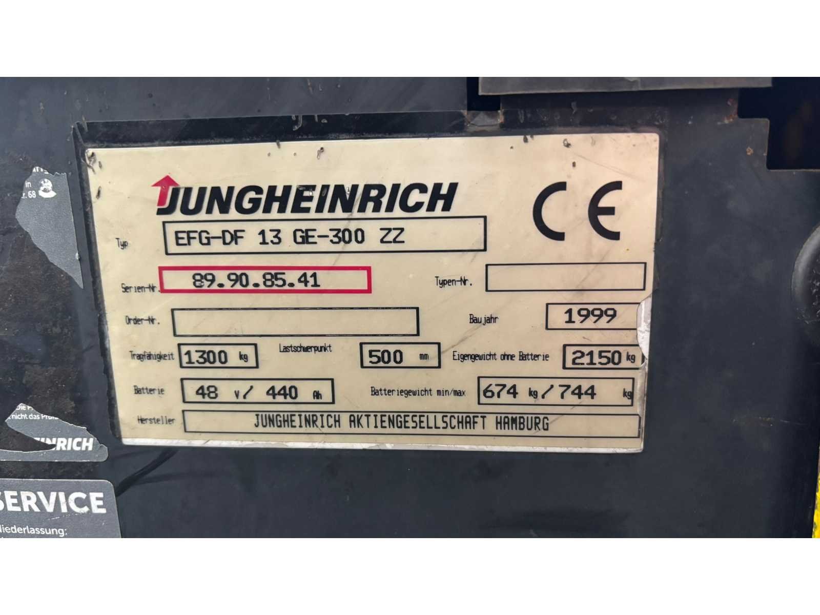Hefvermogen 1300 KG - Afgelezen uren 2152 - Zeer mooie en weinig gebruikte Machine - goede batterij 48 volt 440 Ampère - direct inzetbaar/functioneel Nee Merk: JUNGHEINRICH Type: EFG-DF. 13. GE-300. ZZ Bouwjaar: 1999 Serienummer: 89.90.85.41 Brandstof: Elektrisch Kenteken: Geen Afgelezen urenstand: 2152 Side-shift: true Duplex mast: true Eigen gewicht: 2150kg Hefvermogen: 1300kg Lepellengte: 1000mm Max. hefhoogte: 3000mm Vol rubber banden: true Leveringsvoorwaarden: Niet gefundeerd - onverpakt