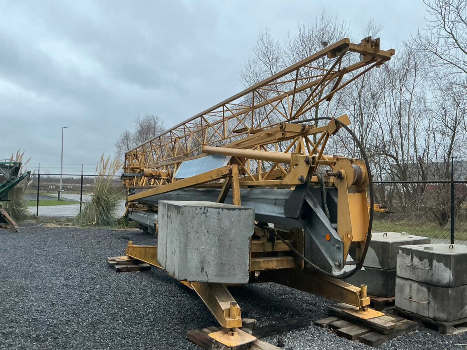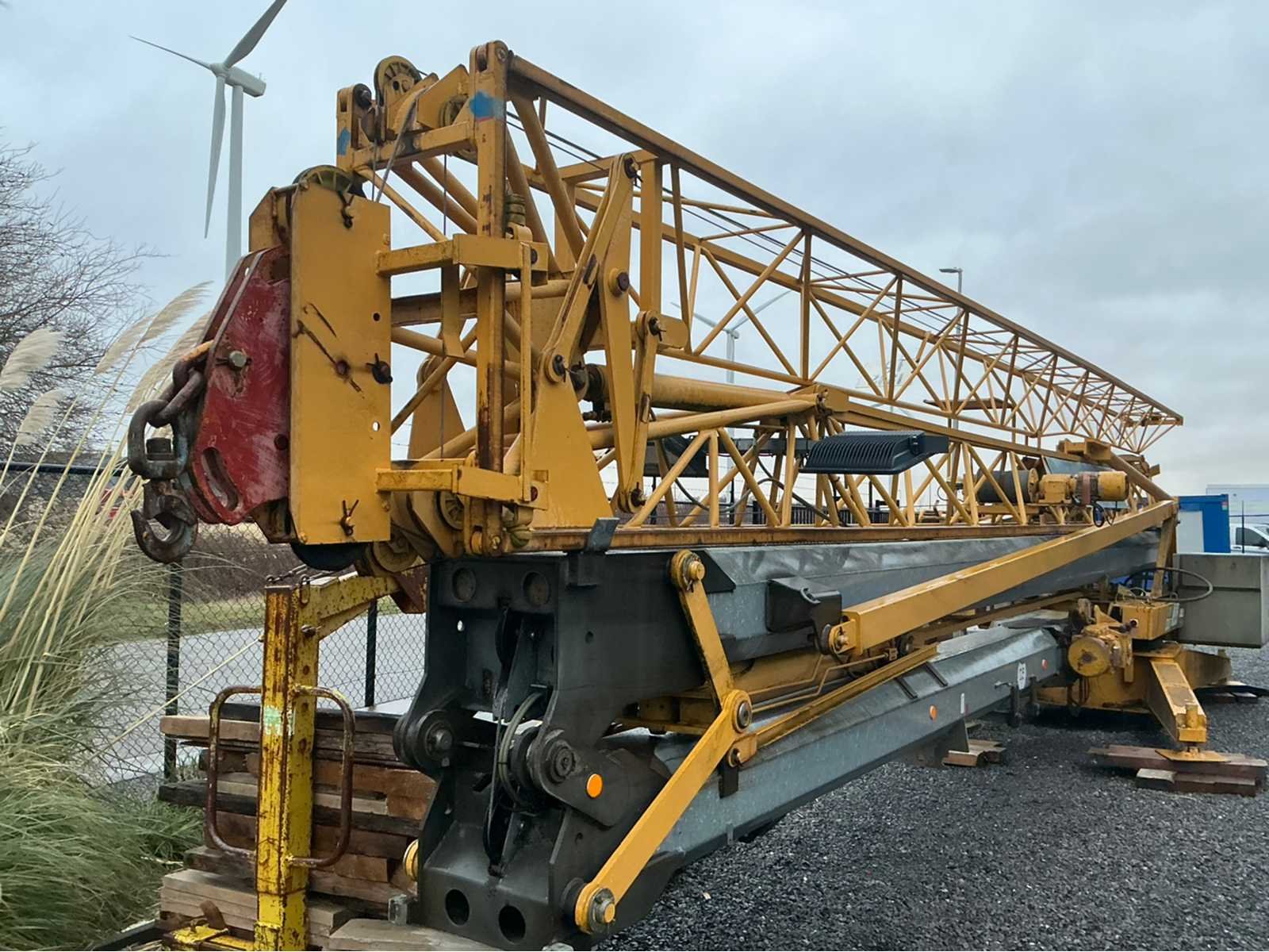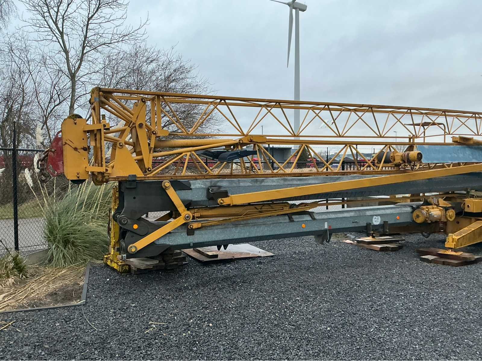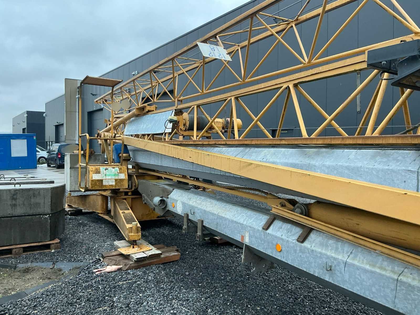 Laatste keuring einde 2025 (zie laatste foto) en in functionele staat mobiele zelfoprichtende torenkraan met horizontale vakwerkgiek, uitgevoerd zonder wegtransportwielen en bedoeld voor opstelling op terrein of fundatie. Telkens gekeurd voor nieuwe opstelling werf. Fabrikant: niet met zekerheid vast te stellen (waarschijnlijk Duits/Frans) Dealer/service: Baumaschinen Grünhage (D)Type: oudere stationaire torenkraan met horizontale giek. Max. hijslast: ca. 1000 kg ,Keuring: SGS (BE) Lastentabel: Stand Last A 500 kg (≈ 9,85 cwt), B 1000 kg (≈ 19,7 cwt), C 400 kg (≈ 7,9 cwt). Hoogte 20m, lengte: 25m, gewicht op mast 25m = 800kg, 2500kg op 10 m. Met afstandsbediening. Nee Merk: Potain Type: HD 21A Met afstandsbediening (bedraad): true